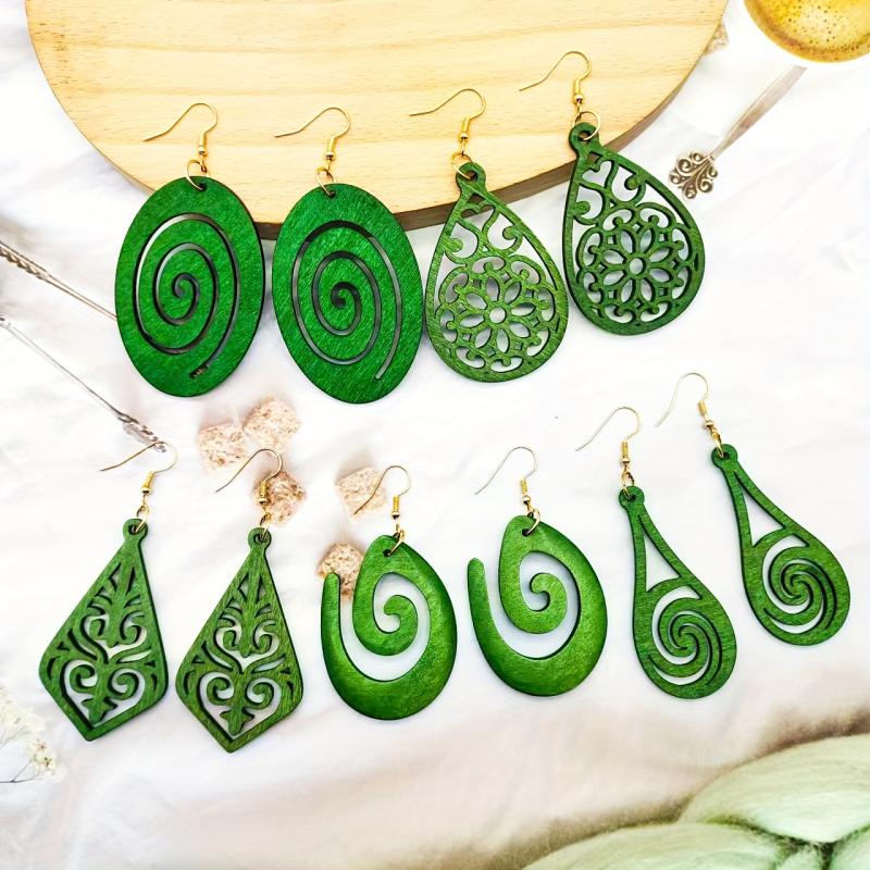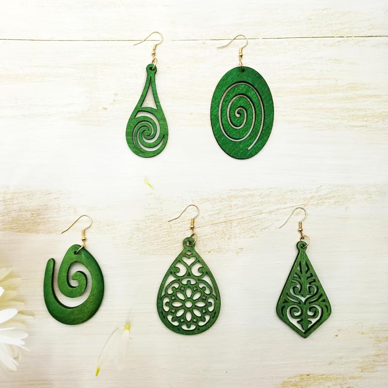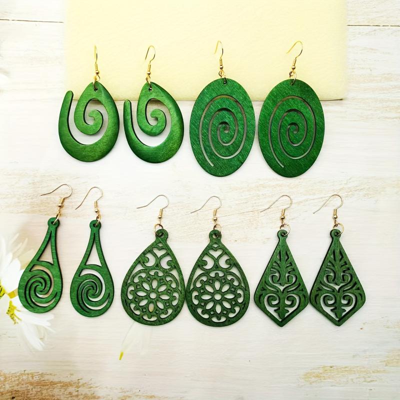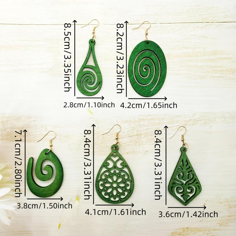 Elevate your style with this set of 5 vintage boho wooden earrings featuring green dangle drops and iron posts. Perfect for daily wear or as a gift for women.