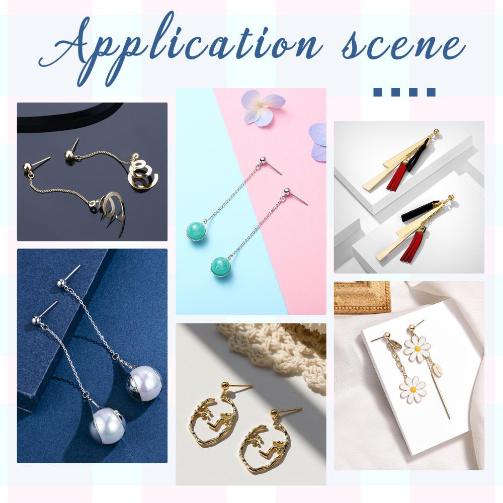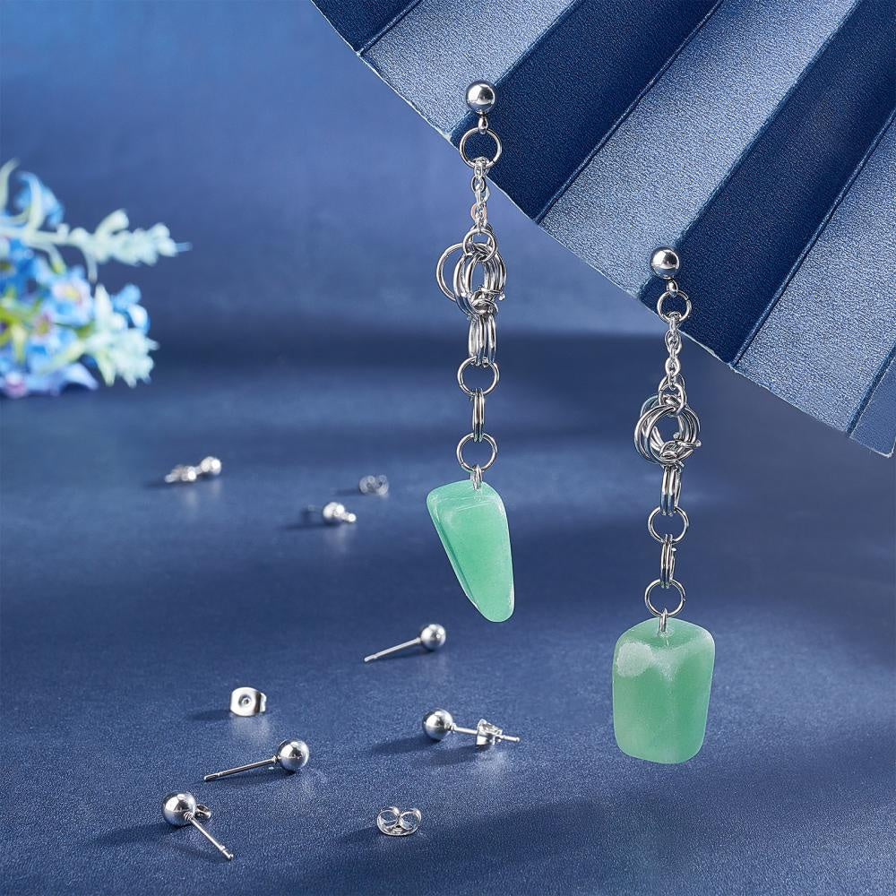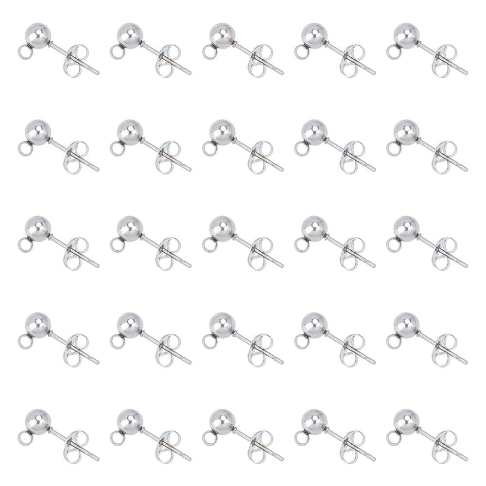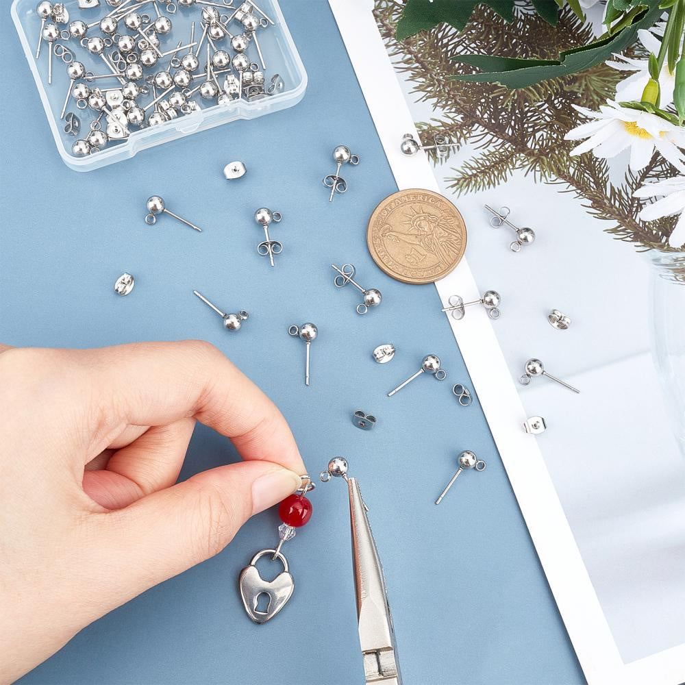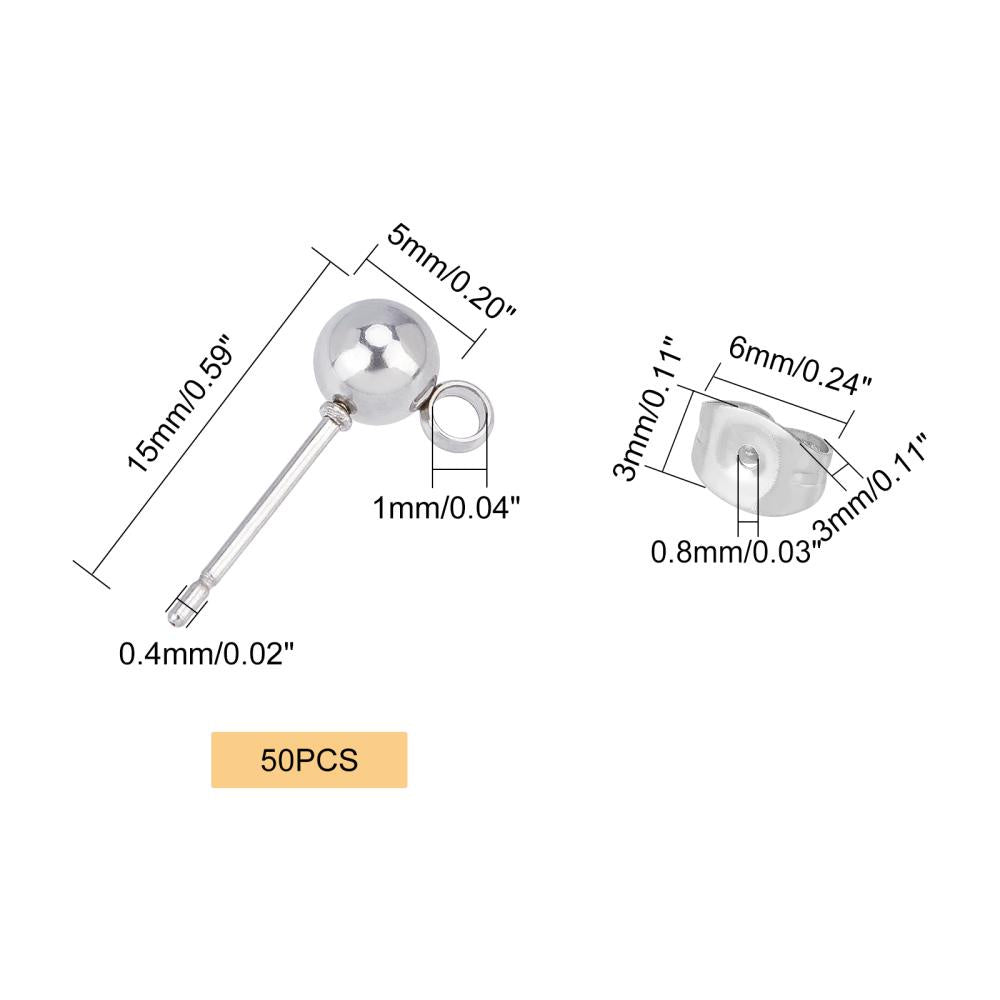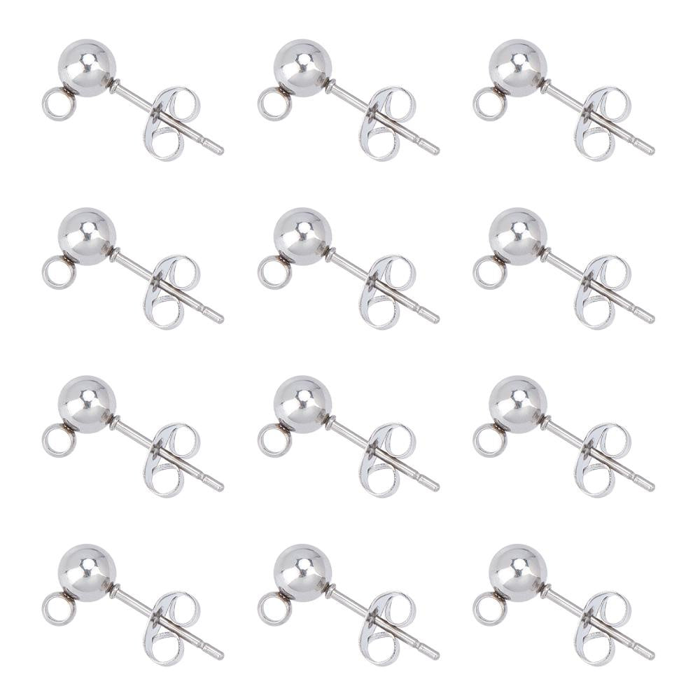 High-quality stainless steel earring posts with loop and ear nut for DIY ear jewelry. Hole size 1mm, pin diameter 0.4mm. Perfect for making your own earrings.