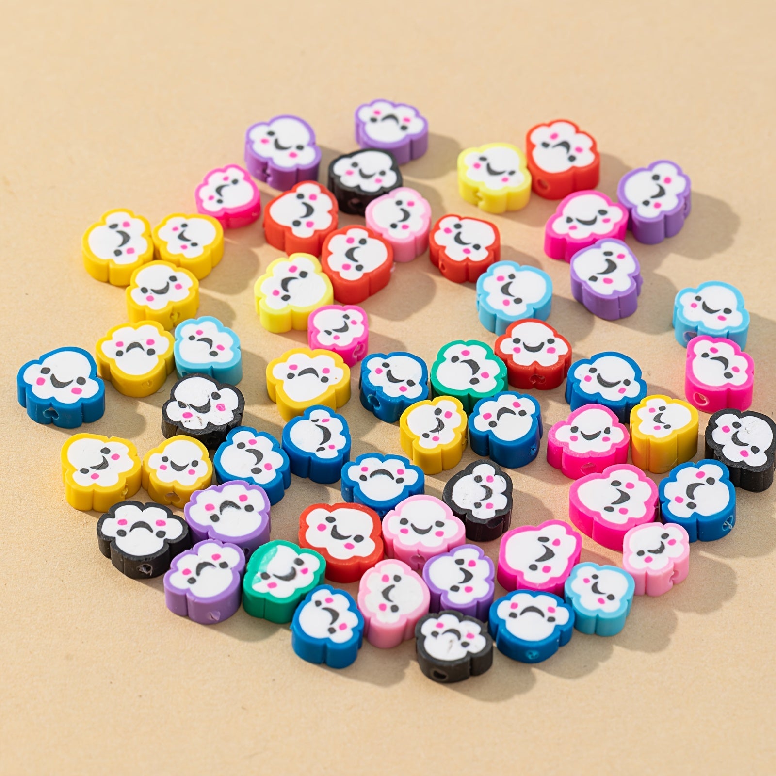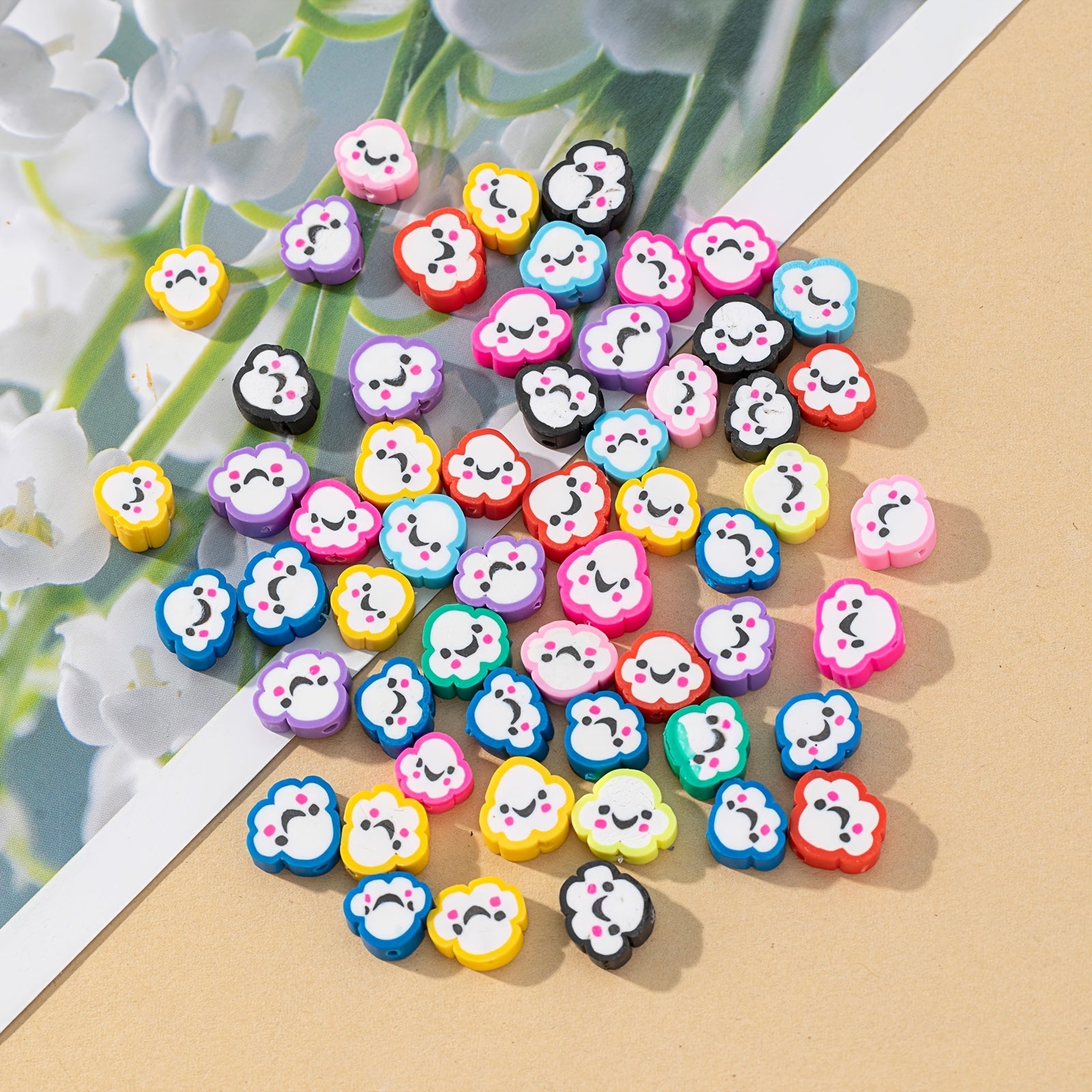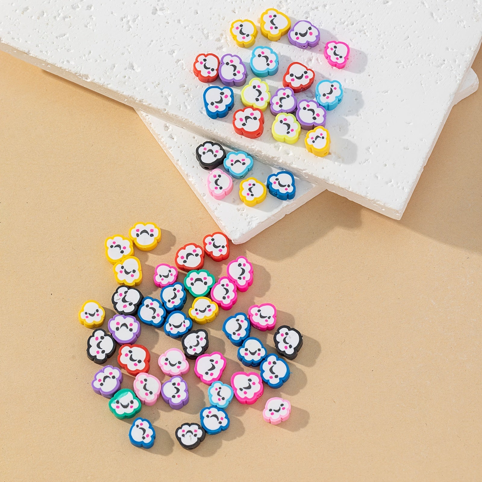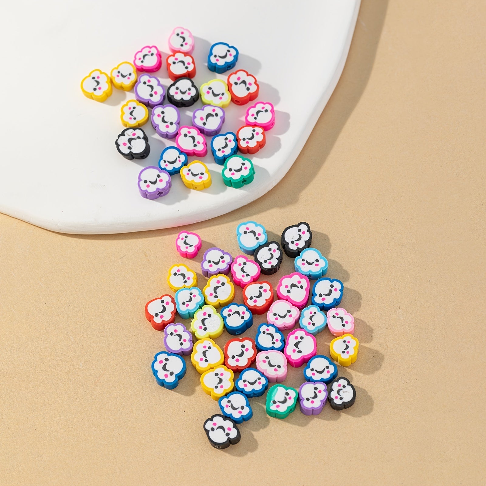 Enhance your DIY jewelry projects with this set of 50 colorful soft pottery beads featuring happy face cloud patterns. These beads are perfect for adding a playful touch to your creations.