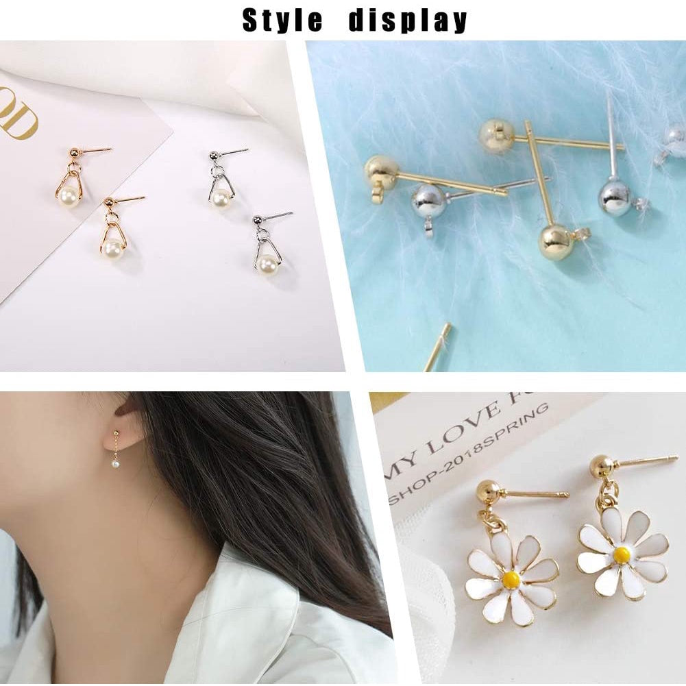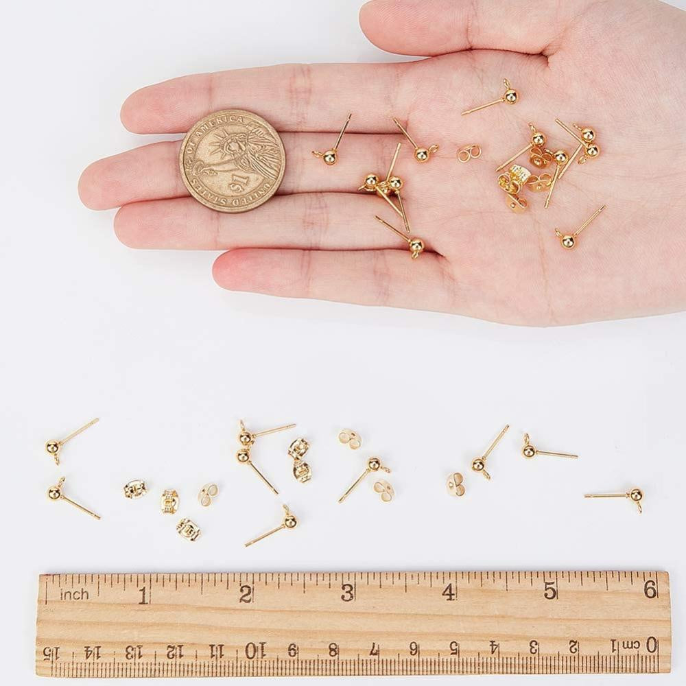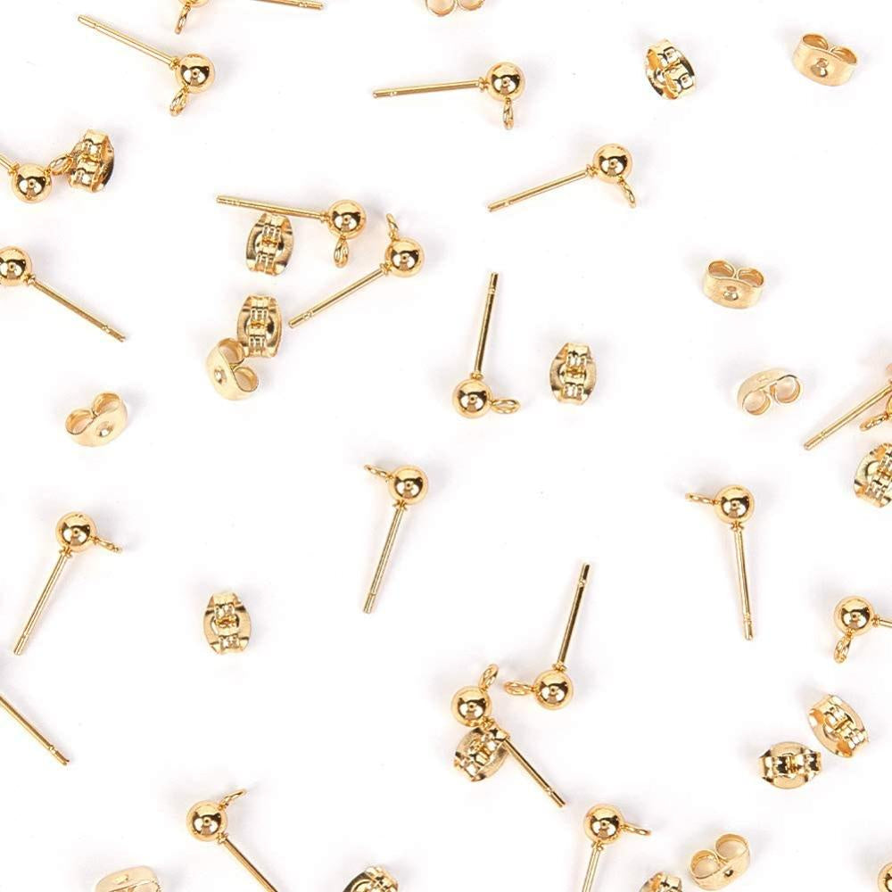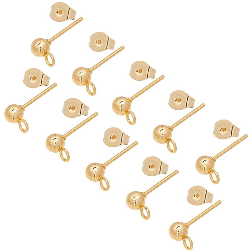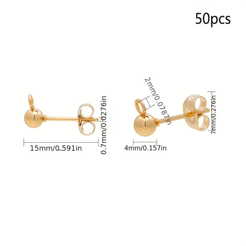 This pack contains 50 pairs of stainless steel stud earrings with a 0.7mm pin ball and loop design. The ear studs are in a golden color and come with ear nuts, making them ideal for creating unique jewelry pieces.