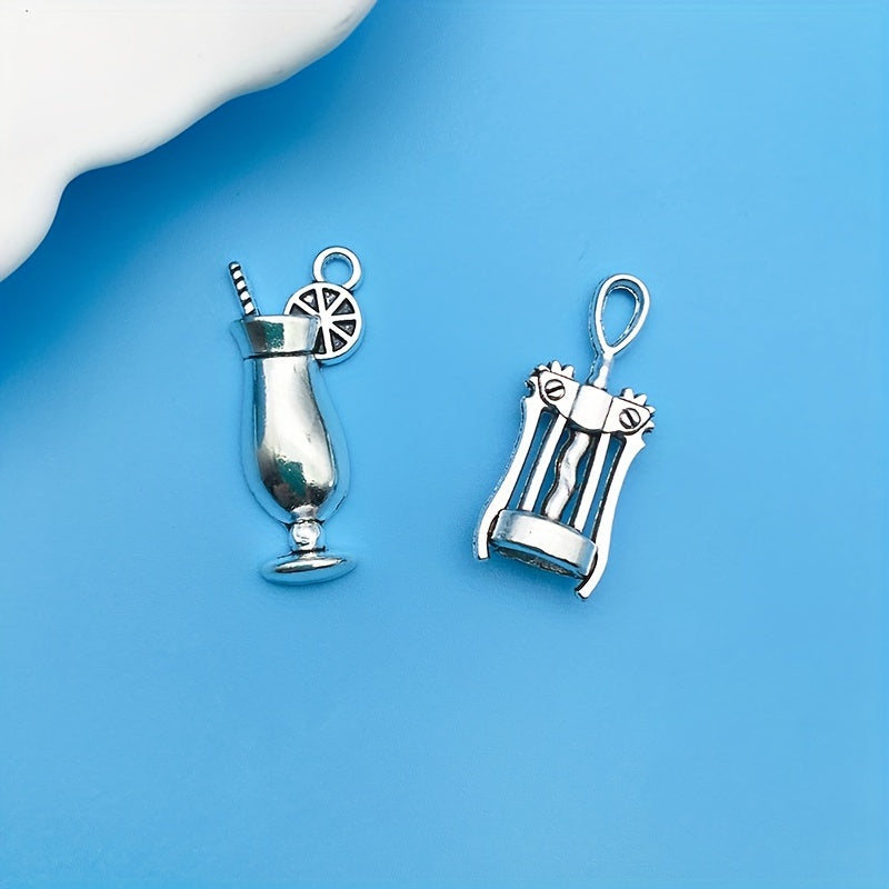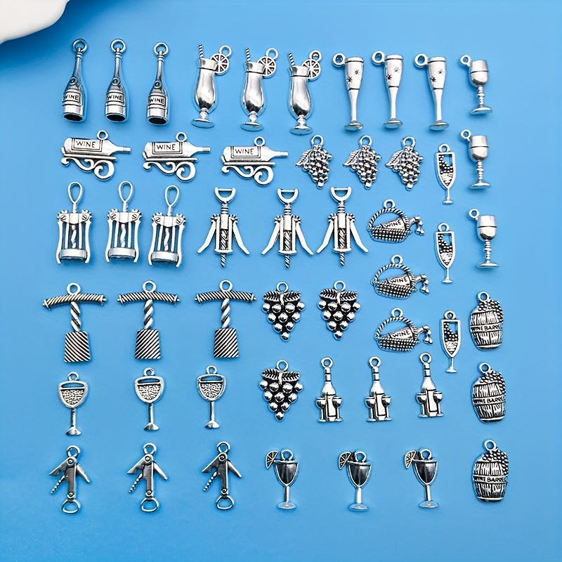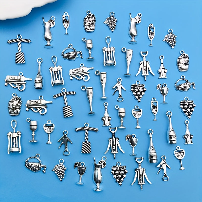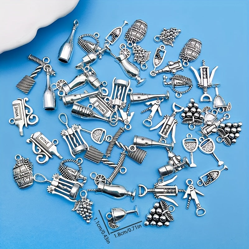 Create stunning jewelry pieces with this set of 51 antique silvery red wine series alloy pendants, including wine glass, wine barrel, corkscrew designs. Ideal for necklaces, bracelets, and earrings.