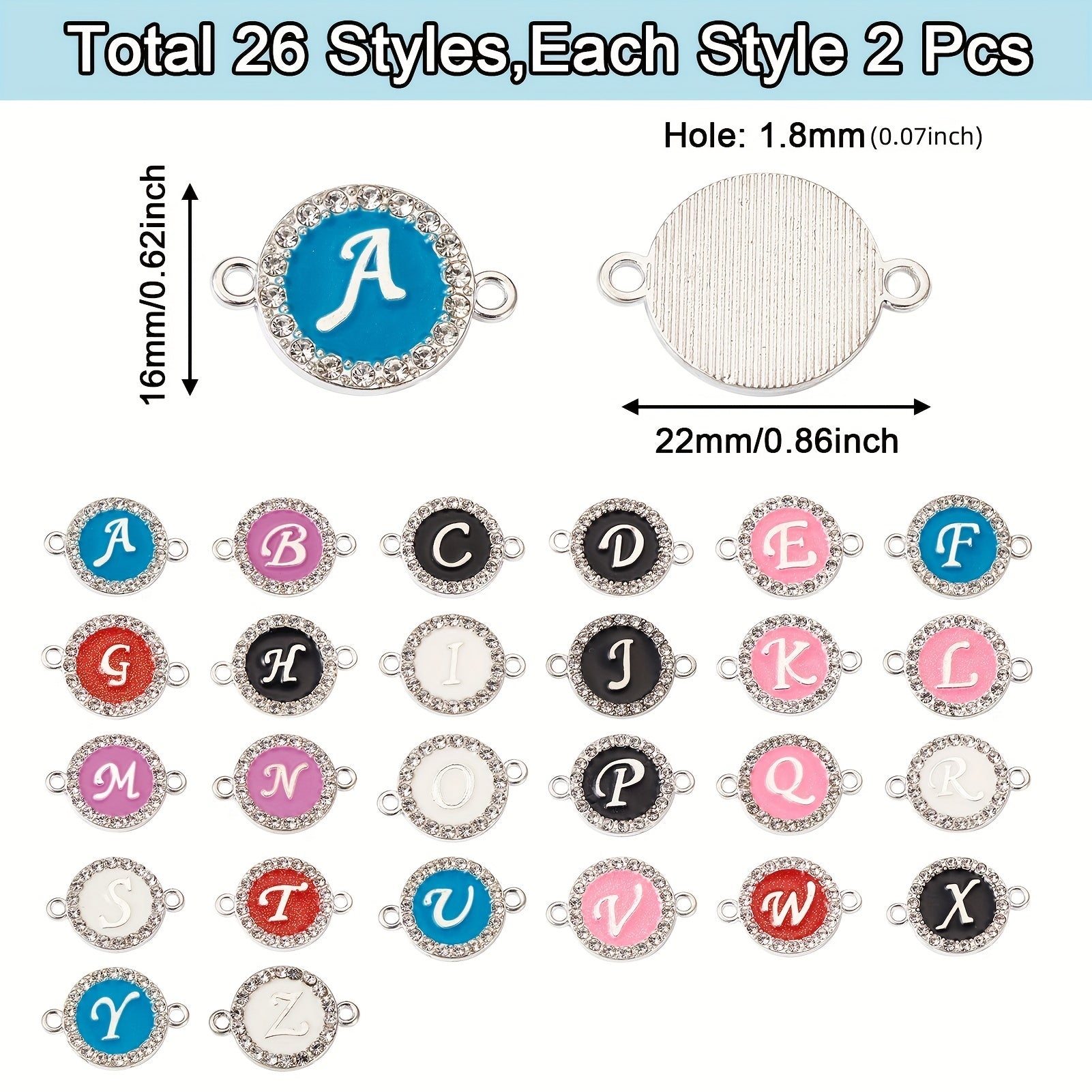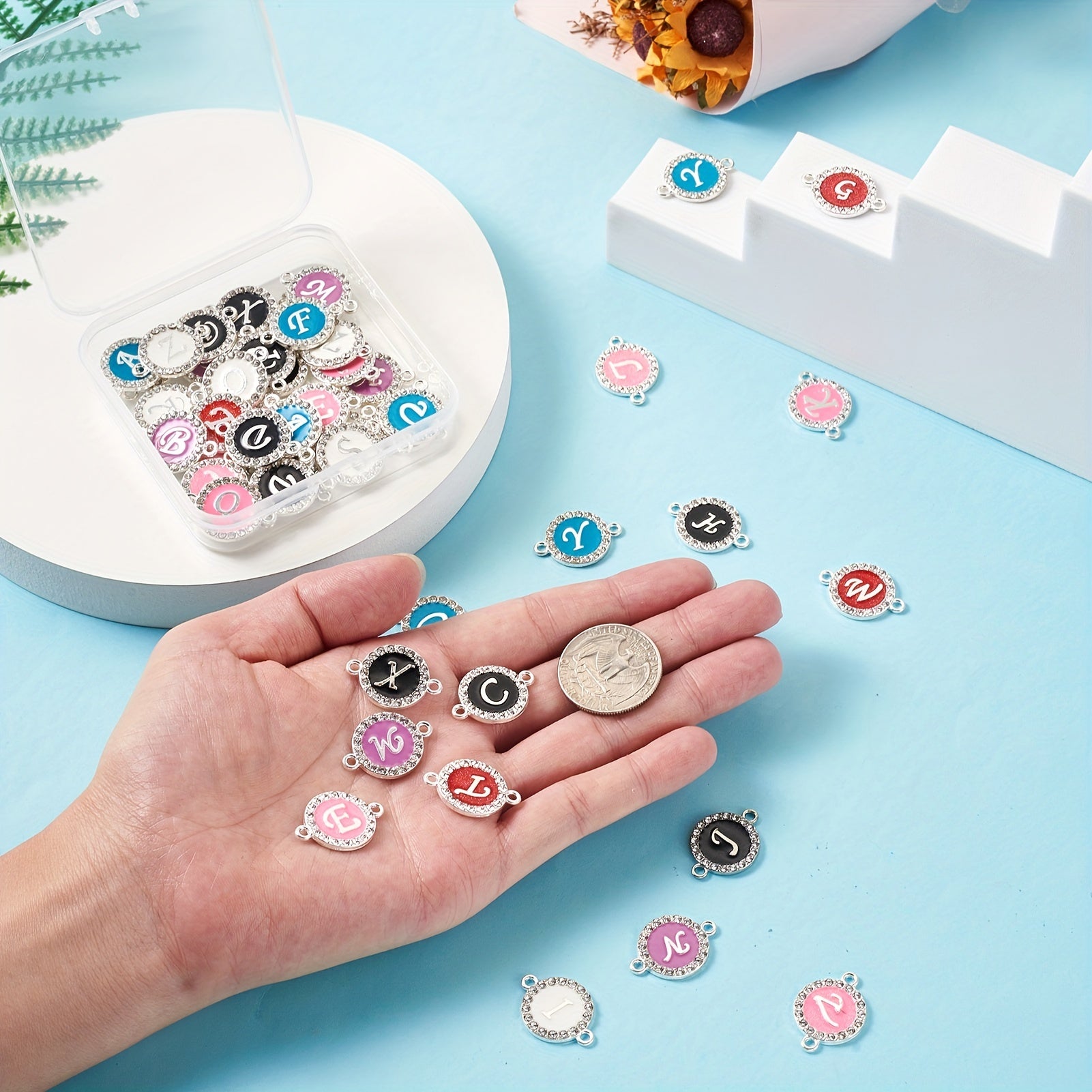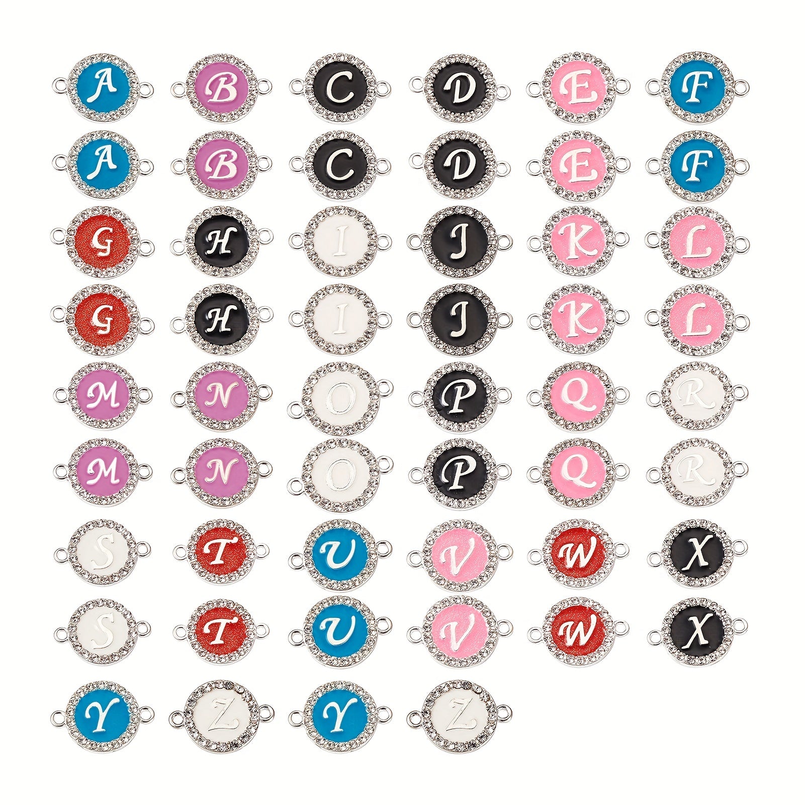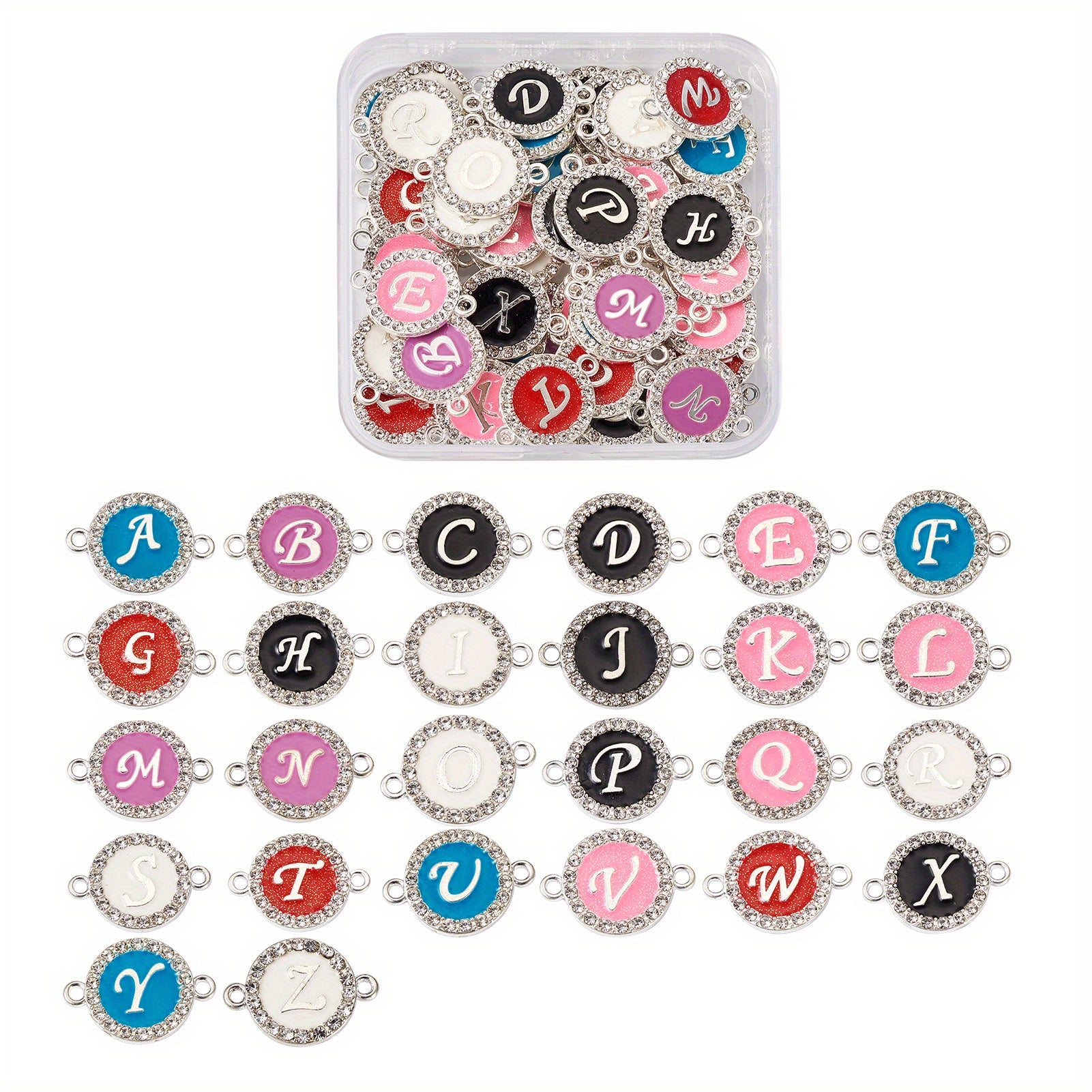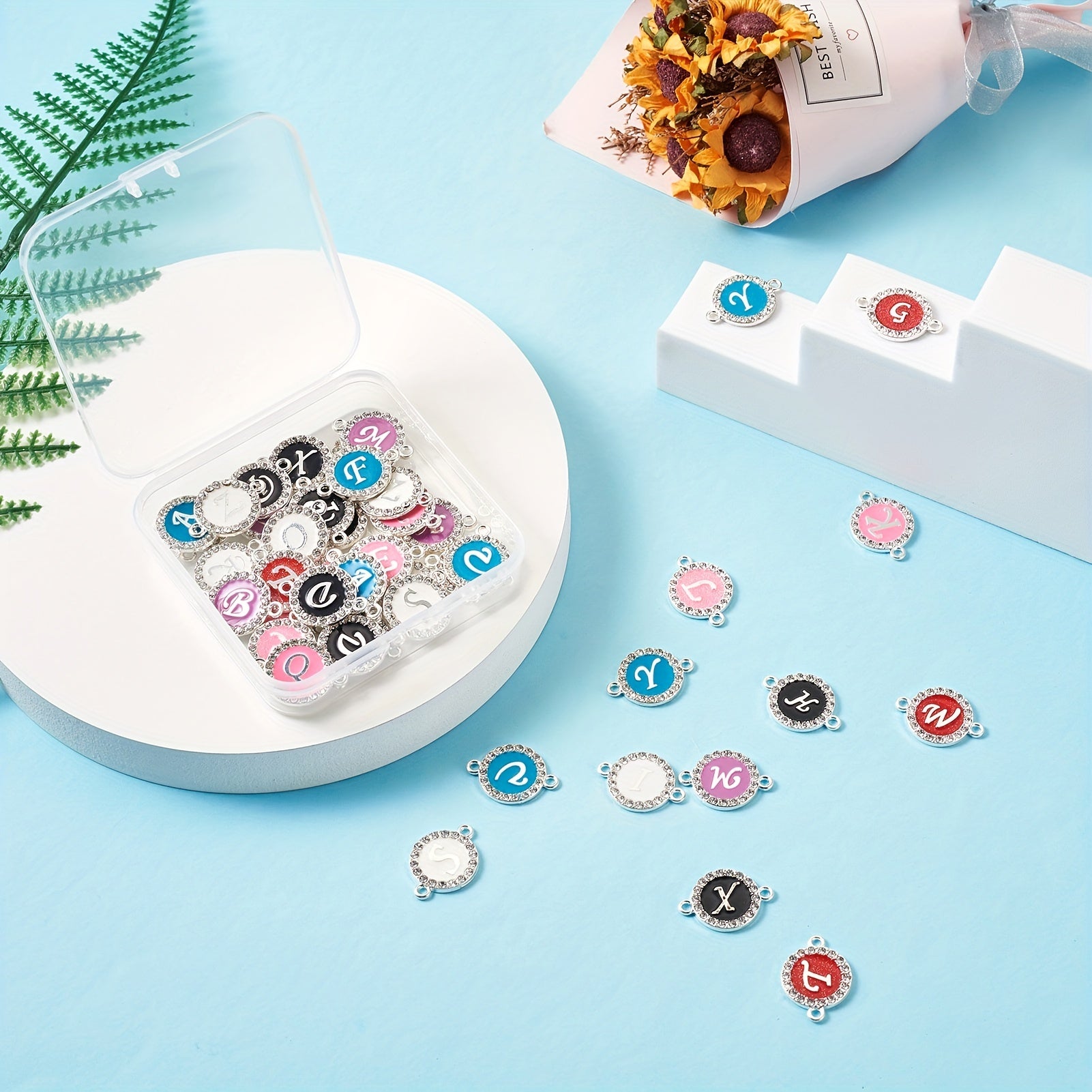 Create personalized jewelry with these 52pcs enamel letter A alloy connectors. Each connector features a flat round design with rhinestones and a letter charm. Perfect for bracelets and other DIY projects.