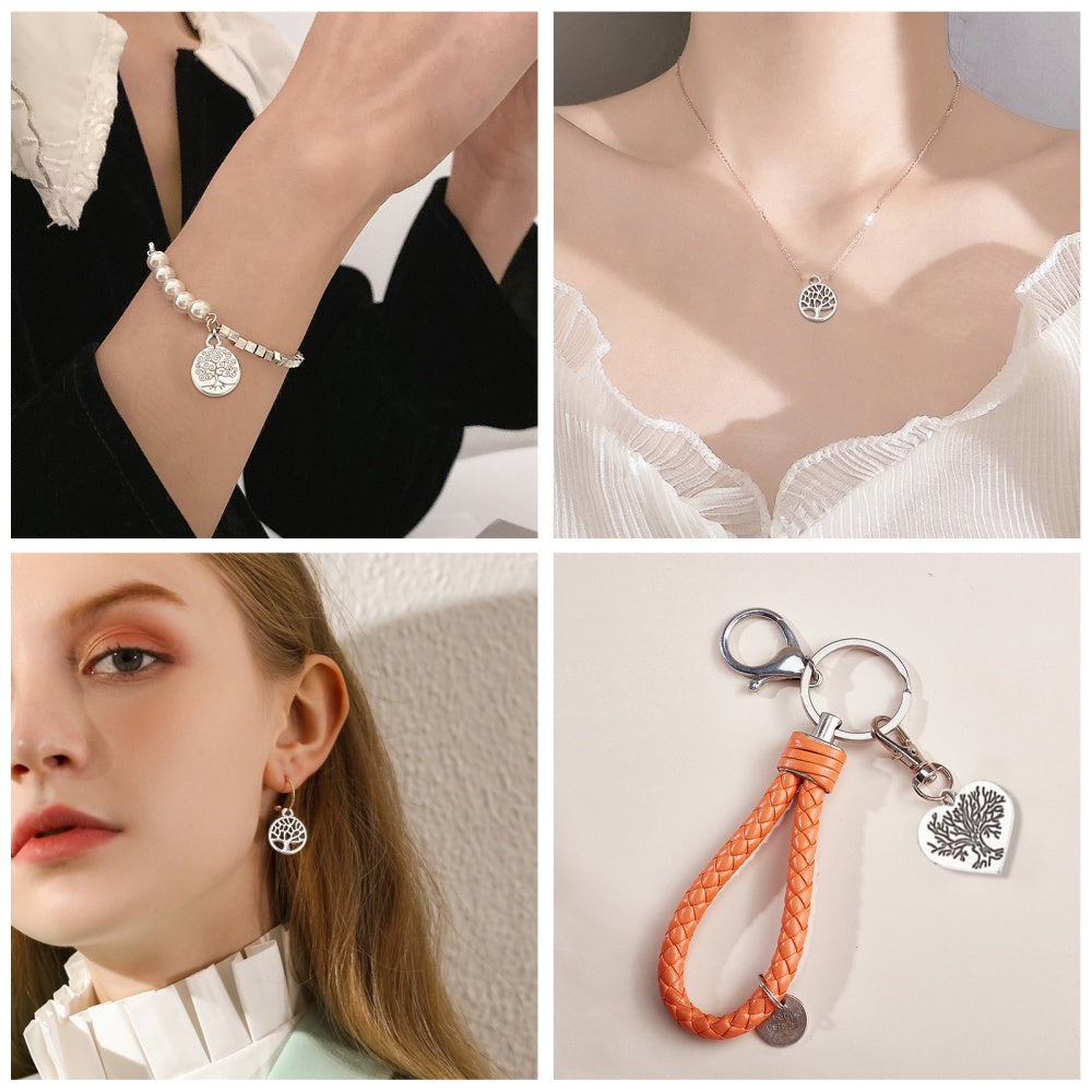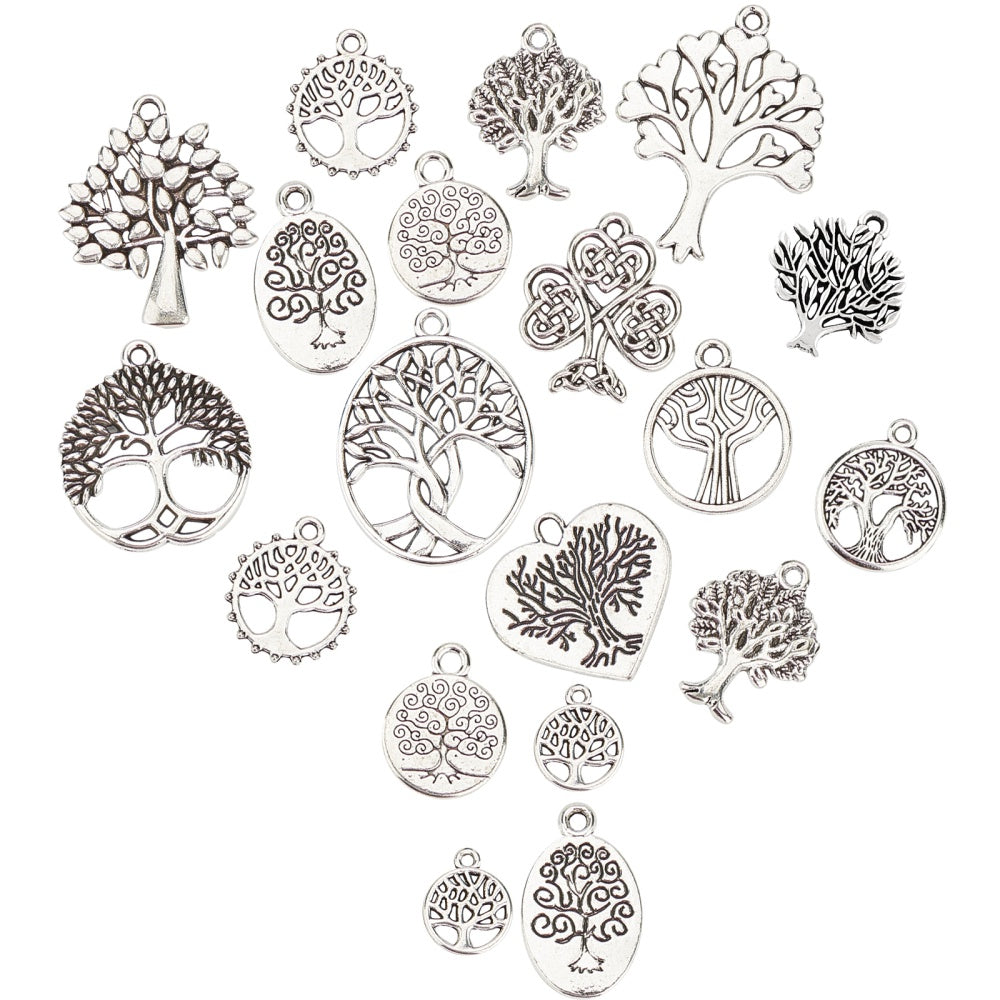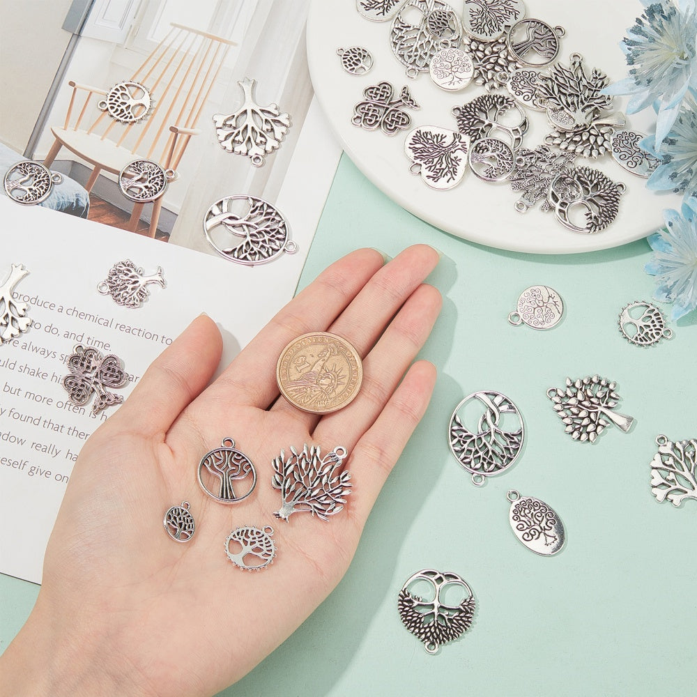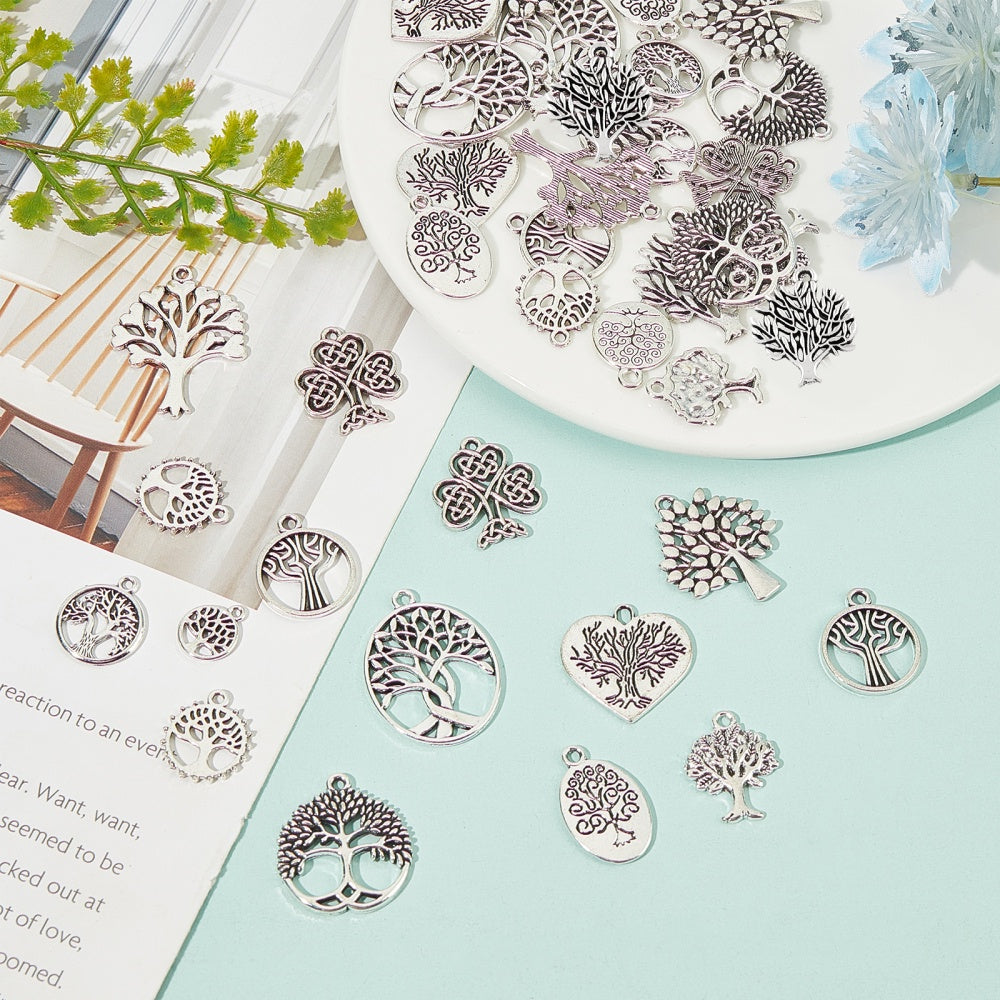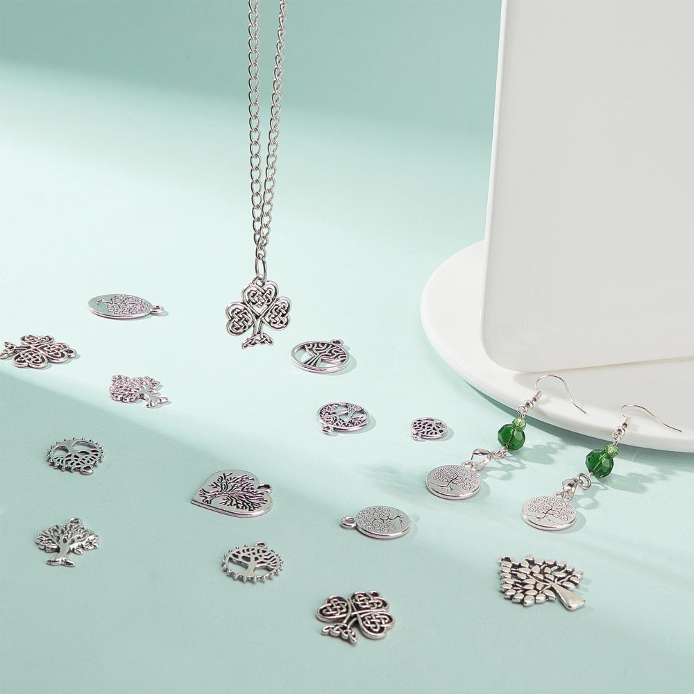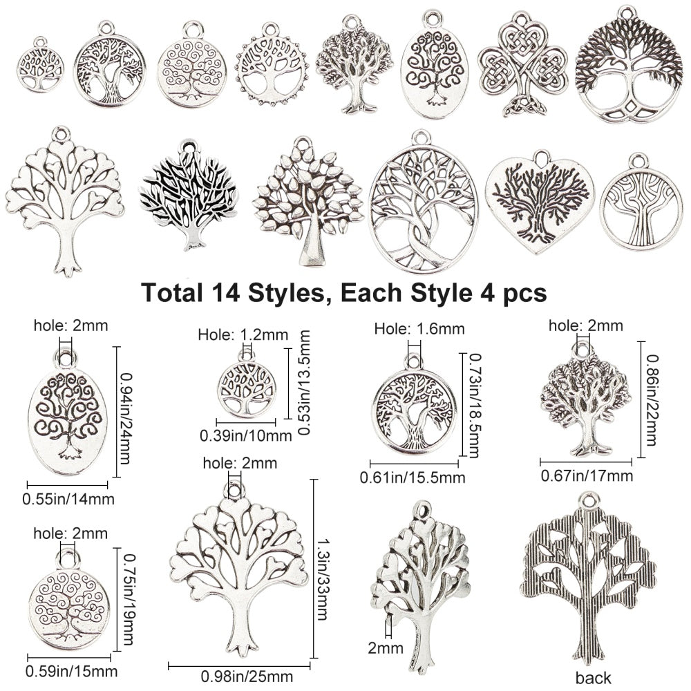 This set includes 56 antique silver tree pattern pendants in 14 different styles. Perfect for creating earrings, bracelets, necklaces, and other accessories.