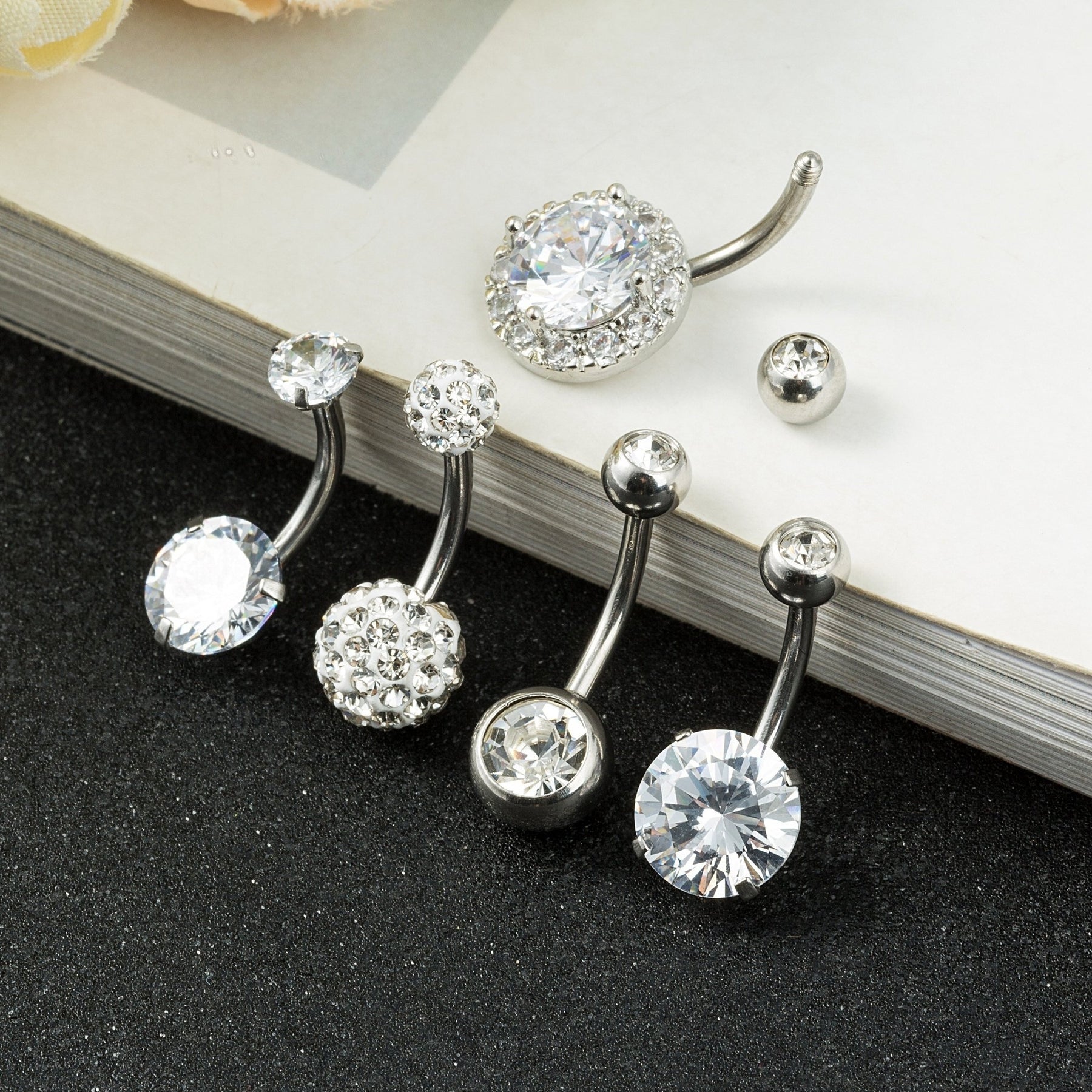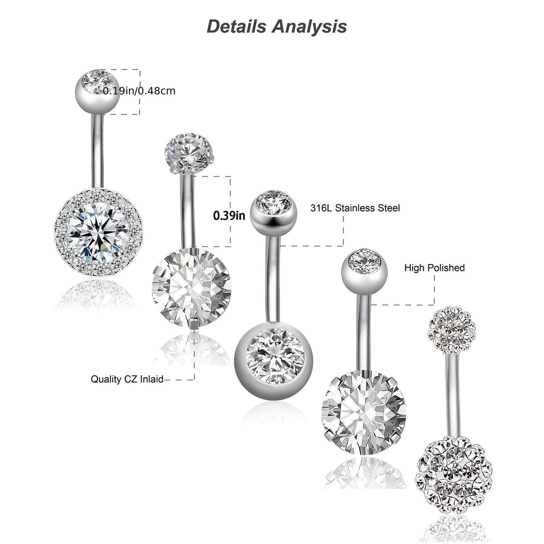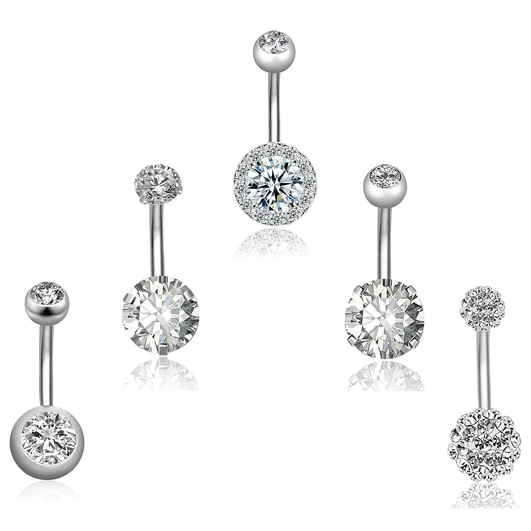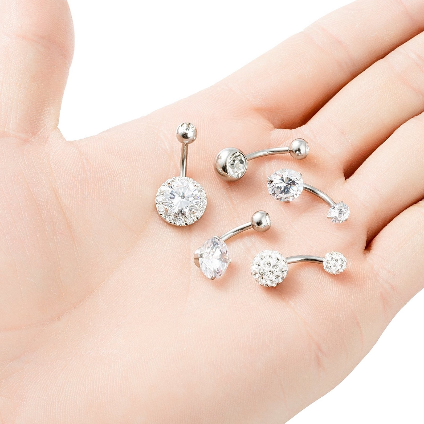 Stay stylish with this set of 5 stainless steel navel rings featuring dazzling CZ stones. Perfect for women and girls.