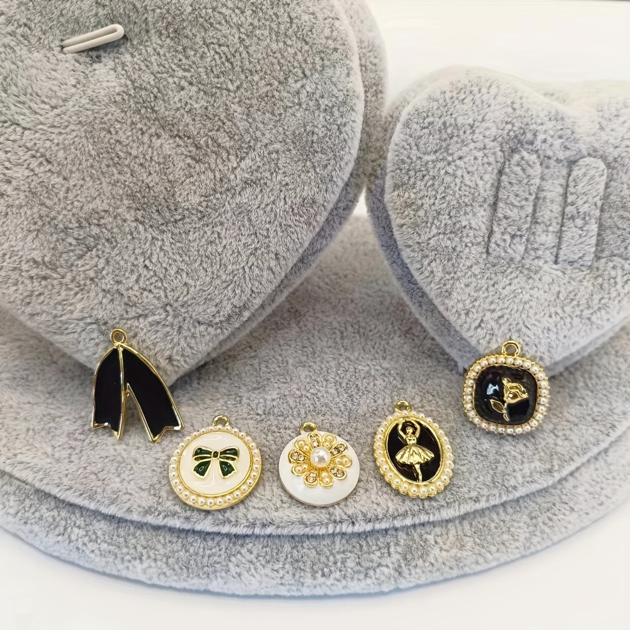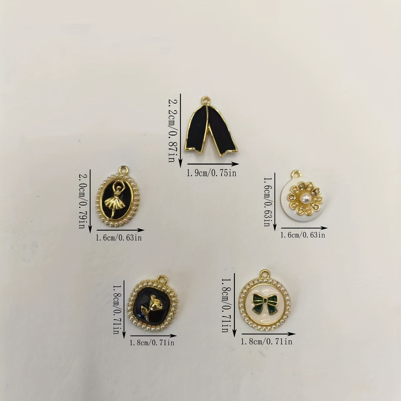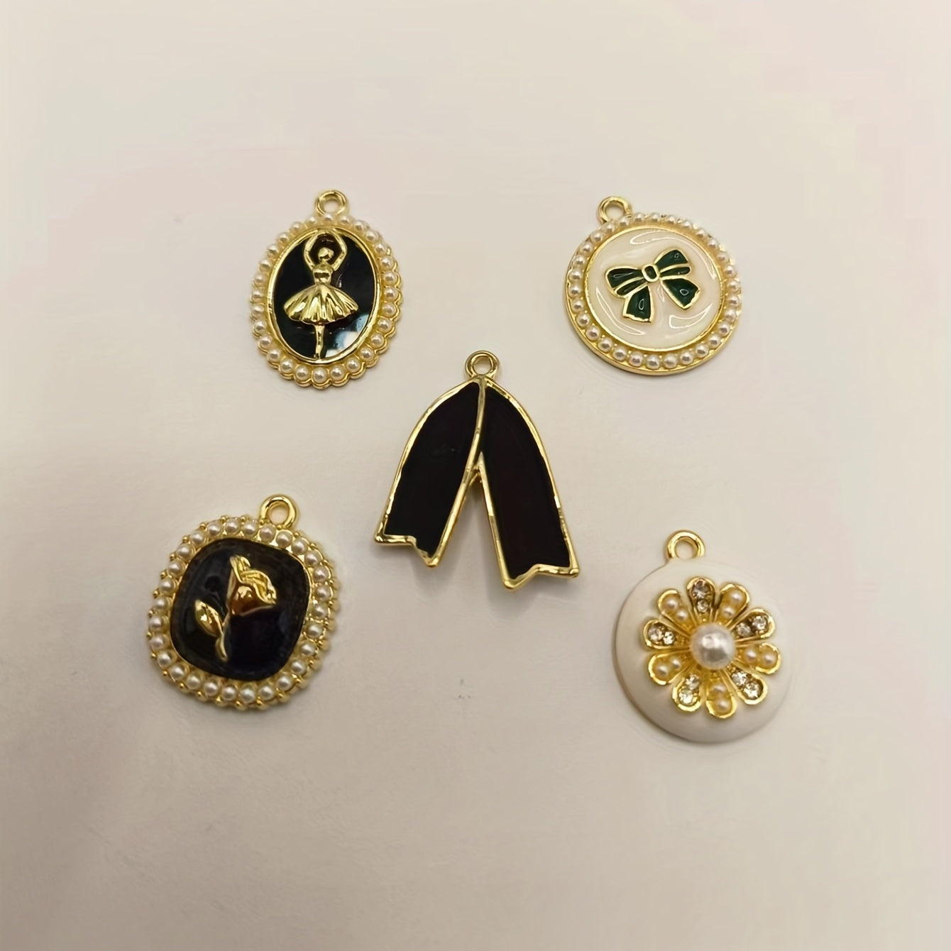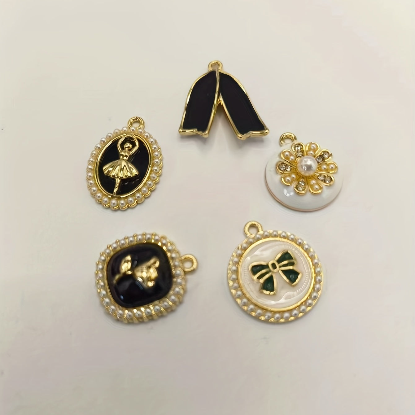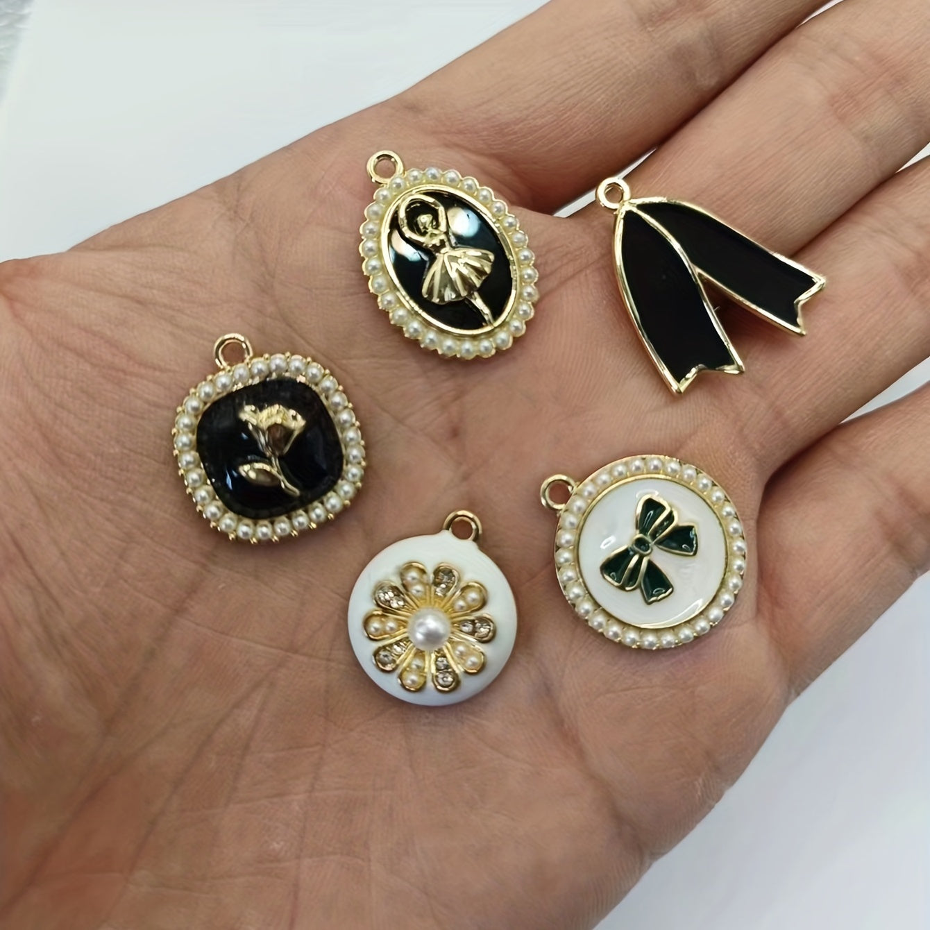 Enhance your DIY projects with this set of 5 enamel pattern alloy pendants featuring faux pearls. Use them to create earrings, bracelets, necklaces, or any other accessories.