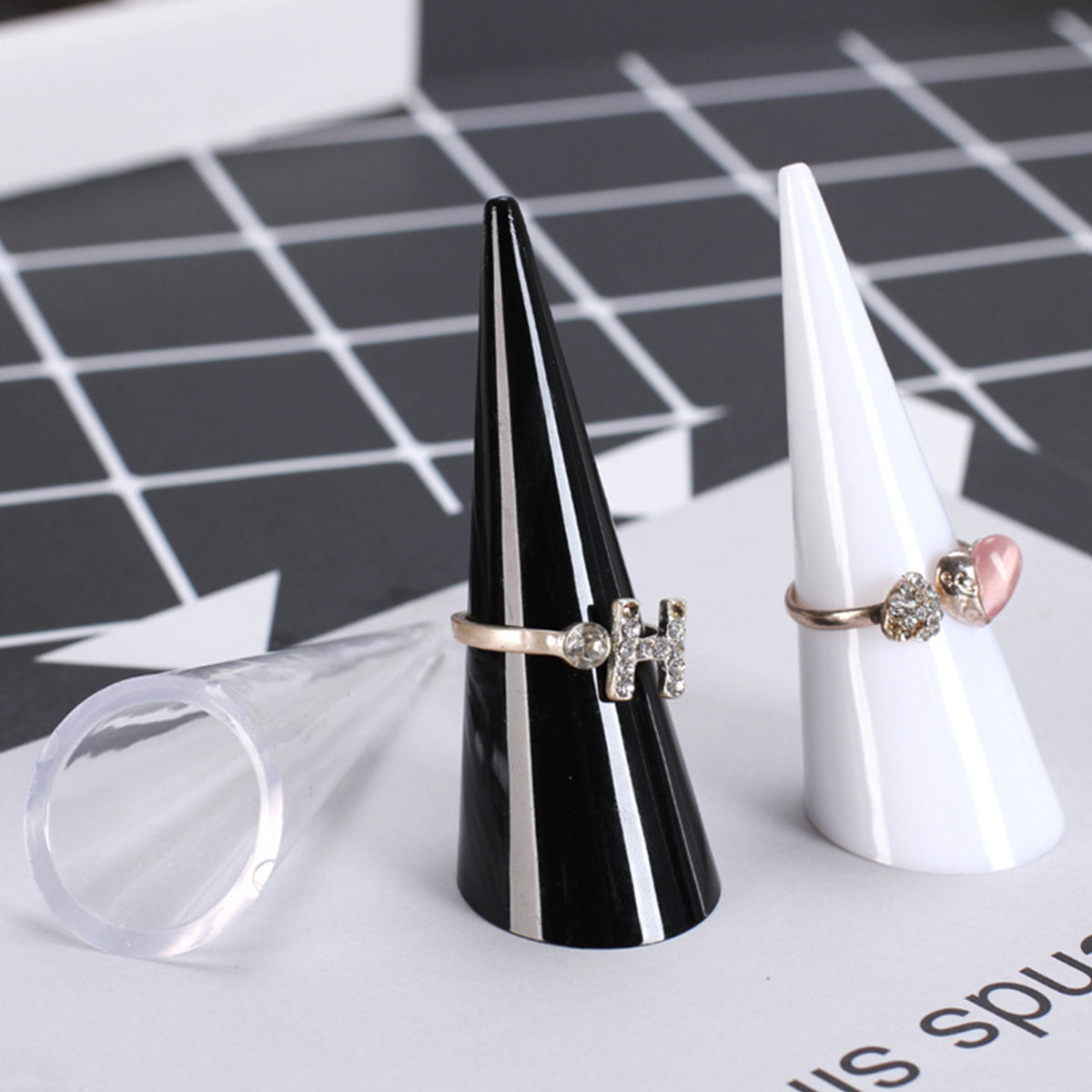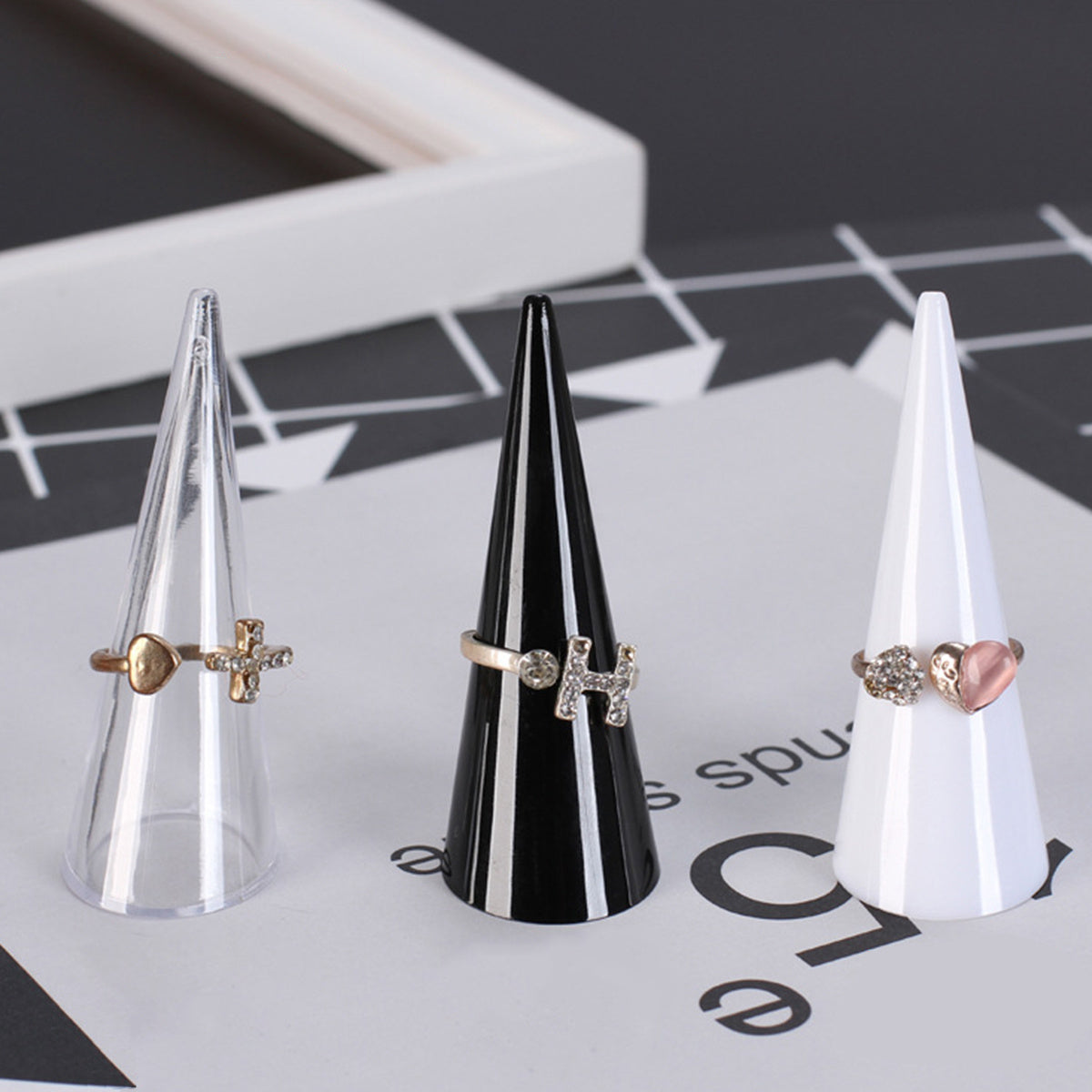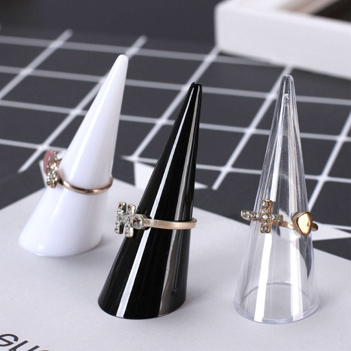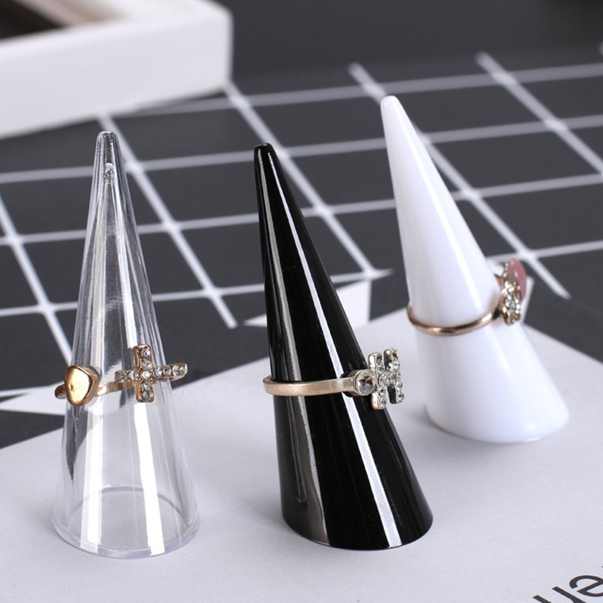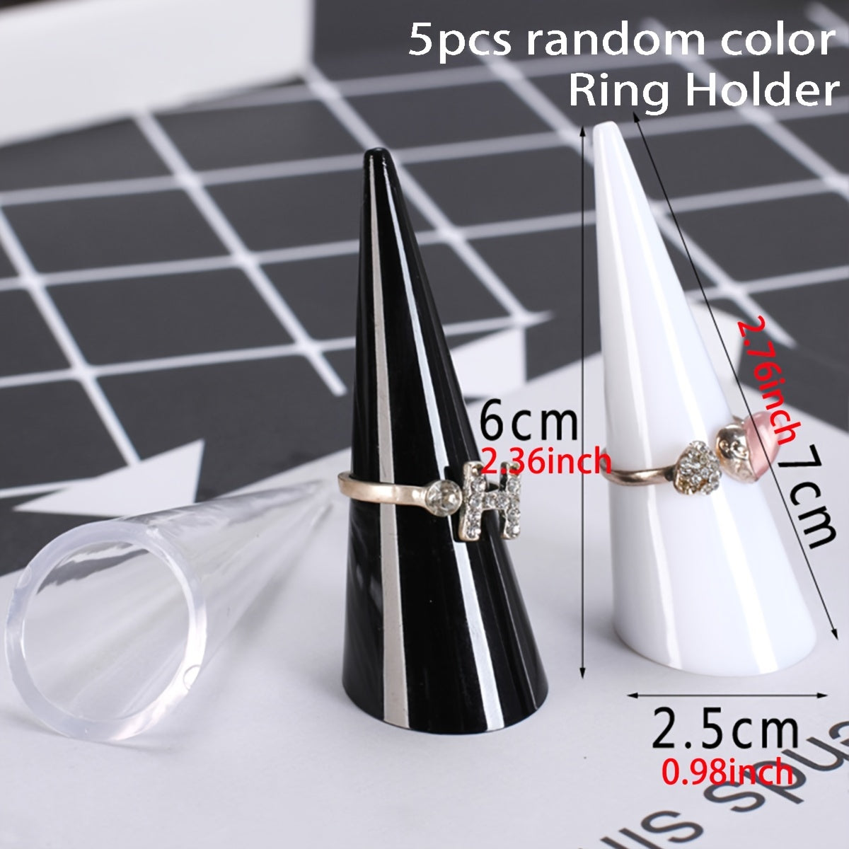 This set includes 5 random ring display stands in cone shape, ideal for showcasing and organizing your rings. Perfect for retail displays or personal use.