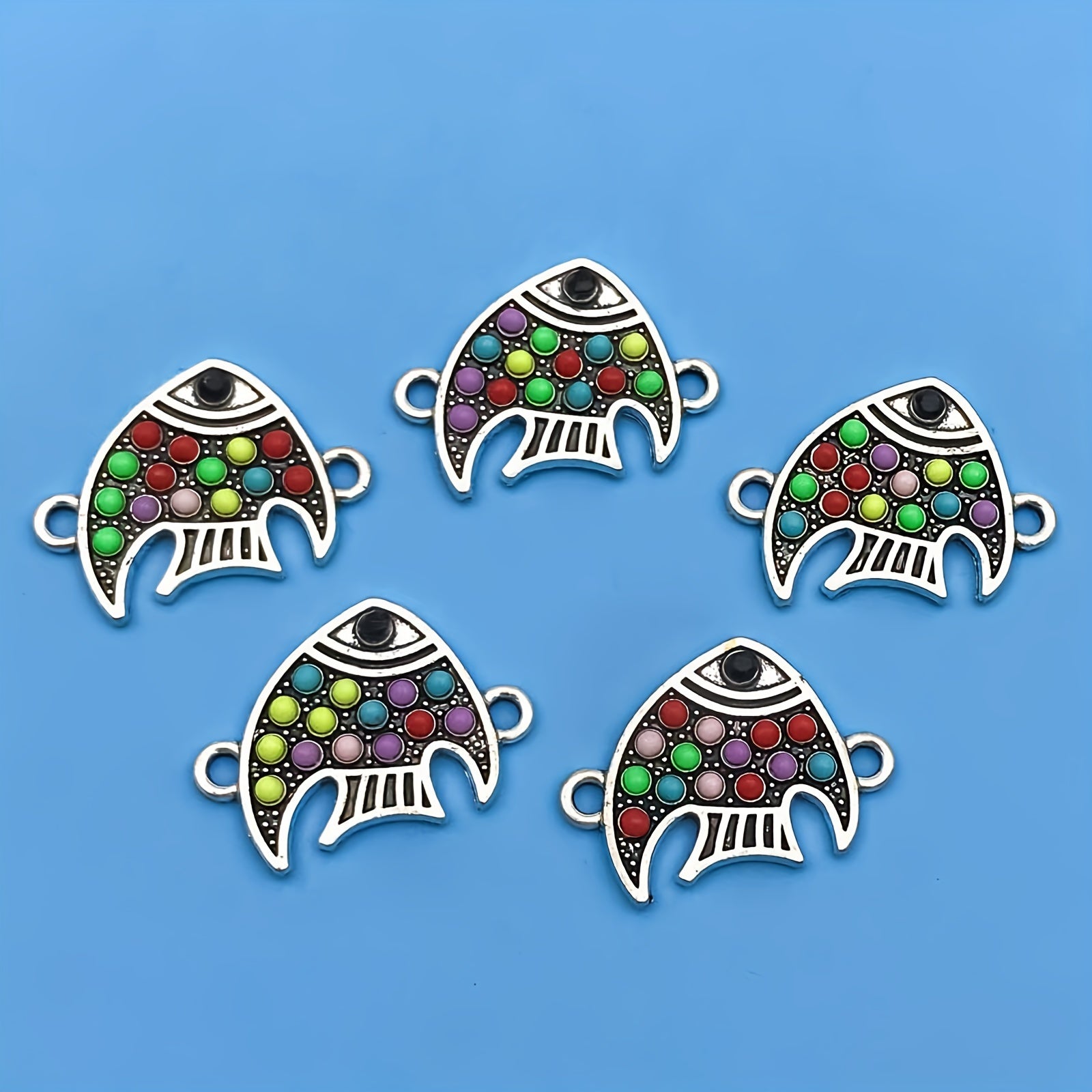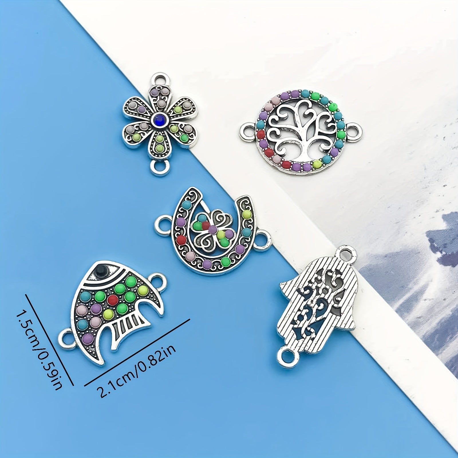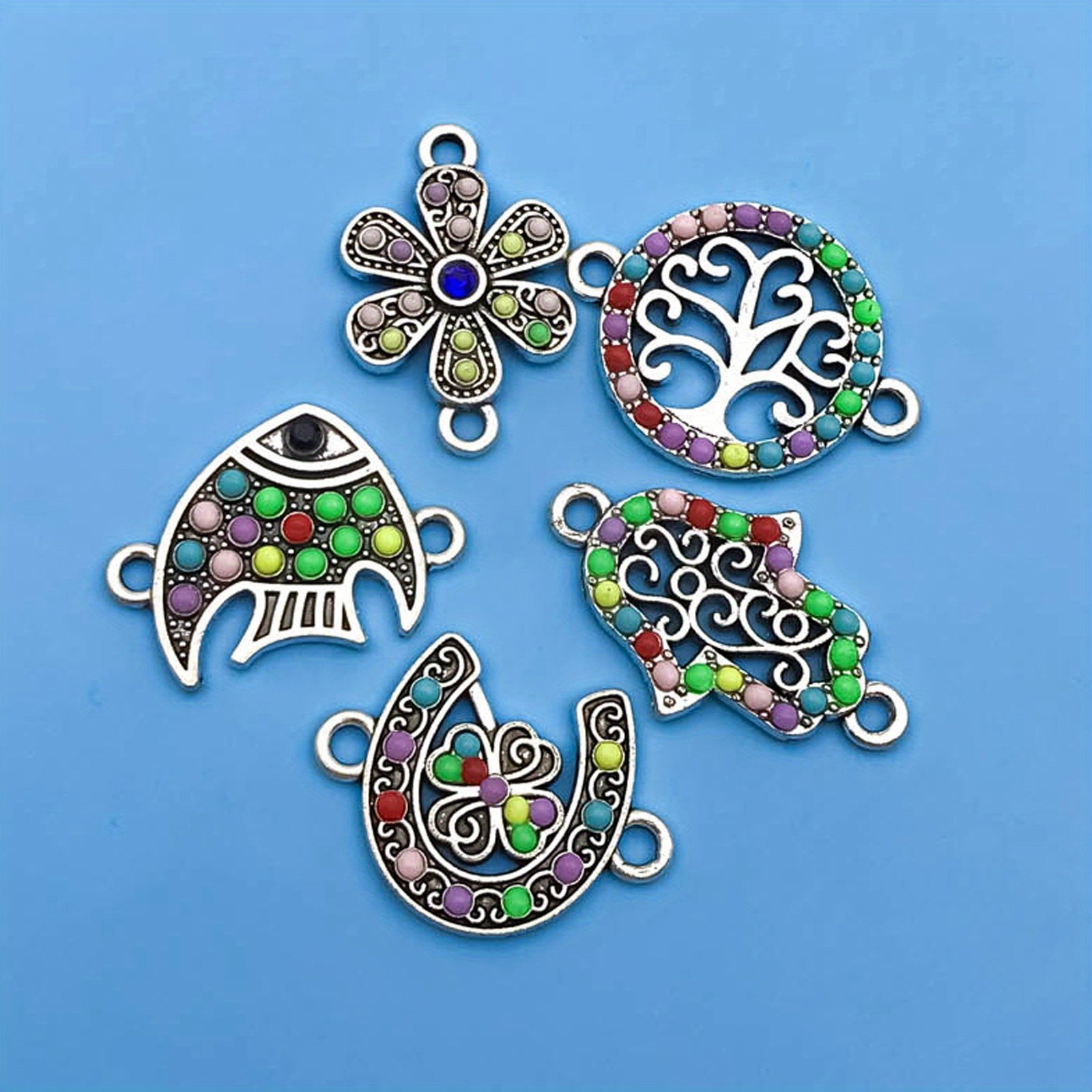 This set includes 5 colorful rhinestone decorated silvery alloy connectors with beautiful flower, fish, and palm tree patterns. Perfect for jewelry making and crafting projects.