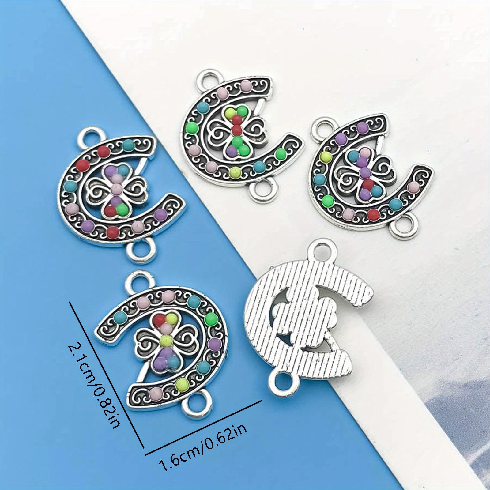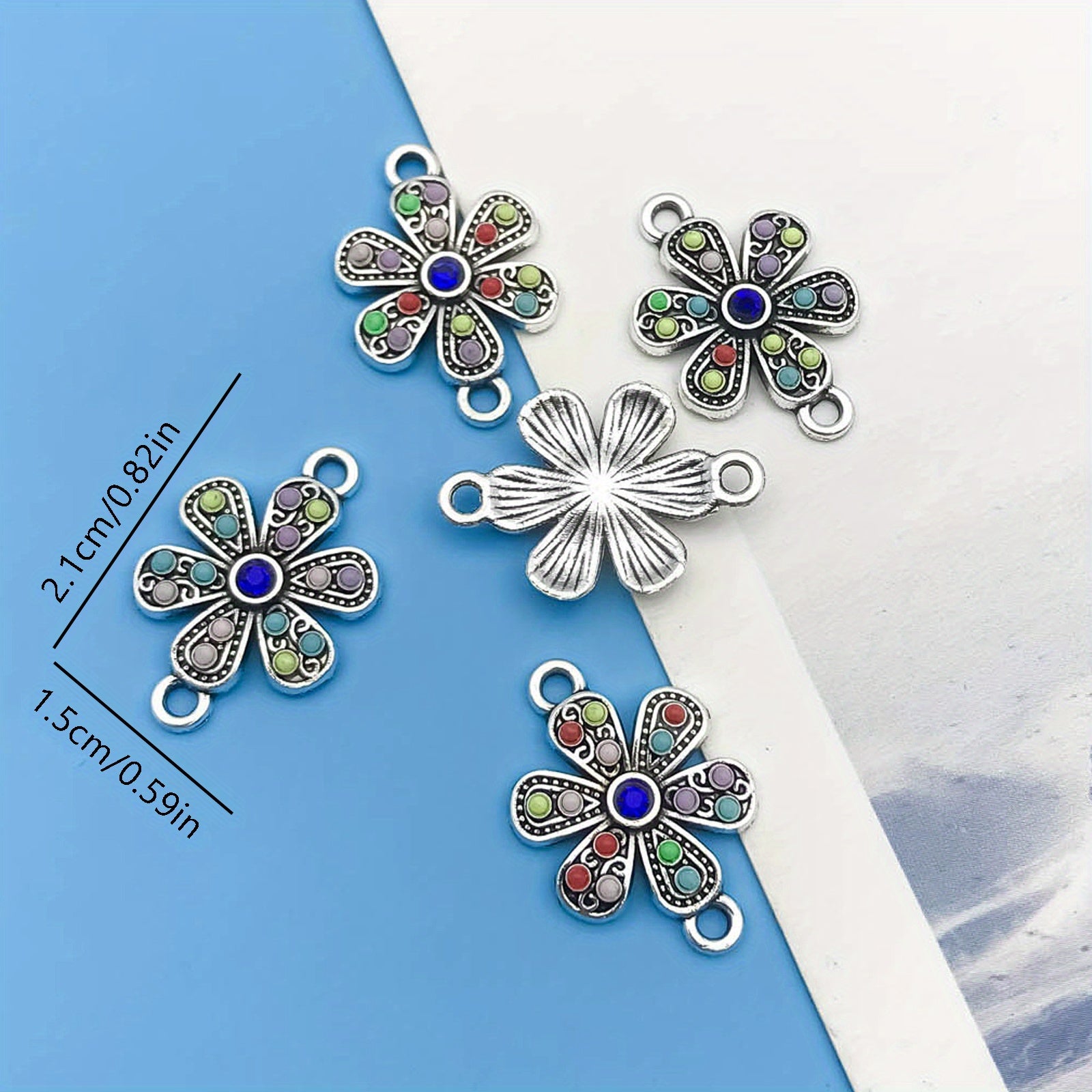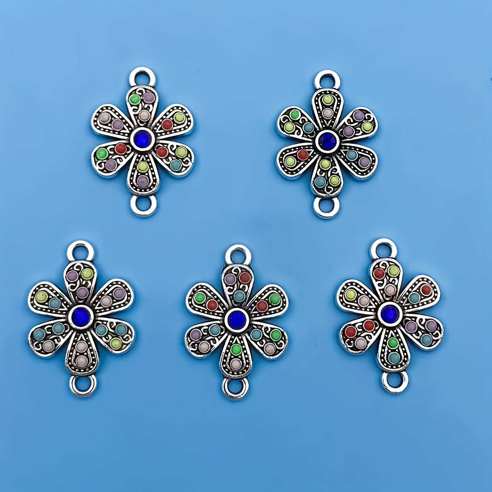 This set includes 5 colorful rhinestone decorated silvery alloy connectors with beautiful flower, fish, and palm tree patterns. Perfect for jewelry making and crafting projects.