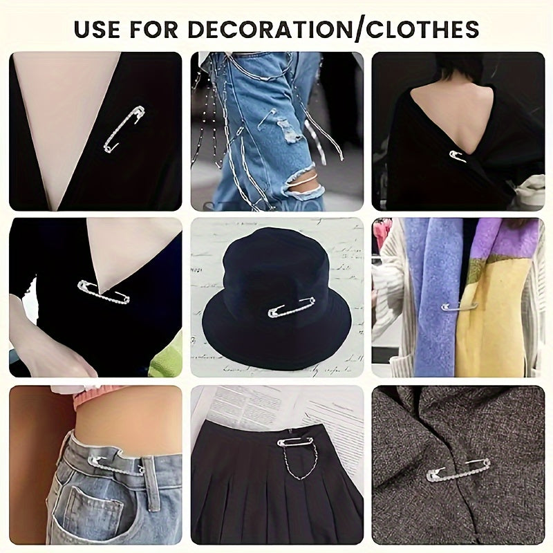 Add a touch of elegance to your outfits with these silvery rhinestone safety pins that can be used on sweaters, shawls, skirts, and more.
