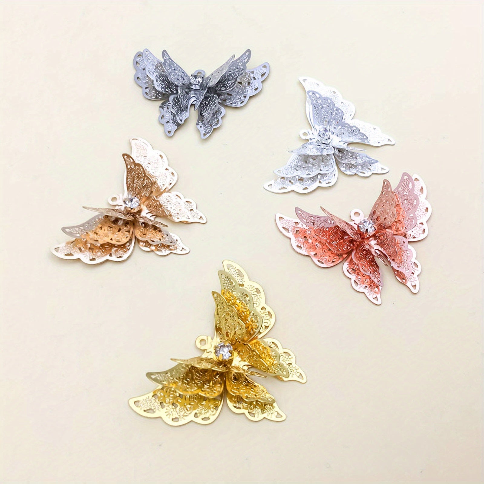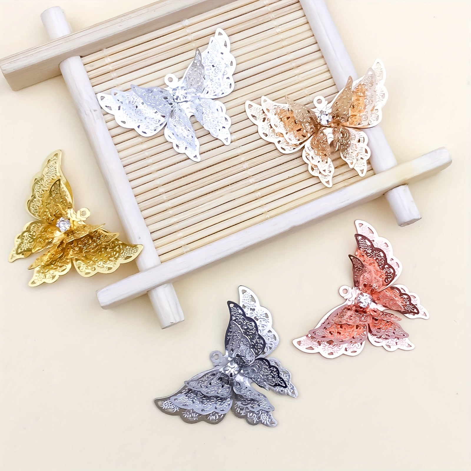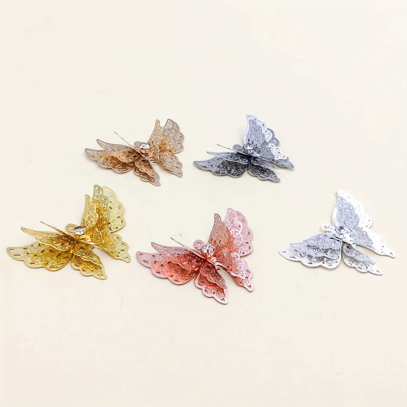 Add a touch of elegance to your jewelry creations with this 5pcs set of copper plated three-dimensional butterfly hairpin pendants. Perfect for making necklaces, bracelets, and earrings.