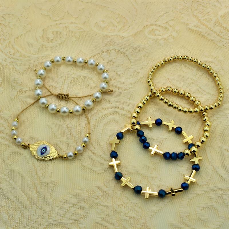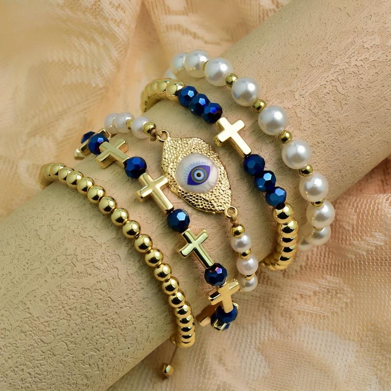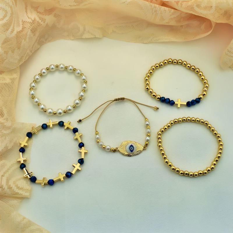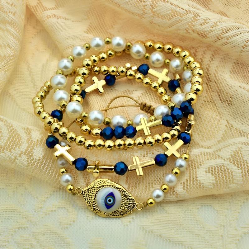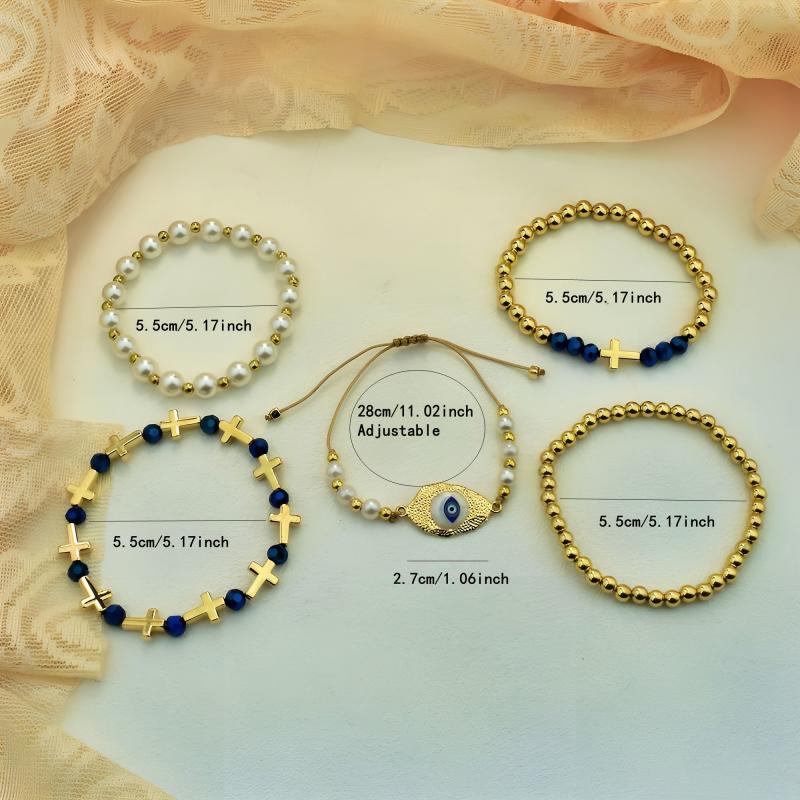 This set of 5 beaded woven bracelets feature beautiful designs with an evil eye and cross, perfect for daily wear, religious activities, travel, and vacation.