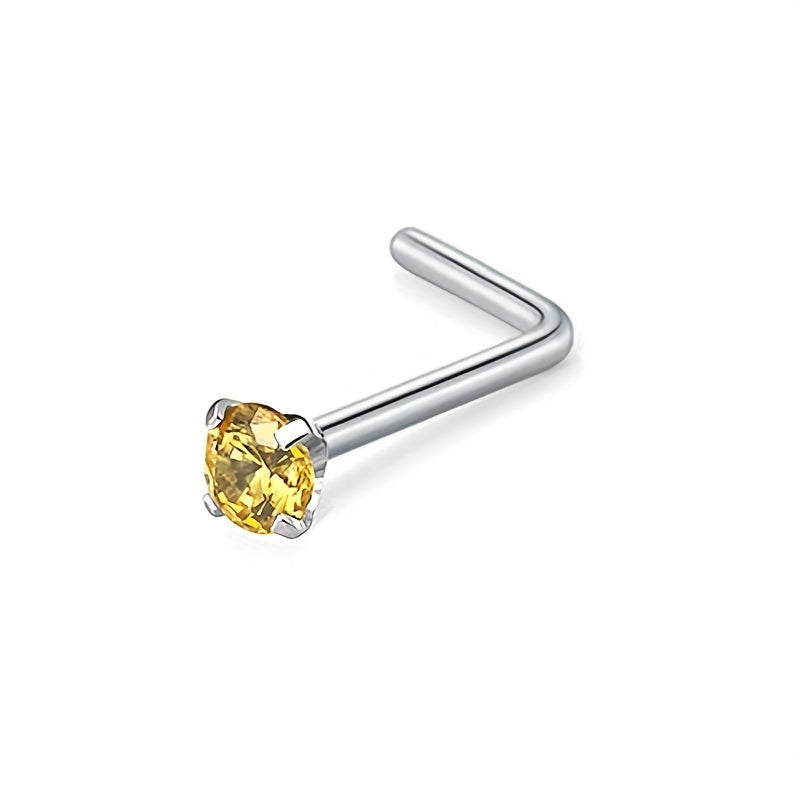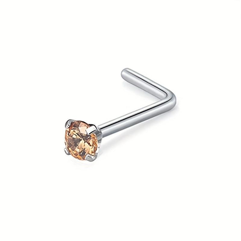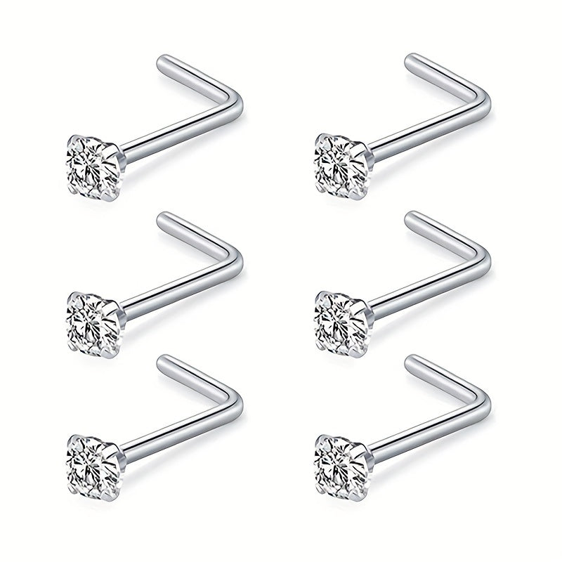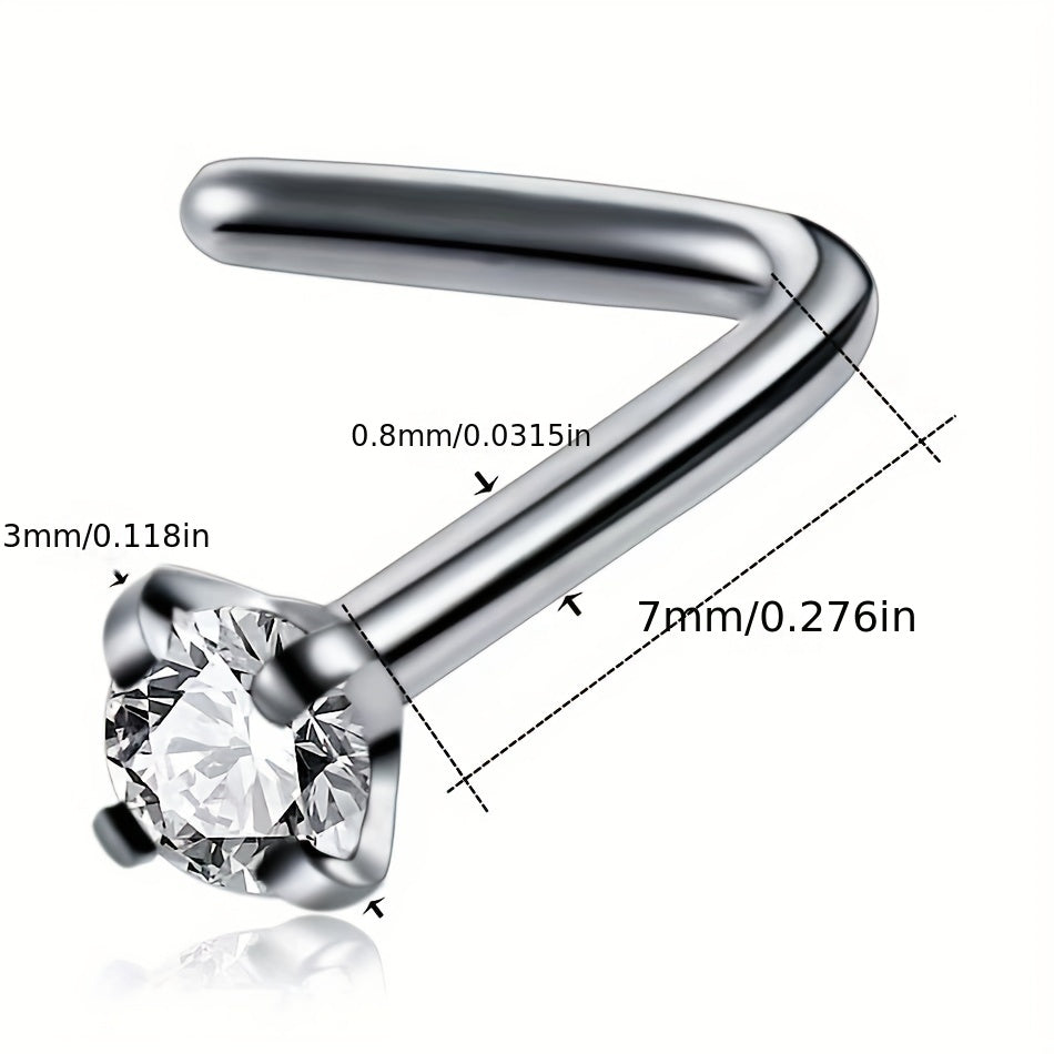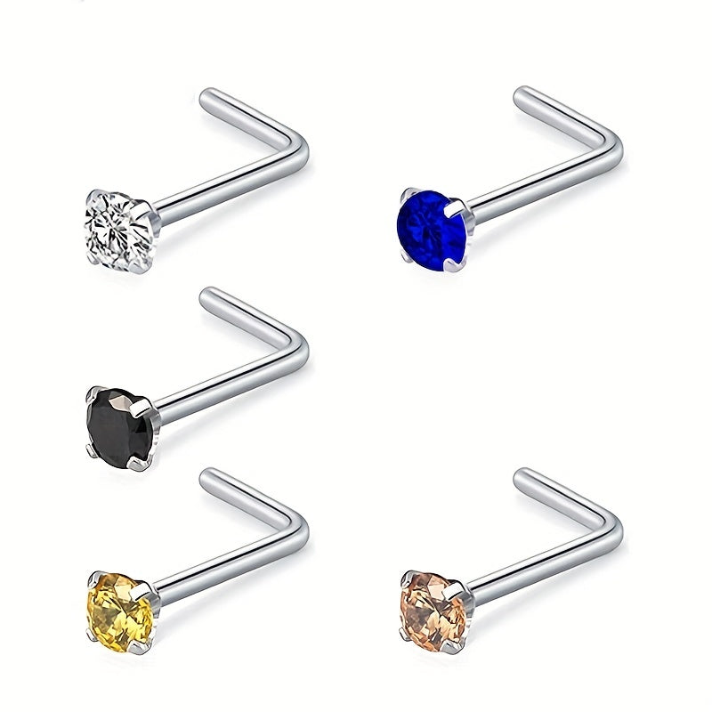 This set includes 5 L shaped stainless steel nose nails with zirconia crystals. Perfect for nose piercings, adding a touch of elegance and style.