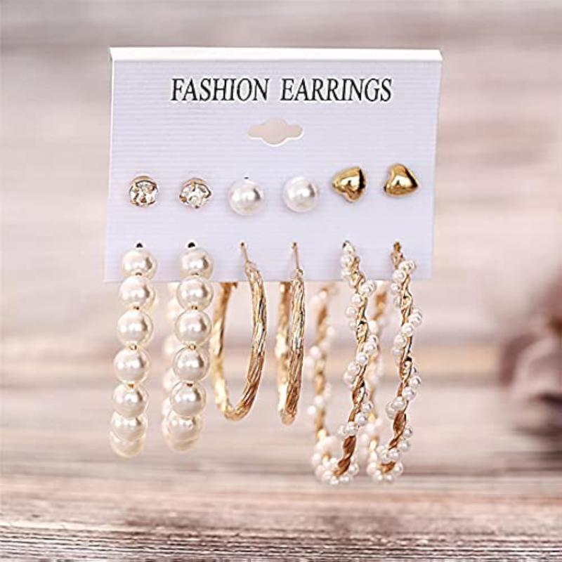 Elegant set of 6 pairs of earrings featuring stunning pearl and AD designs. Perfect for adding a touch of glamour to any outfit.