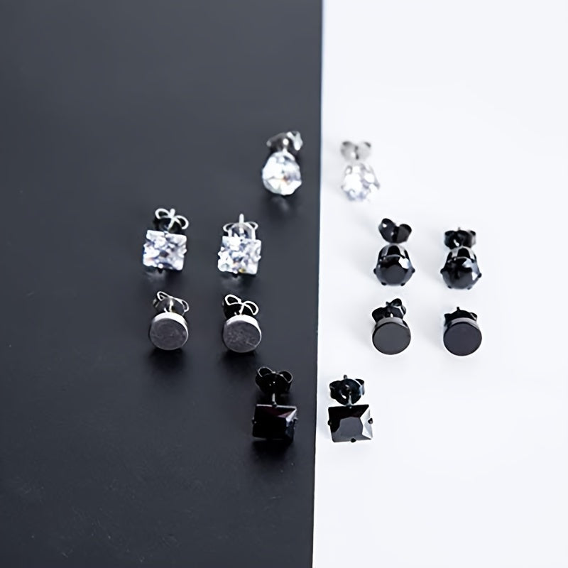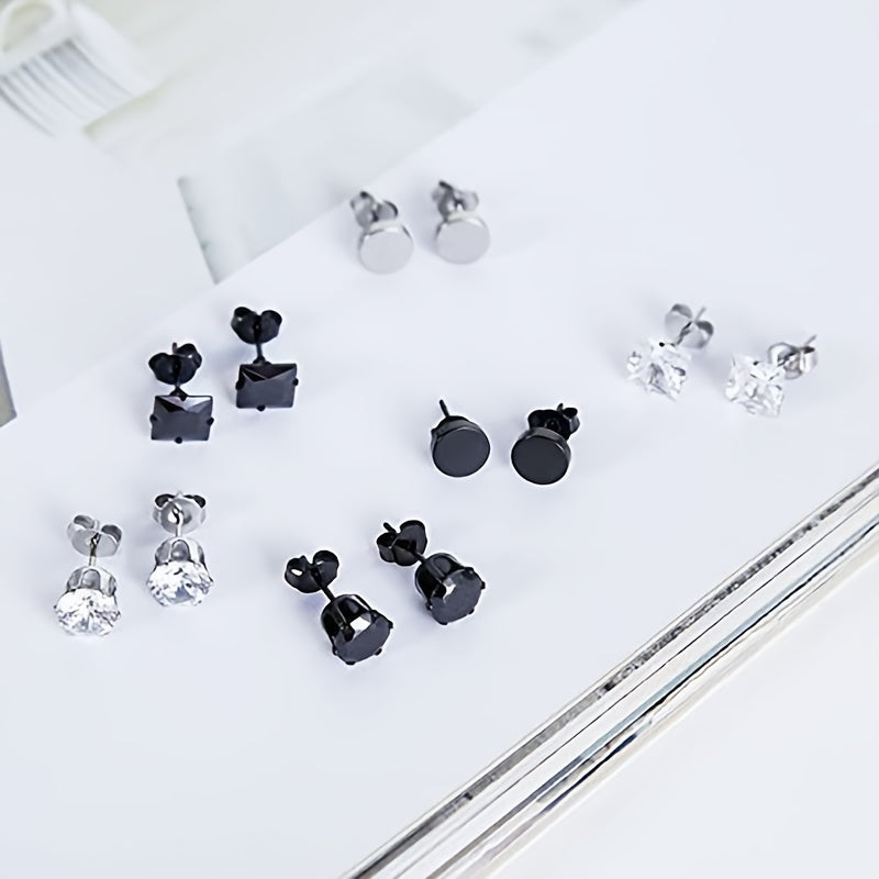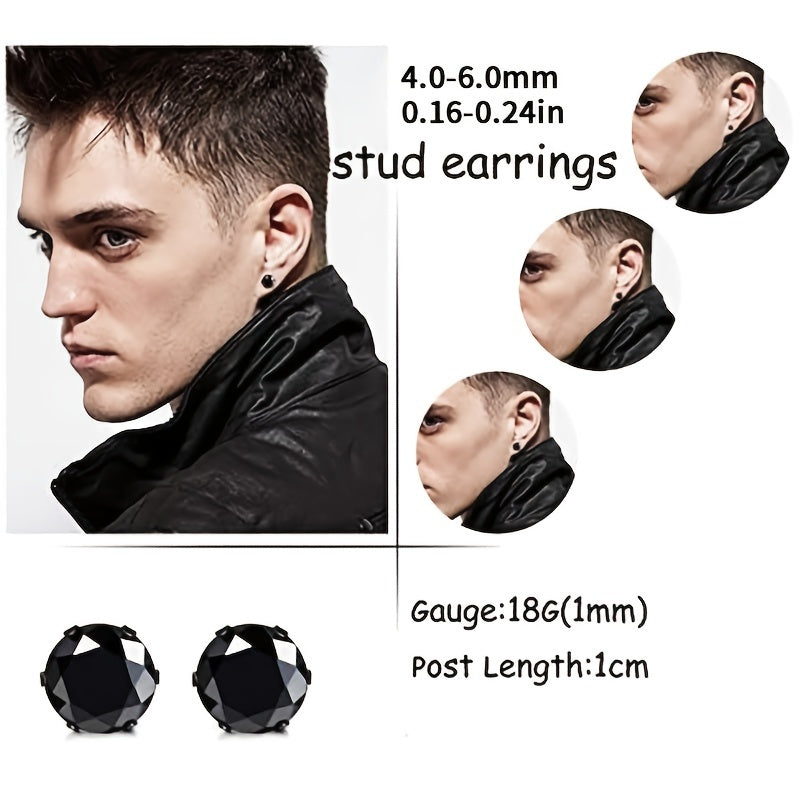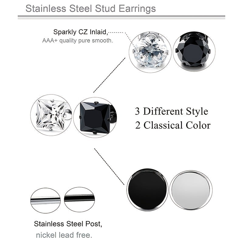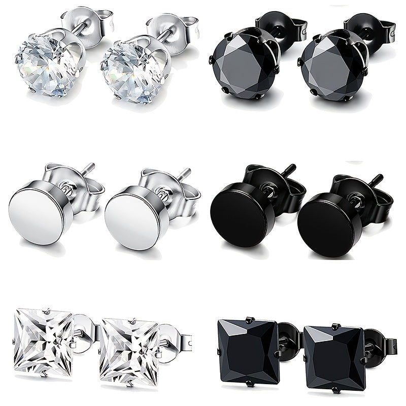 This set includes 6 pairs of stainless steel stud earrings with CZ round designs, suitable for both men and women.