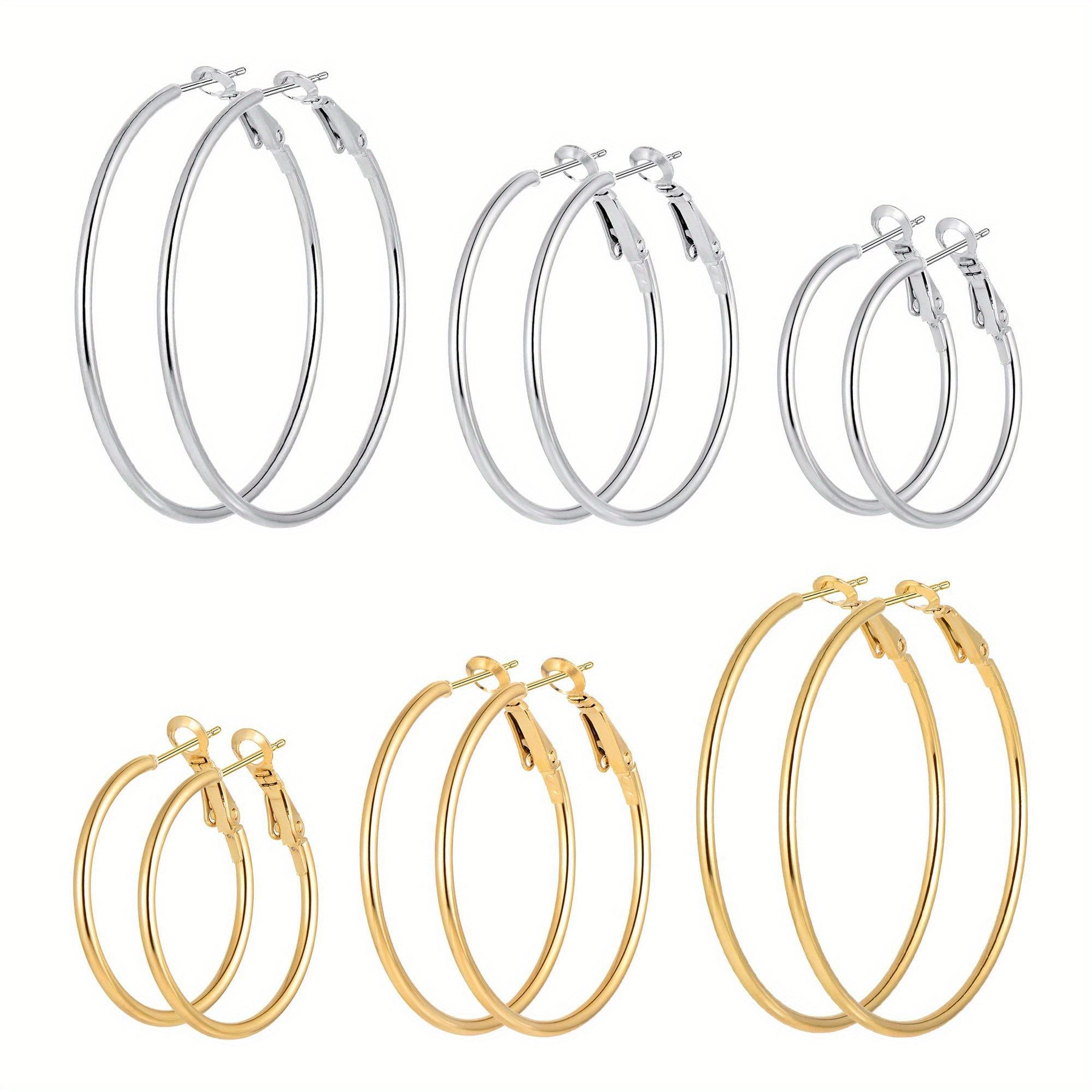 This set includes 6 pairs of hoop earrings made of stainless steel with golden and silver plating. The earrings are hypoallergenic and suitable for women.