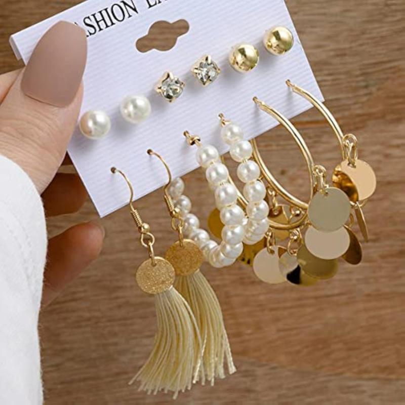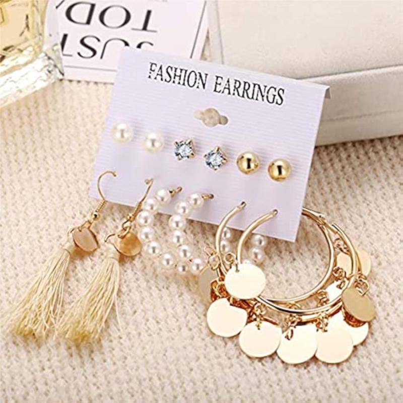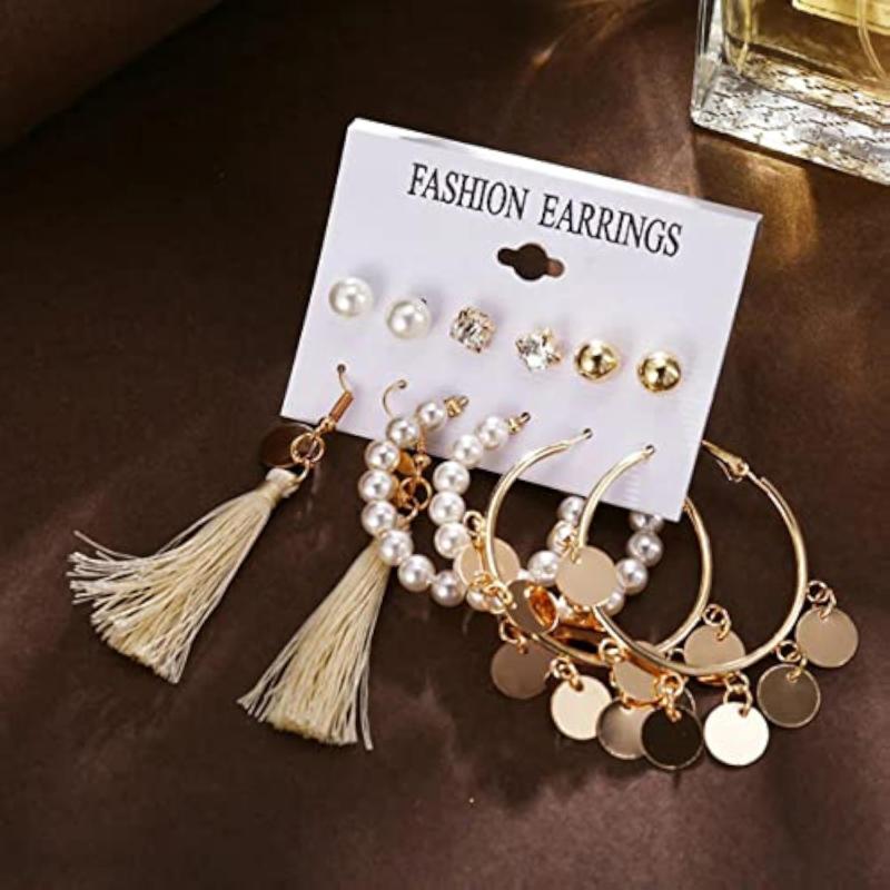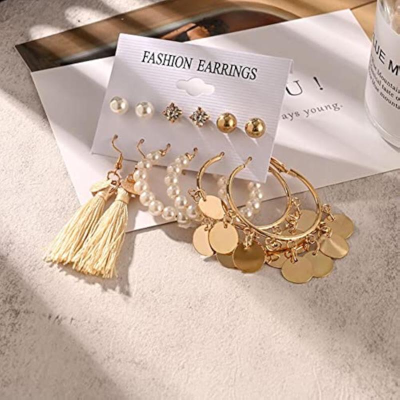 Elevate your style with this stunning set of 6 earrings featuring a mix of studs, hoops, and drop designs. Perfect for any occasion.
