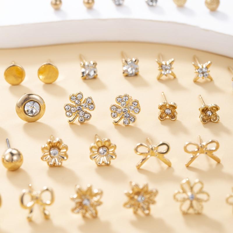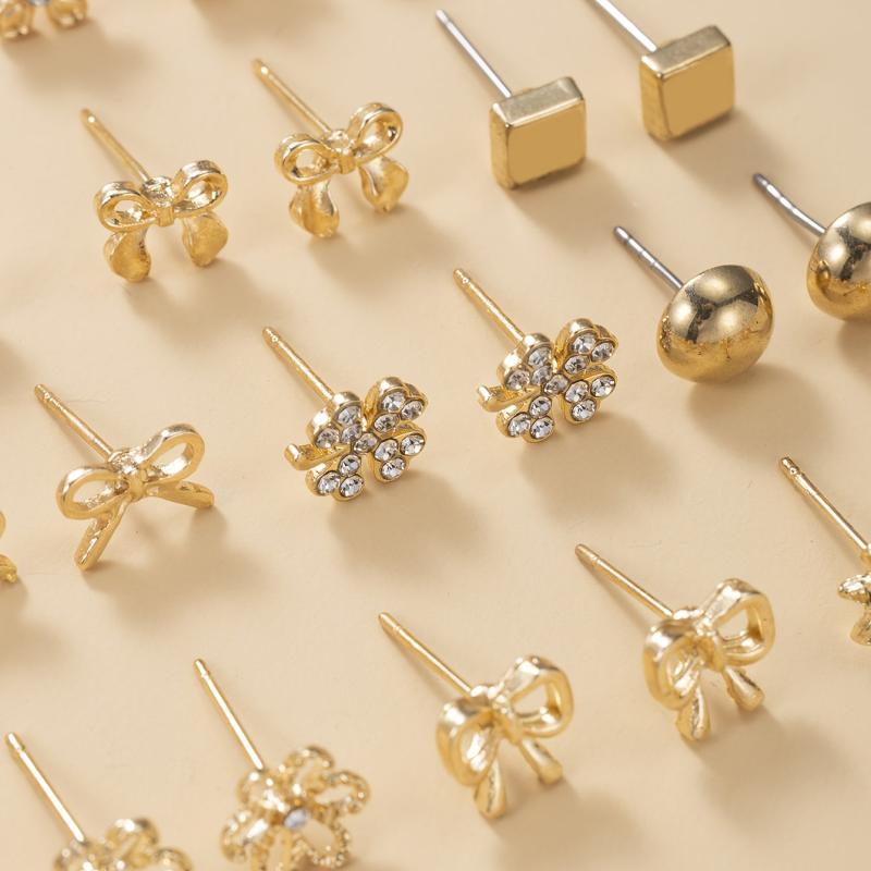 Golden toned zinc alloy earrings featuring bows, flowers, hearts, and geometric designs. Stainless steel posts for durability and style.