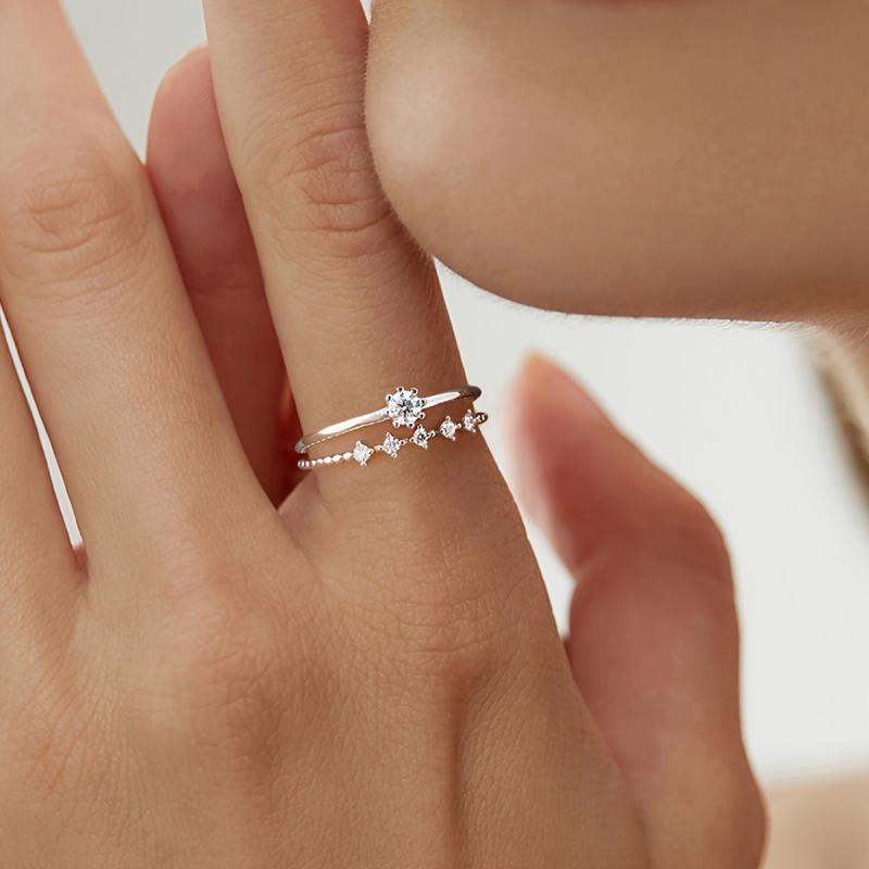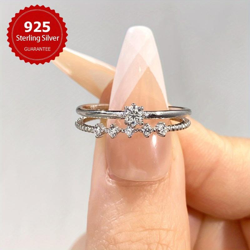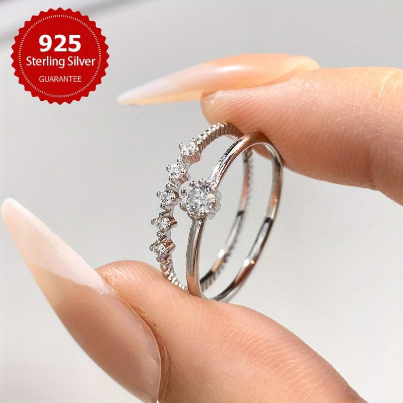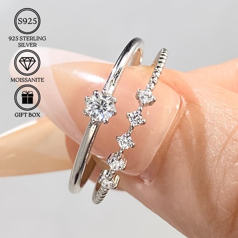 This elegant ring set features two 0.1 carat sparkling moissanite stones set in 925 sterling silver. Perfect for everyday wear and special occasions.