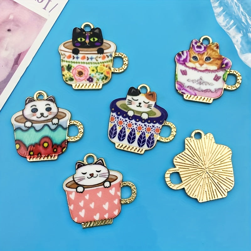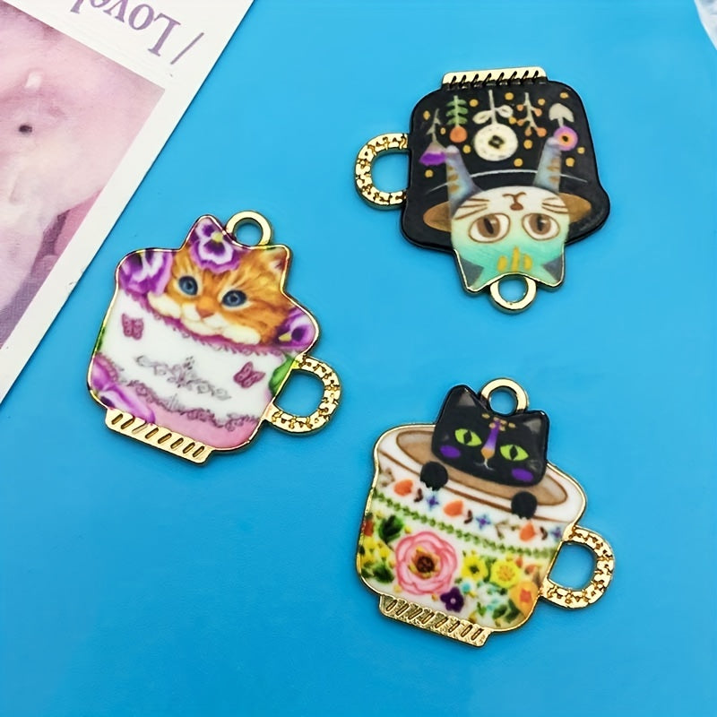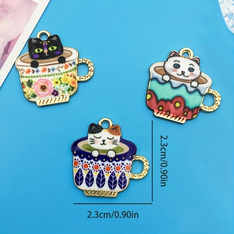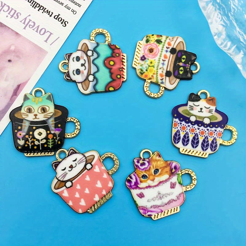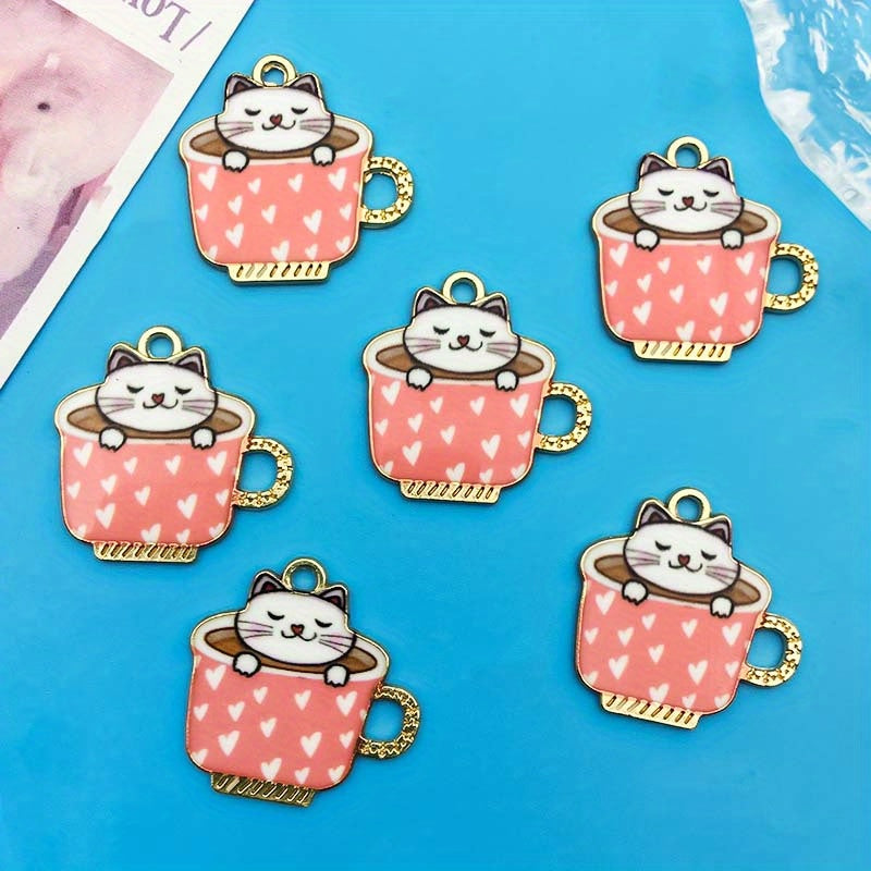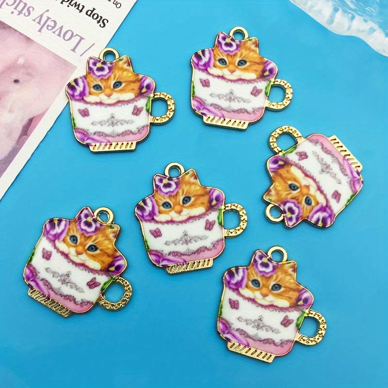 Create unique earrings, bracelets, necklaces, and accessories with these 6 enamel teacup cat alloy pendants. Perfect for crafters and cat lovers.