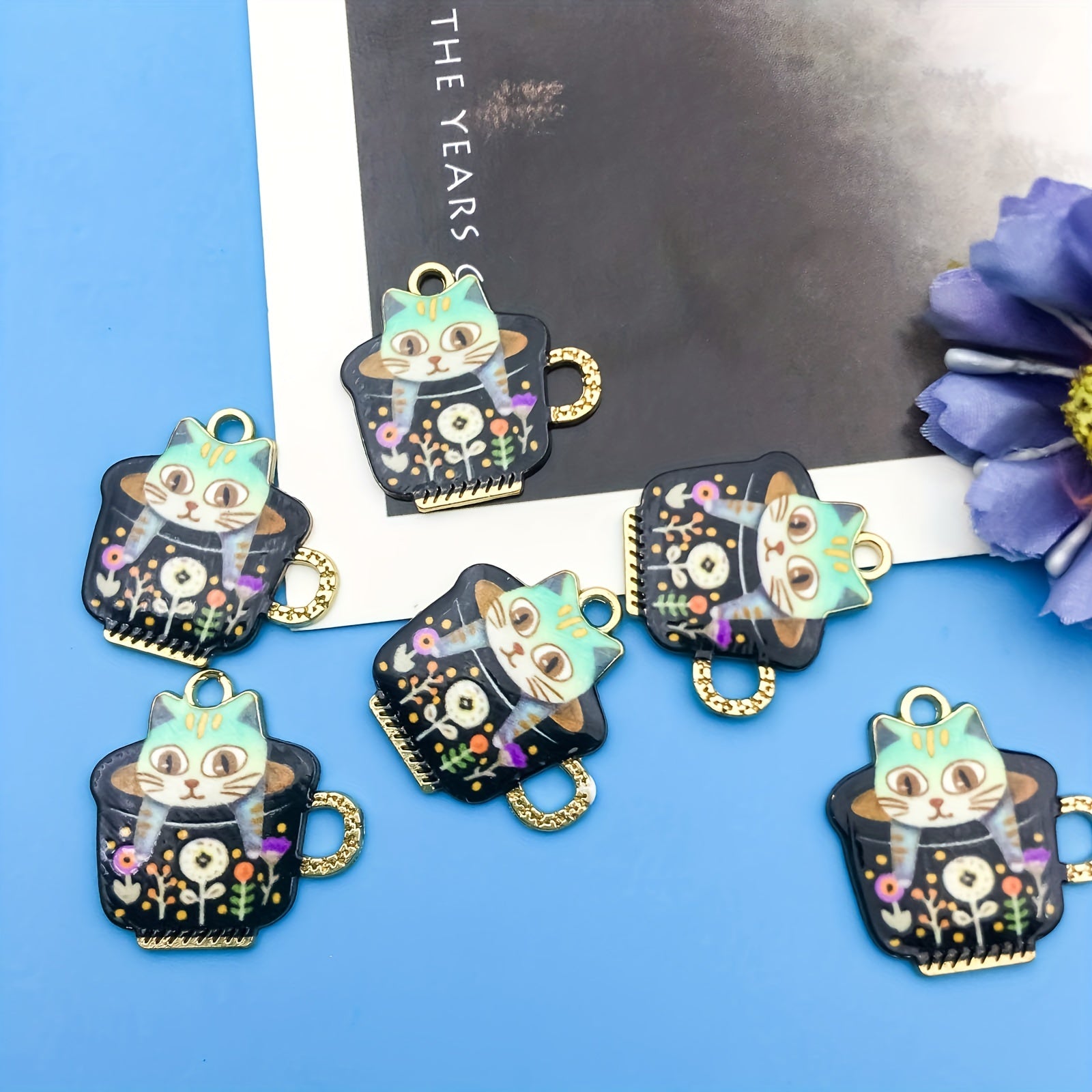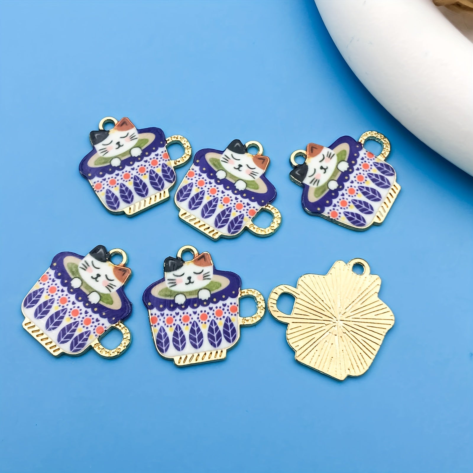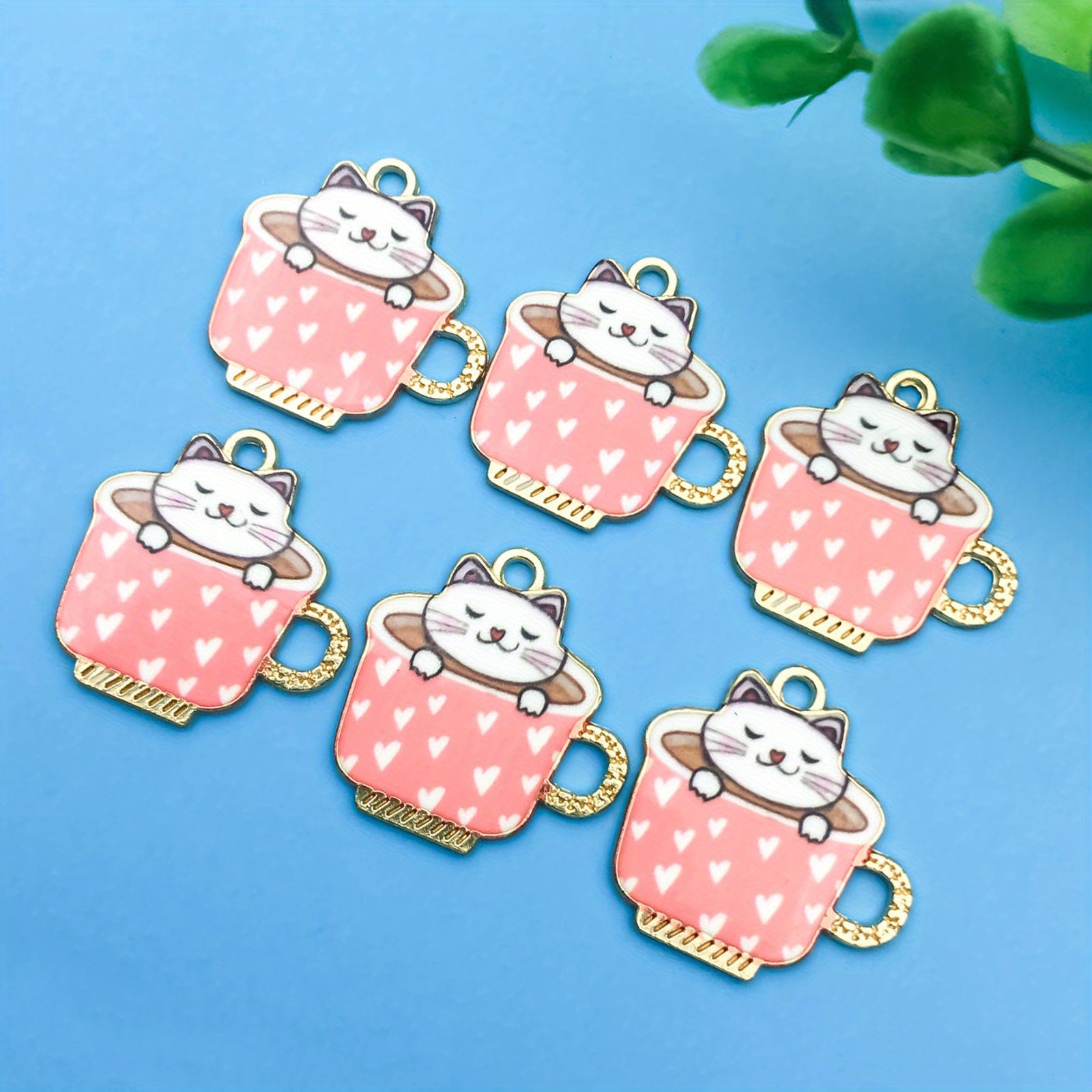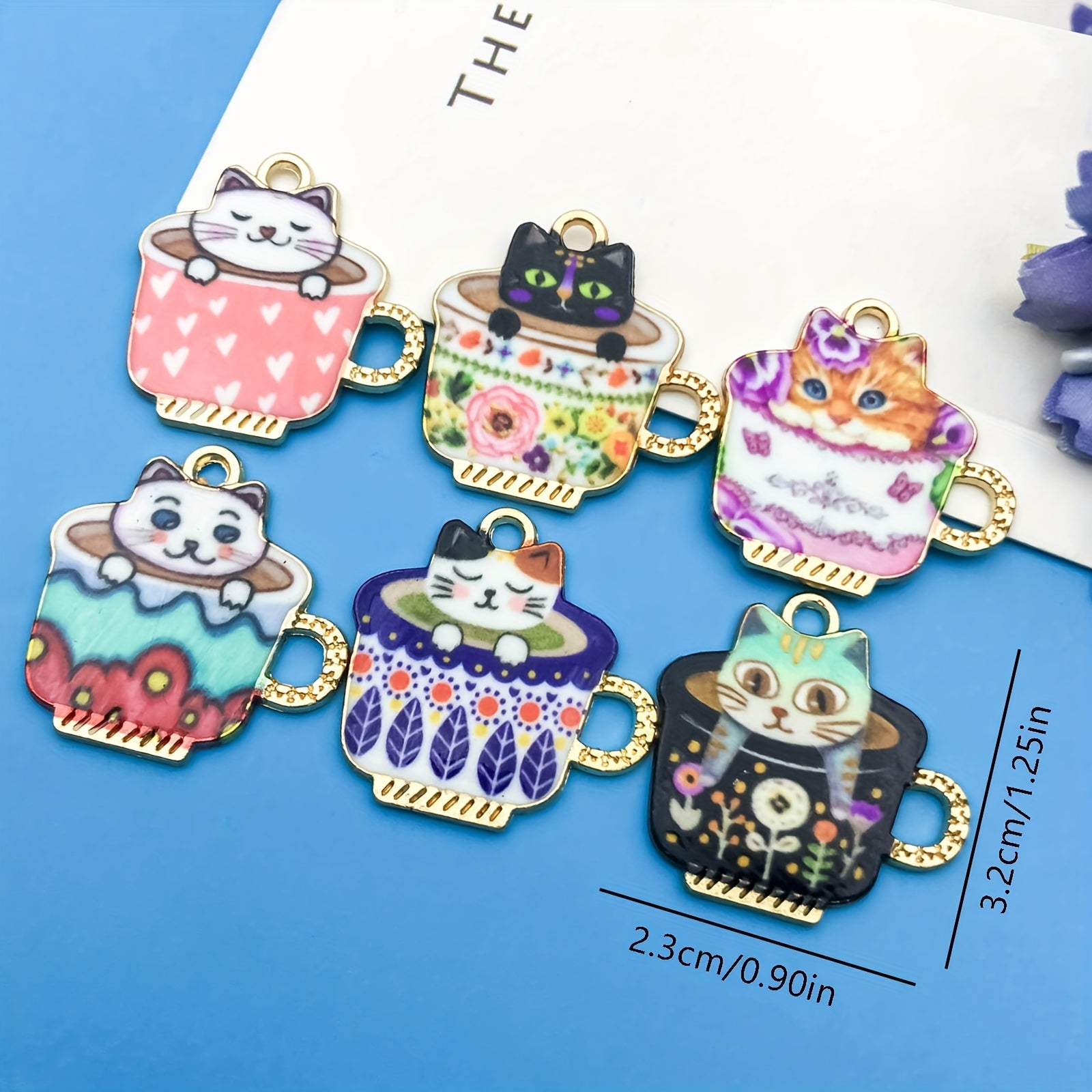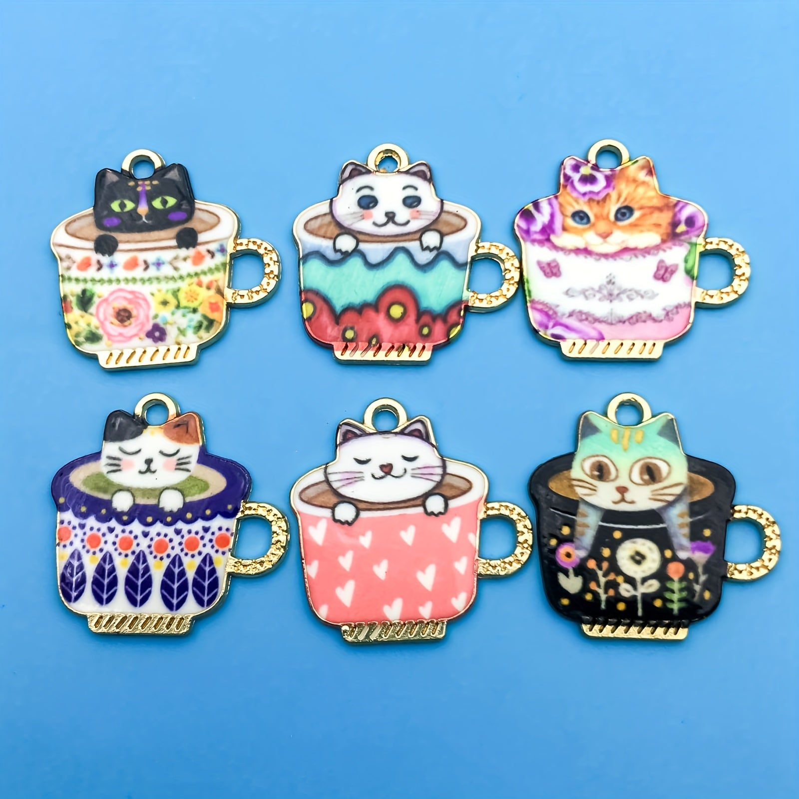 Add a touch of cuteness to your jewelry projects with this set of 6 alloy enamel tea cup cat pattern charms. Ideal for earrings, necklaces, bracelets, and keychains.