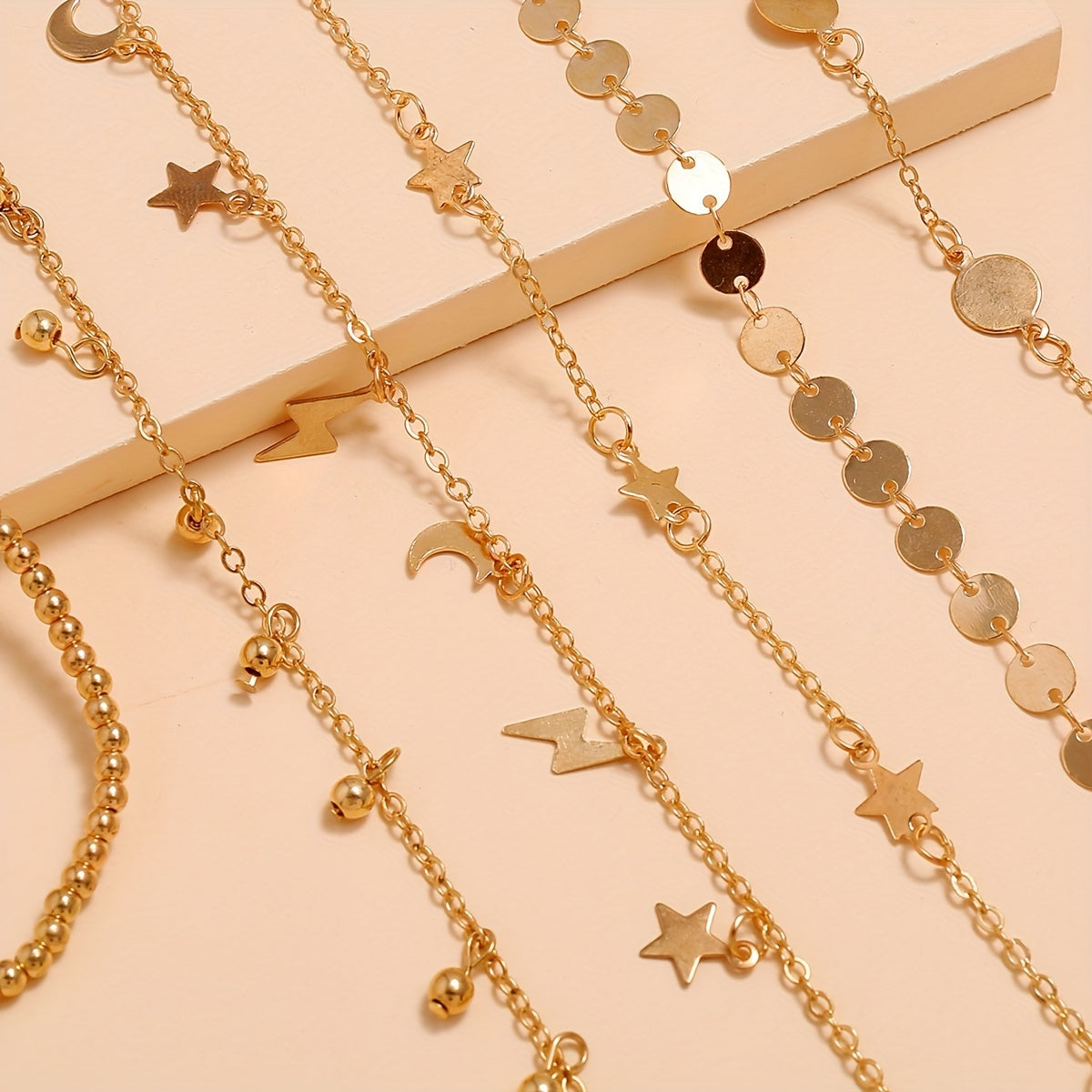 Add style to your outfit with this 6-piece set of men's anklets featuring lightning, moon, star, pentagram, water drop, and tassel designs. Perfect for adding a unique touch to your foot accessories collection.