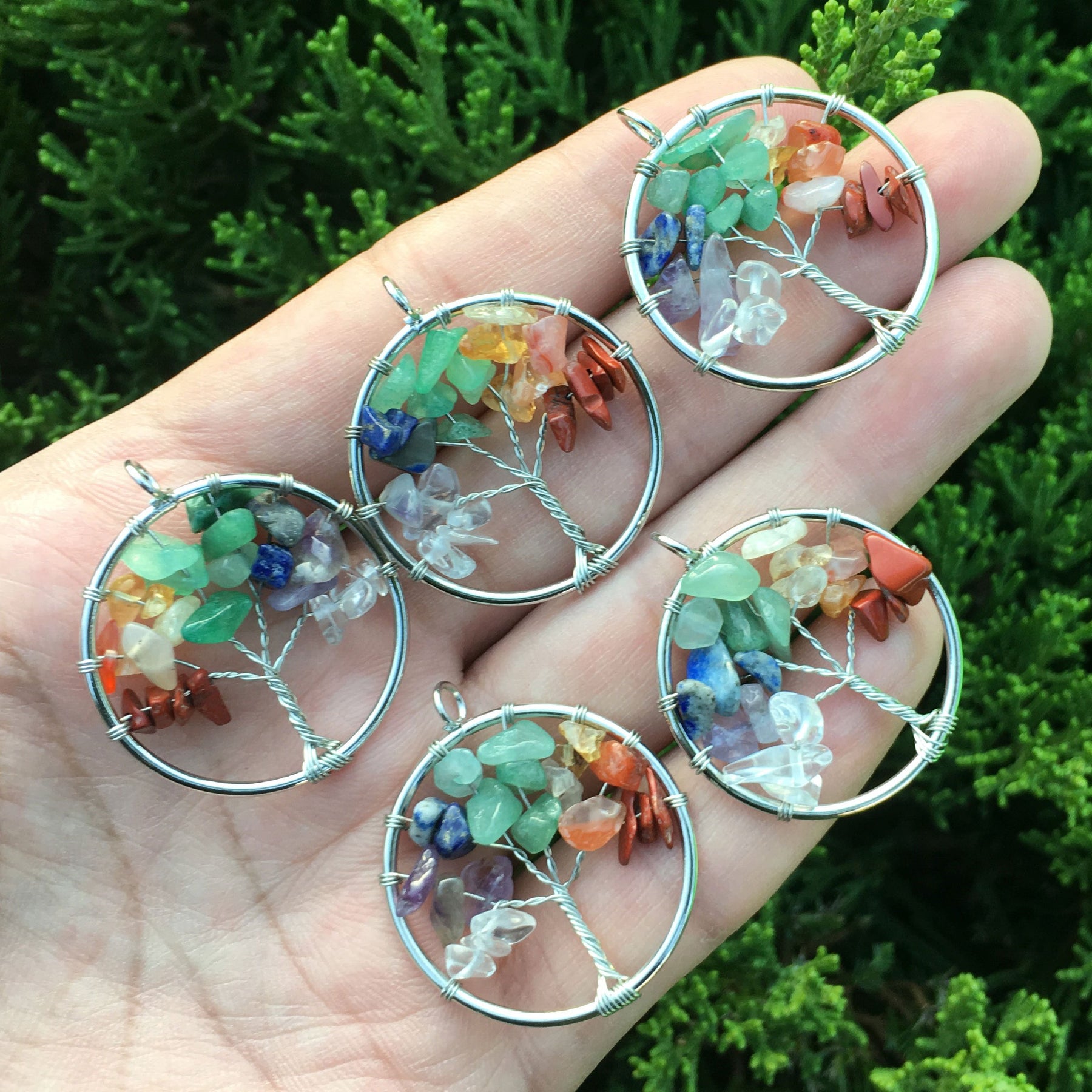 This beautiful pendant features 7 chakra stones arranged in a Tree of Life design. It is made of crystal beads and is believed to bring energy and balance to the wearer.