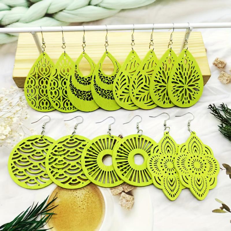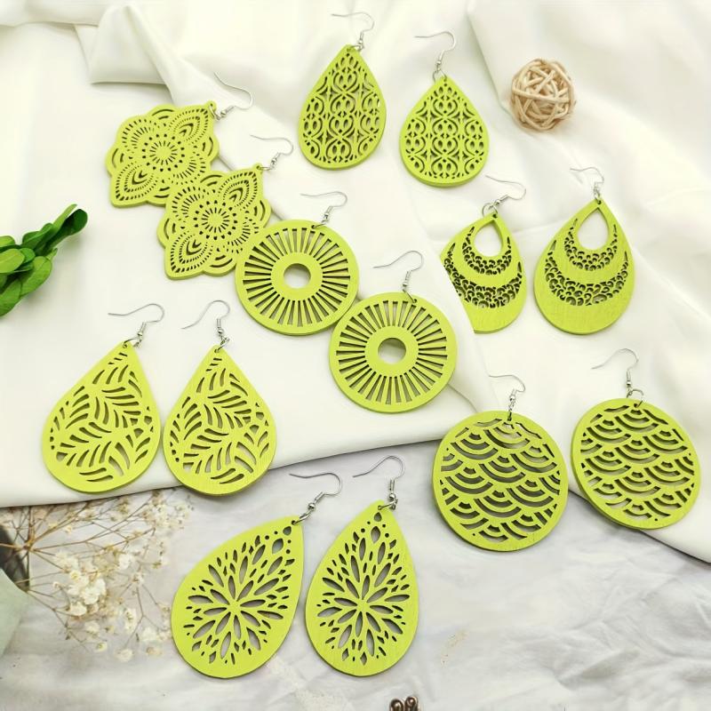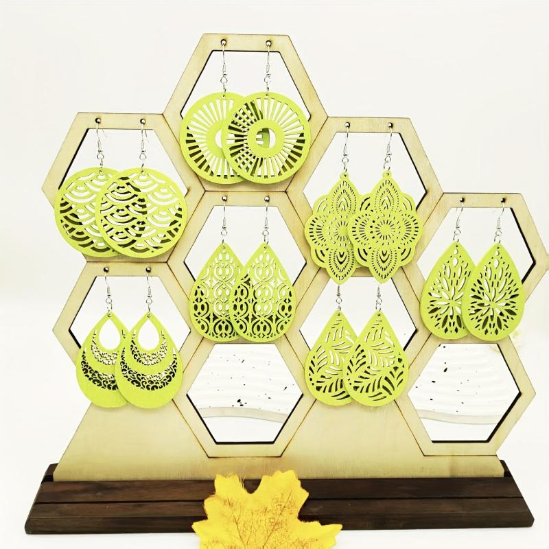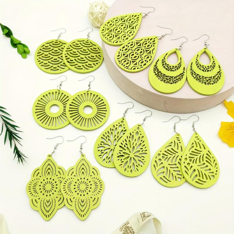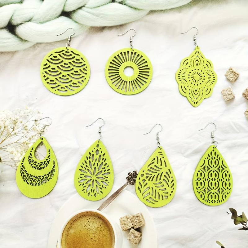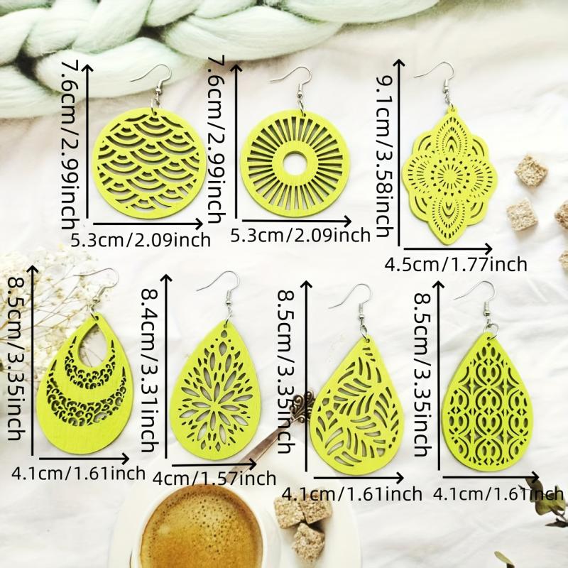 This set includes 7 pairs of stylish earrings with pendants crafted from hollow wooden material, perfect for daily outings, travel, and accessorizing in autumn and winter.