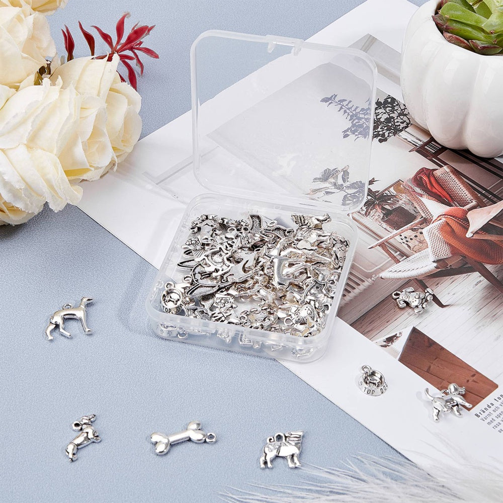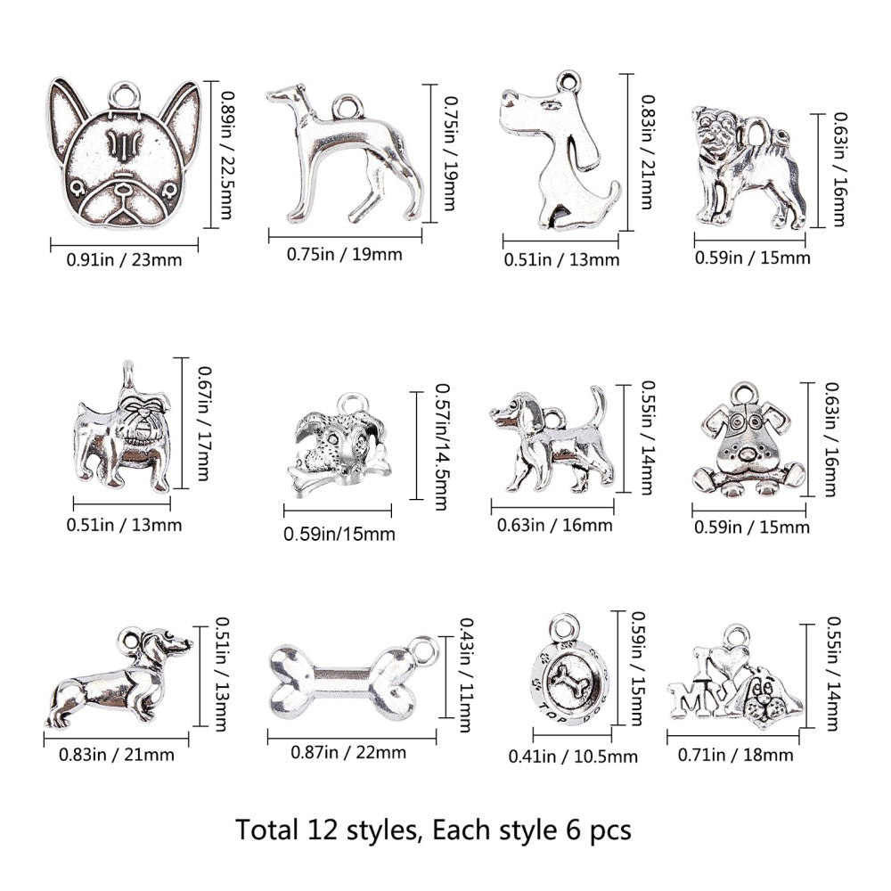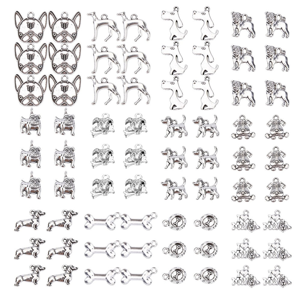 Explore your creativity with this set of 72 antique silver mixed shapes puppy alloy pendants perfect for crafting earrings, bracelets, necklaces, and various accessories.