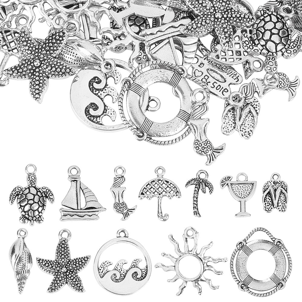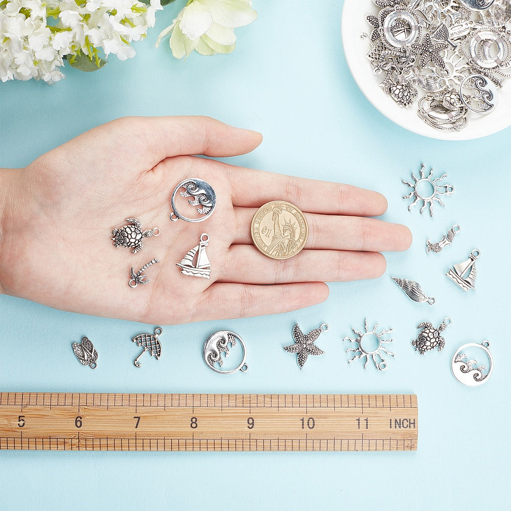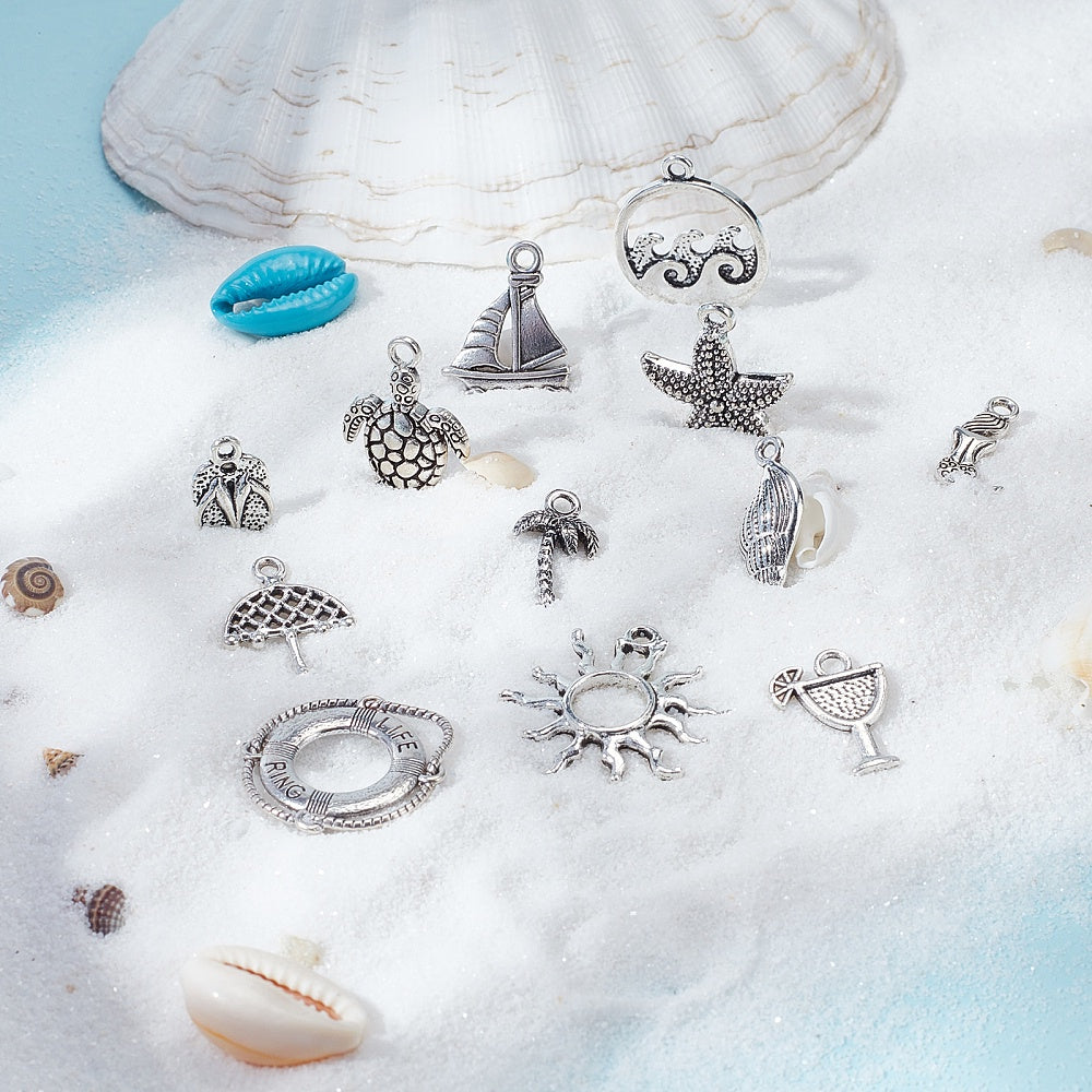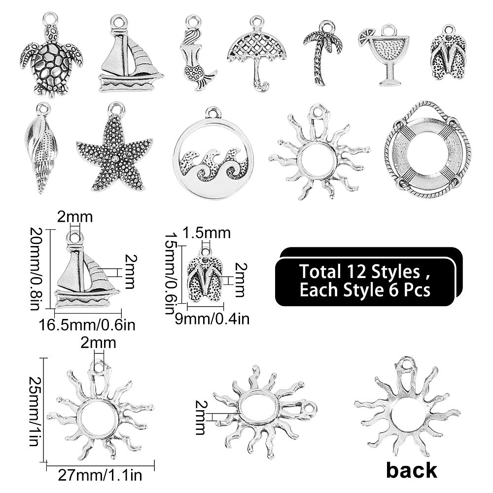 Add a touch of the sea to your jewelry creations with these 72 ocean-themed charms. Featuring 12 different styles including sea turtles, suns, and mermaids, these alloy charms are perfect for crafting beach-inspired jewelry.