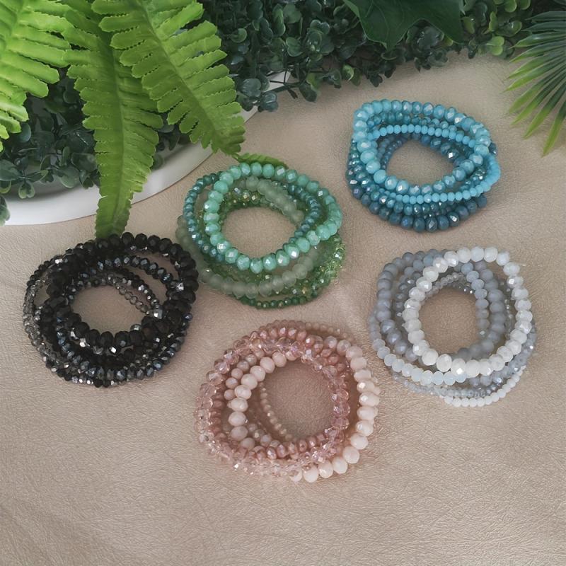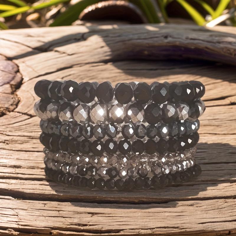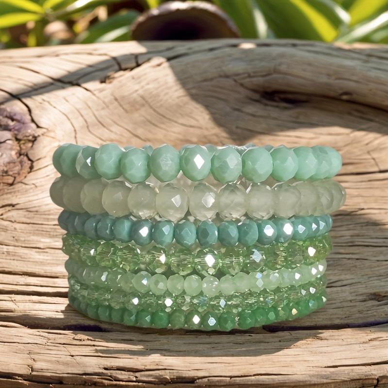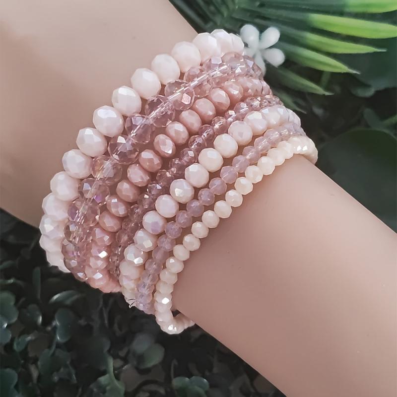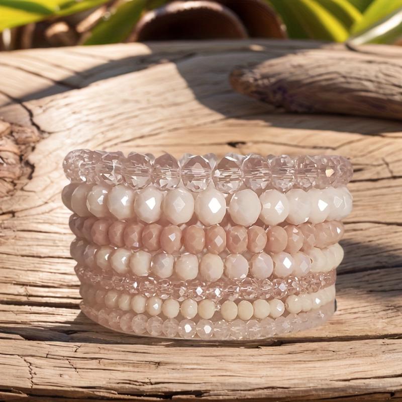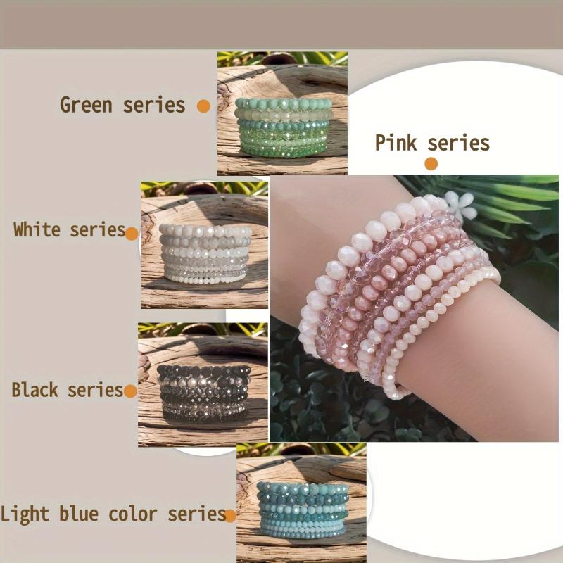 Elevate your style with this 7-piece Bohemian faceted glass beaded bracelet set in pastel spring and summer colors. Ideal for daily wear and holiday vacations, these bracelets add a touch of boho chic to any outfit.