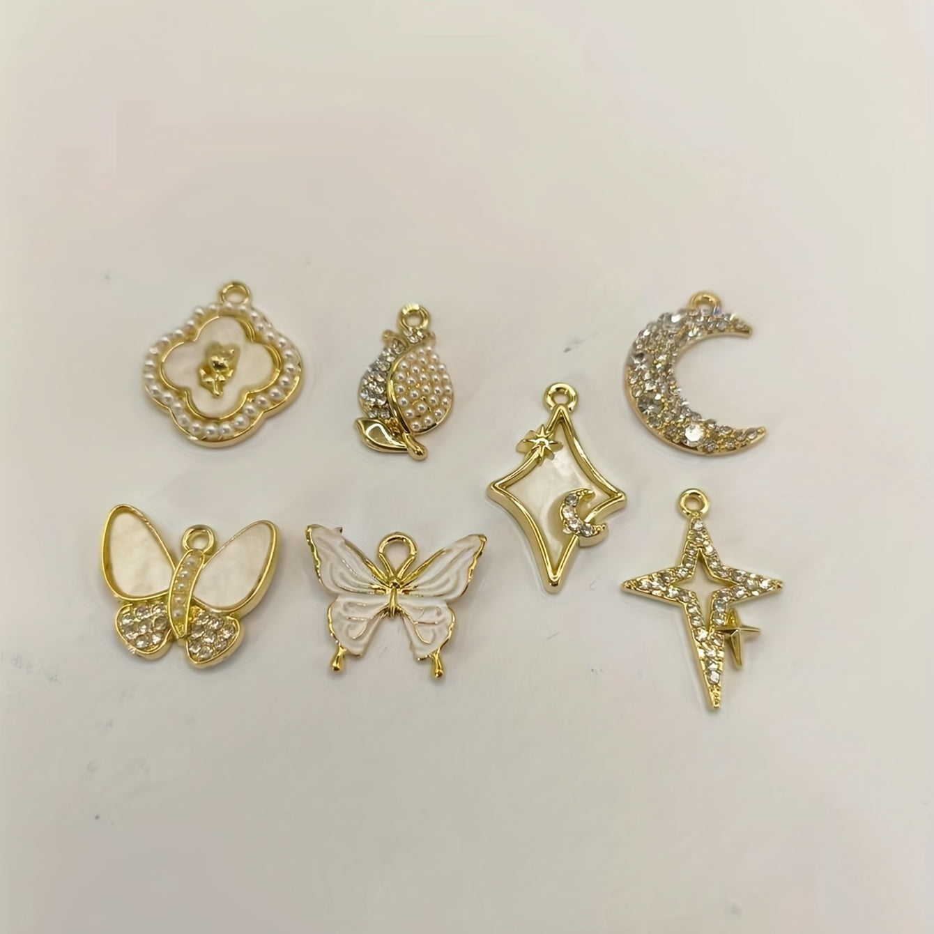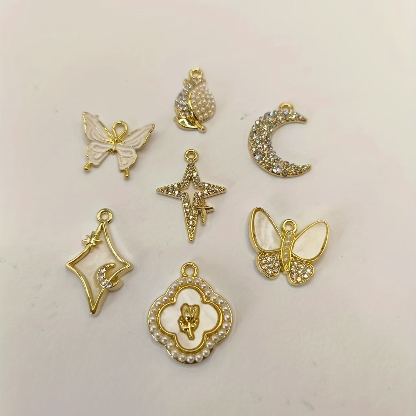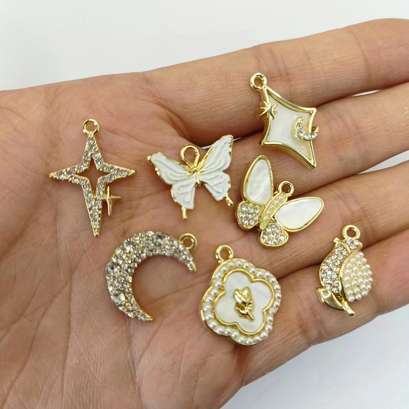 Enhance your jewelry creations with this set of 7 assorted shape alloy pendants featuring rhinestone decoration in a luxurious golden finish. Perfect for earrings, bracelets, necklaces, and other accessories.