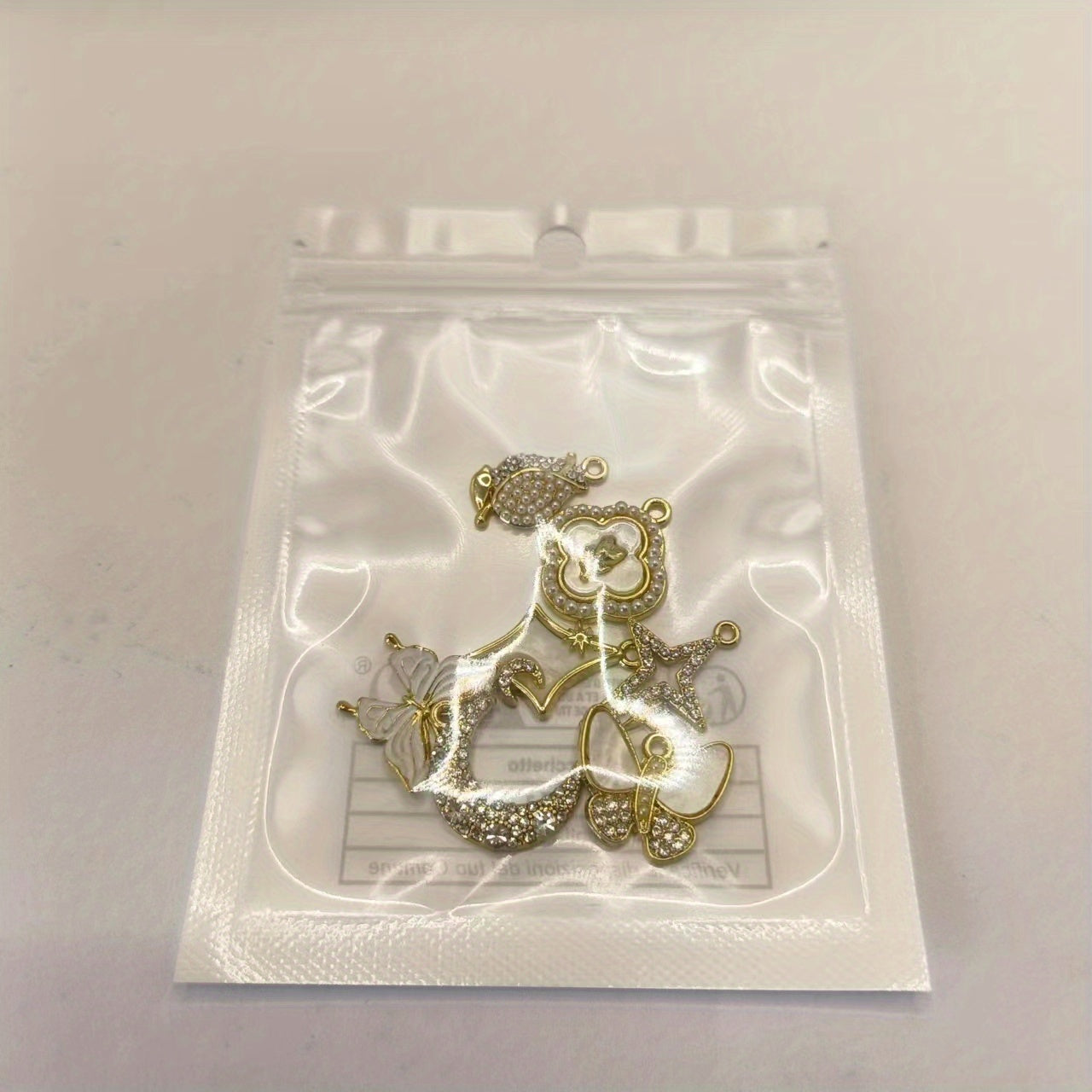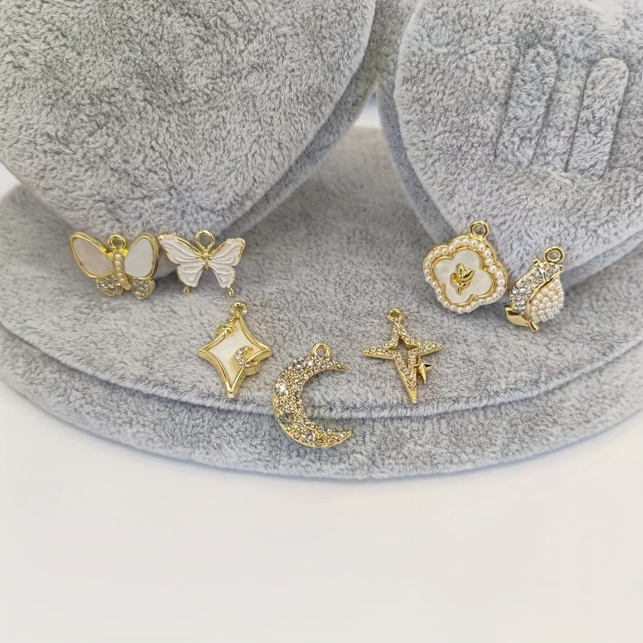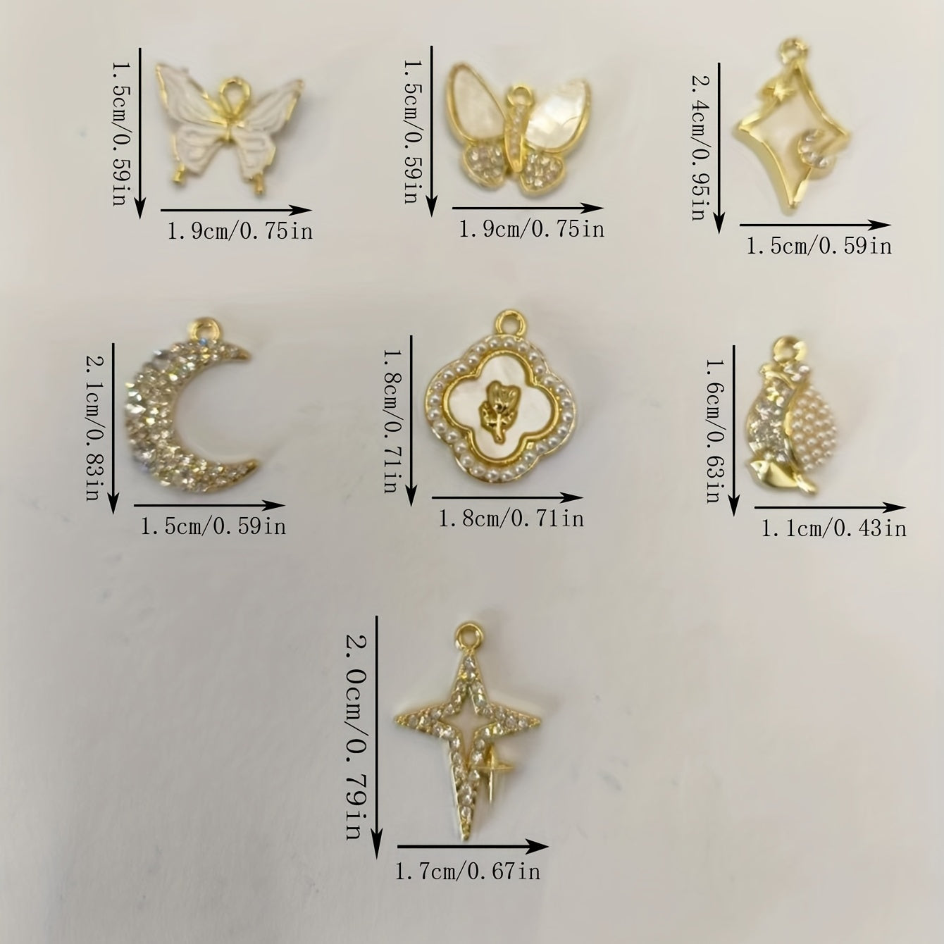 Enhance your jewelry creations with this set of 7 assorted shape alloy pendants featuring rhinestone decoration in a luxurious golden finish. Perfect for earrings, bracelets, necklaces, and other accessories.