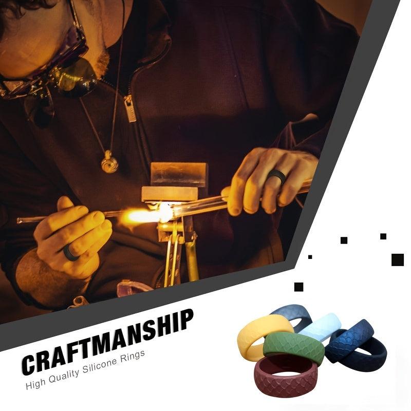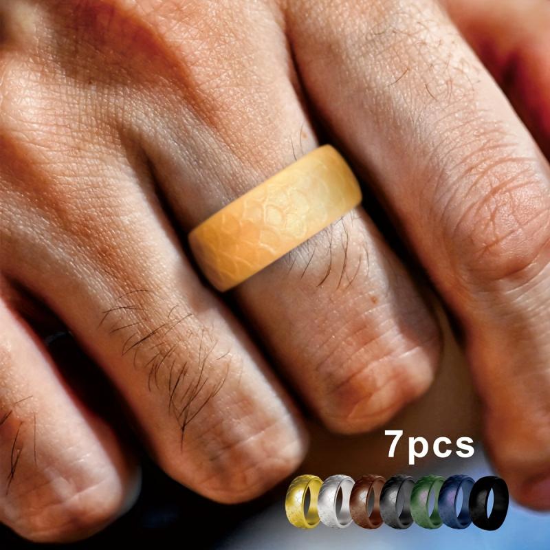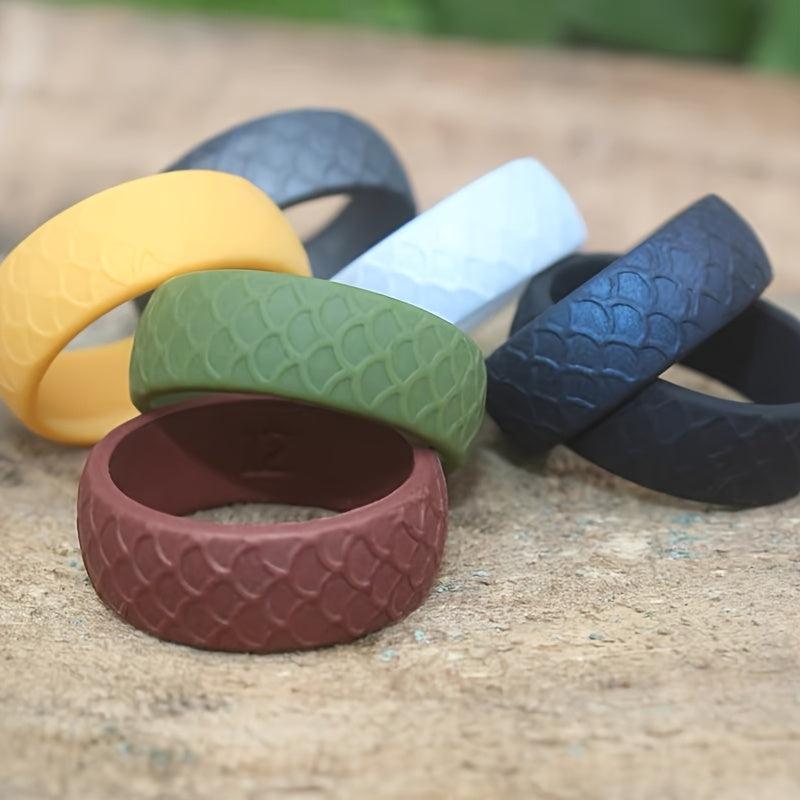 These sleek and comfortable rings are ideal for daily wear, proposals, weddings, and outdoor activities. Made of 8.7mm silicone with a fish scale pattern.