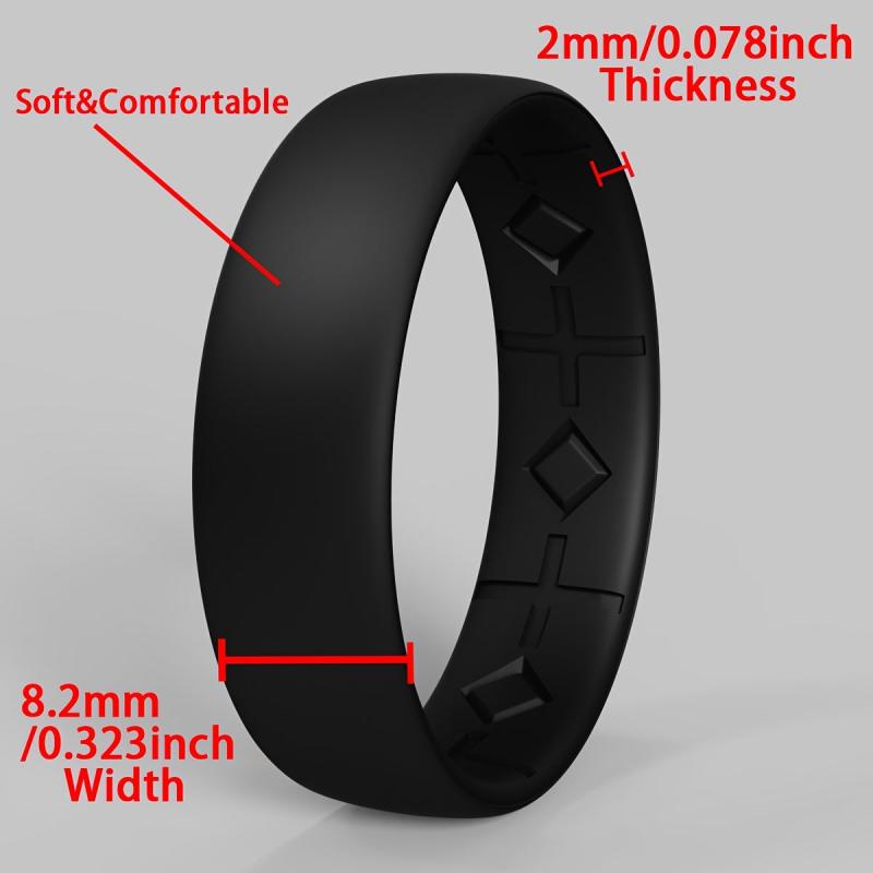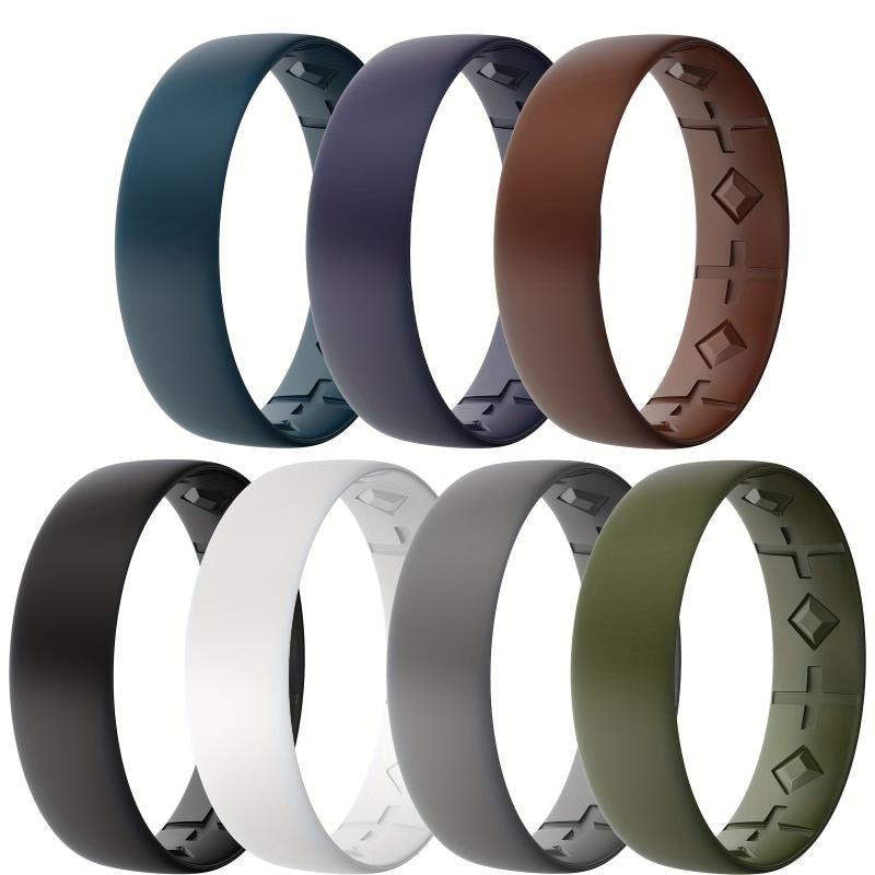 This silicone ring set includes 7 rings with cross and diamond patterns that are perfect for both men and women. The rings are made of breathable silicone material.