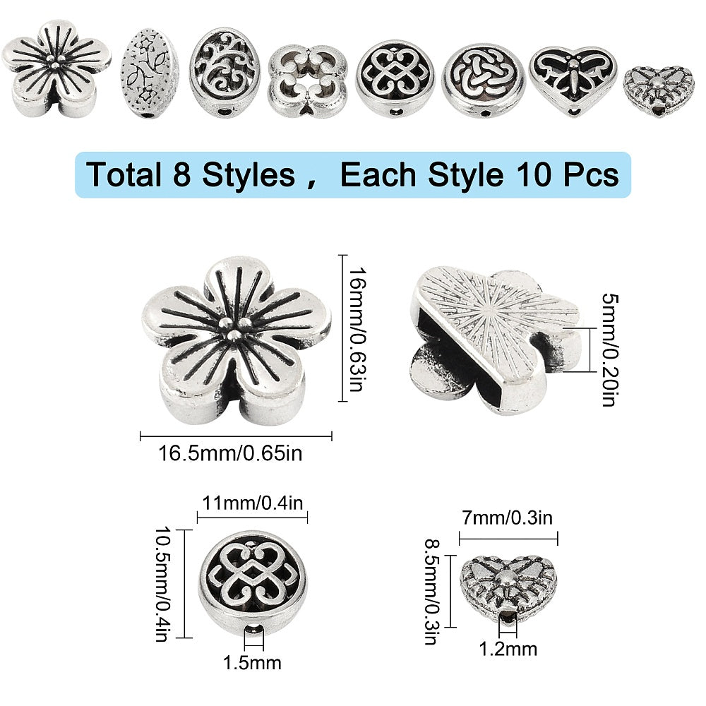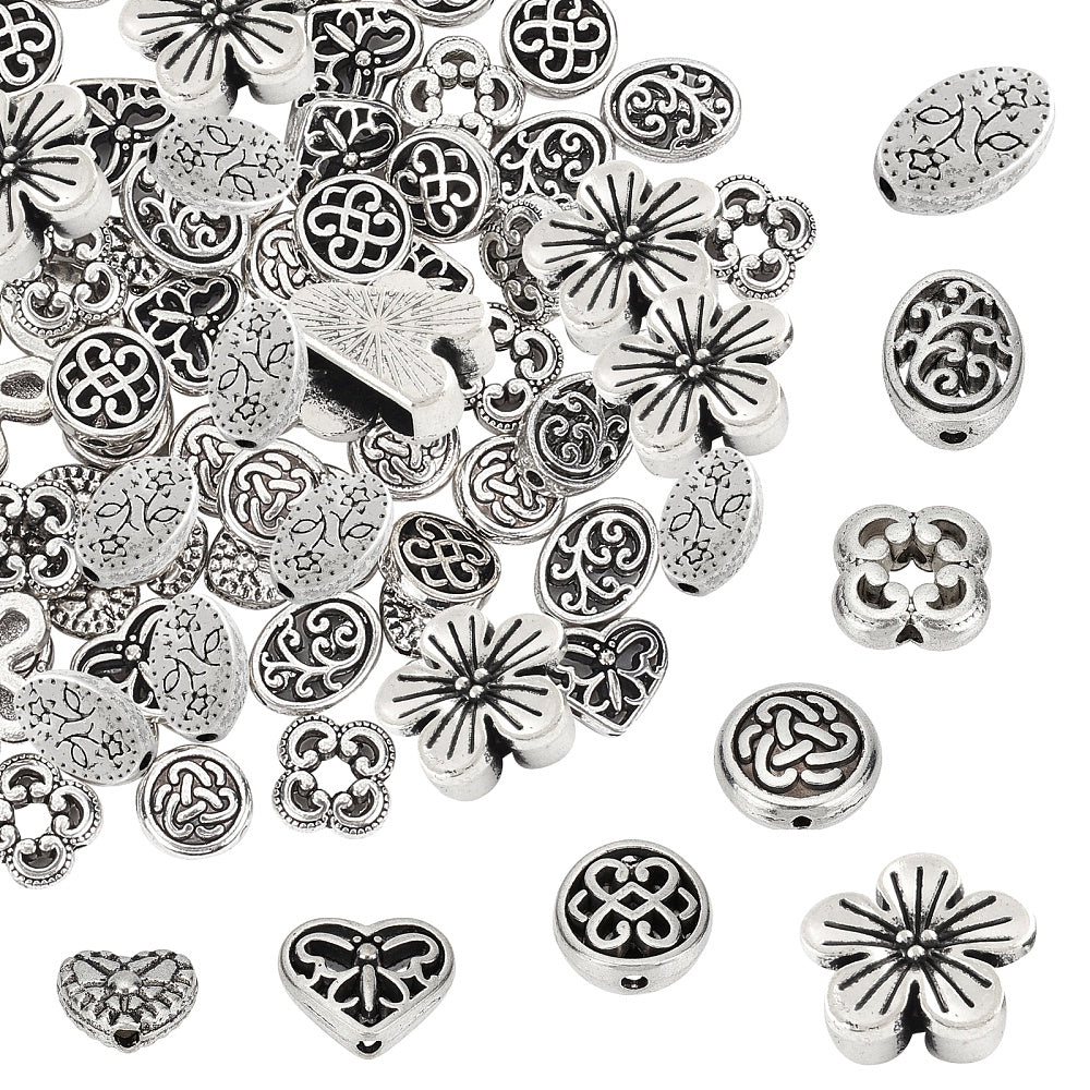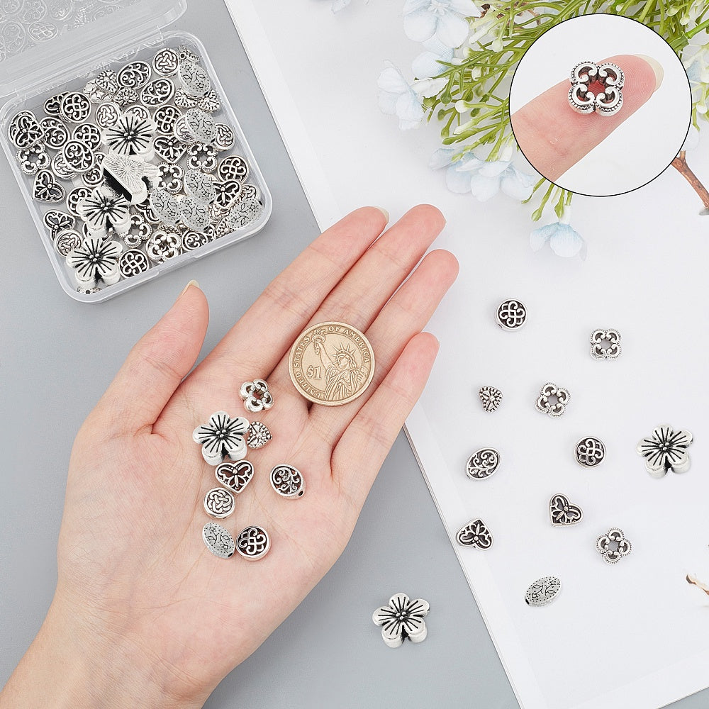Get creative with this set of 80 antique silvery flower, heart, flat round, and oval shape alloy beads. Perfect for crafting earrings, bracelets, necklaces, and more.