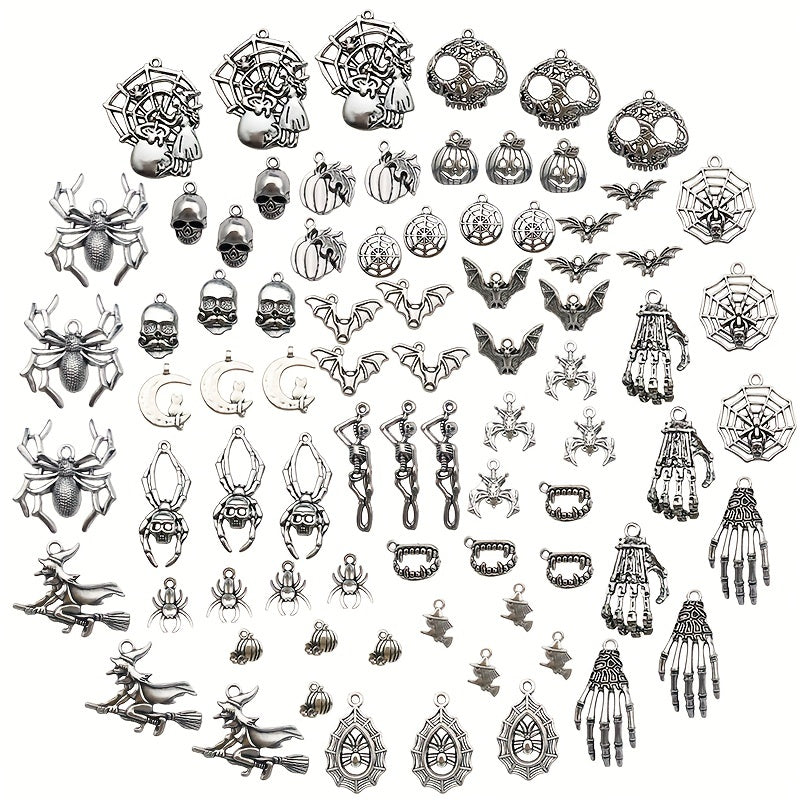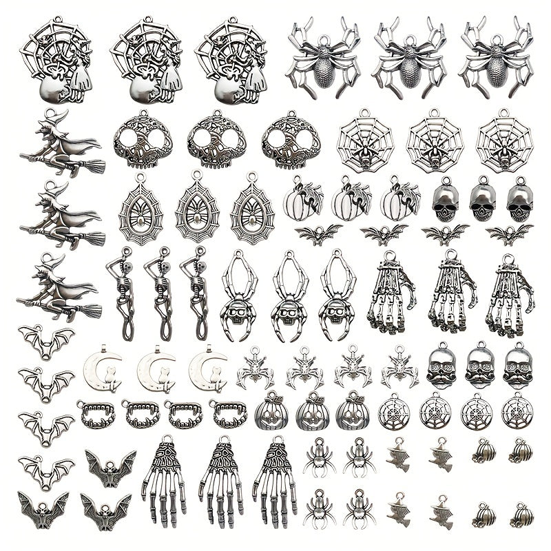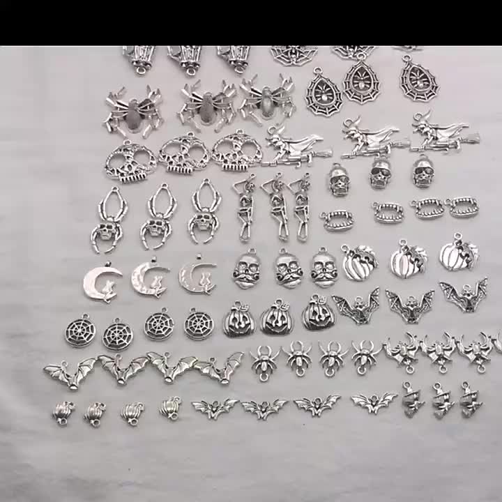 Get a spooky Halloween vibe with this set of 80 mixed pumpkin, skull, bat, hand claw, and witch alloy pendants. Perfect for creating earrings, bracelets, necklaces, and other accessories.