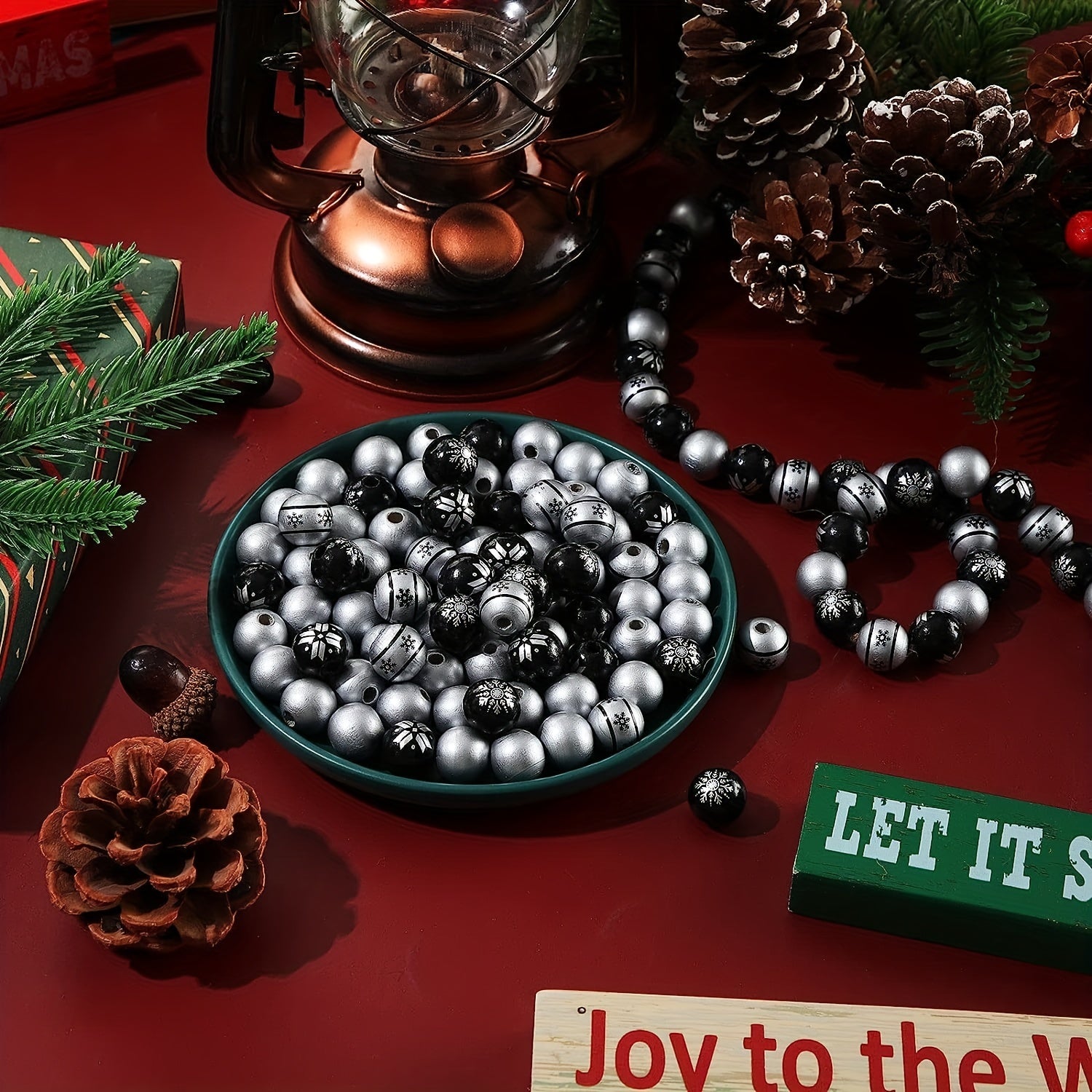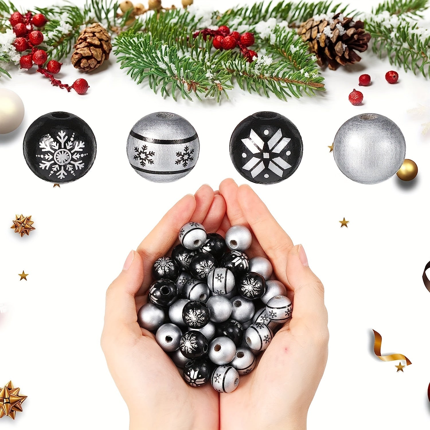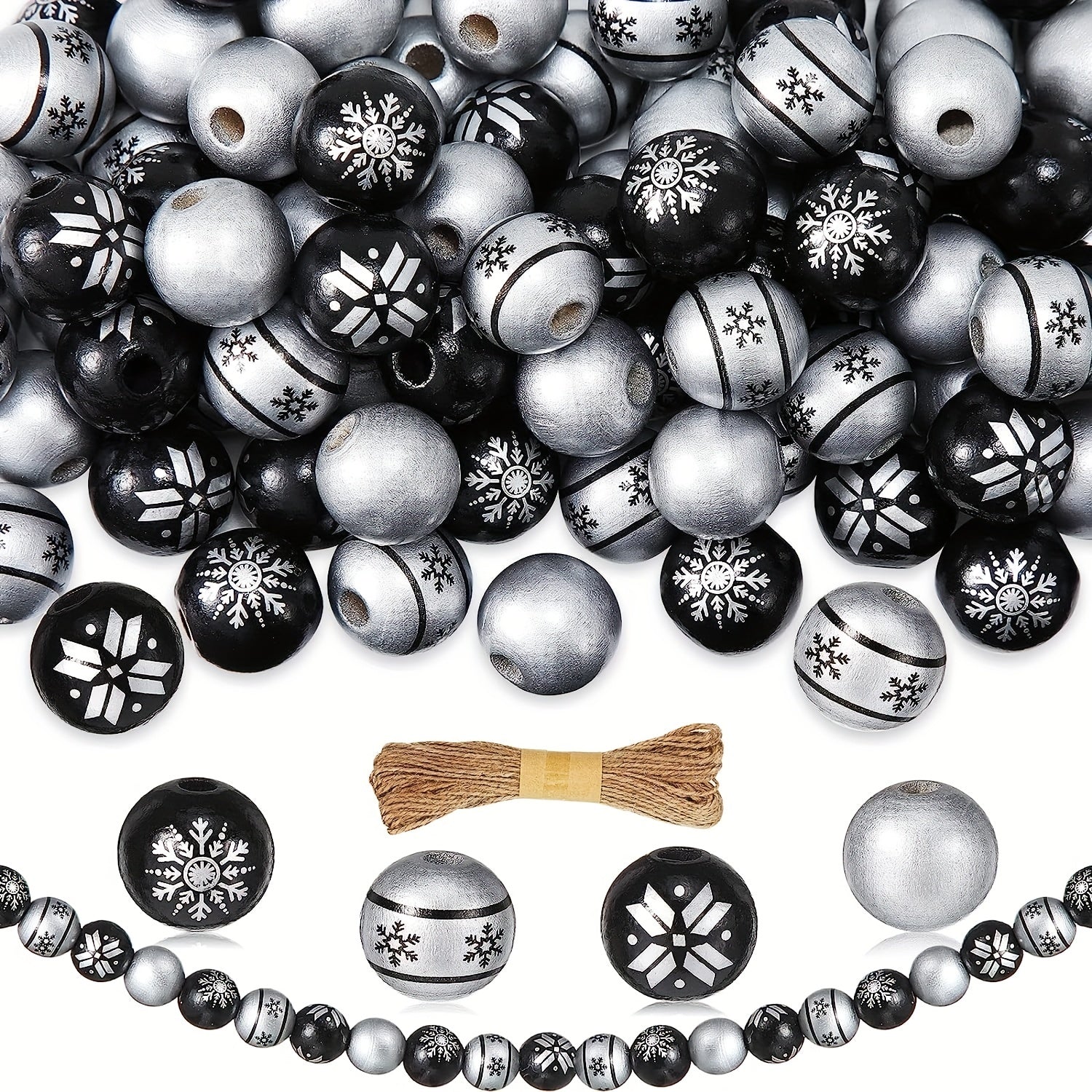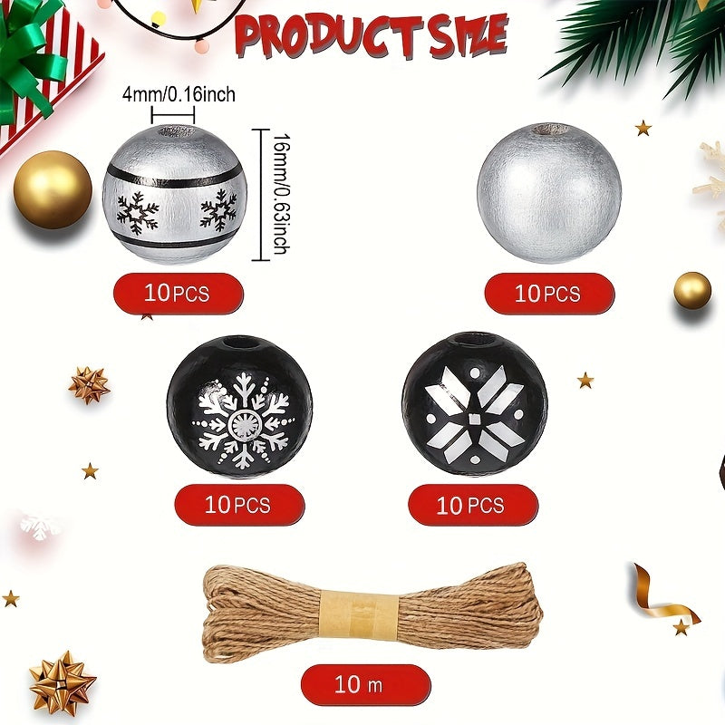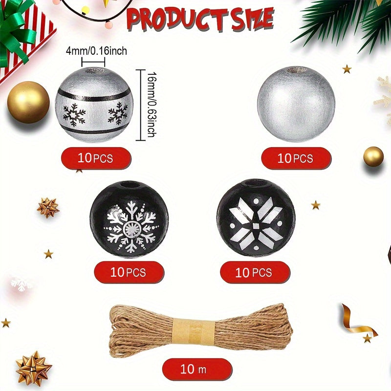 Create beautiful jewelry pieces with these silver wooden beads in Christmas-inspired designs. The set includes 80 round beads and hemp rope for crafting earrings, bracelets, necklaces, and more.