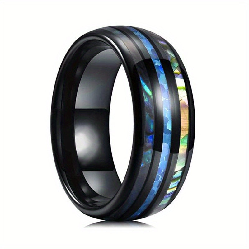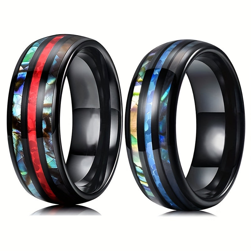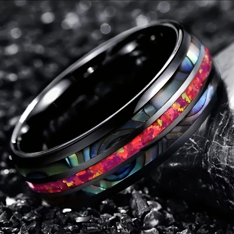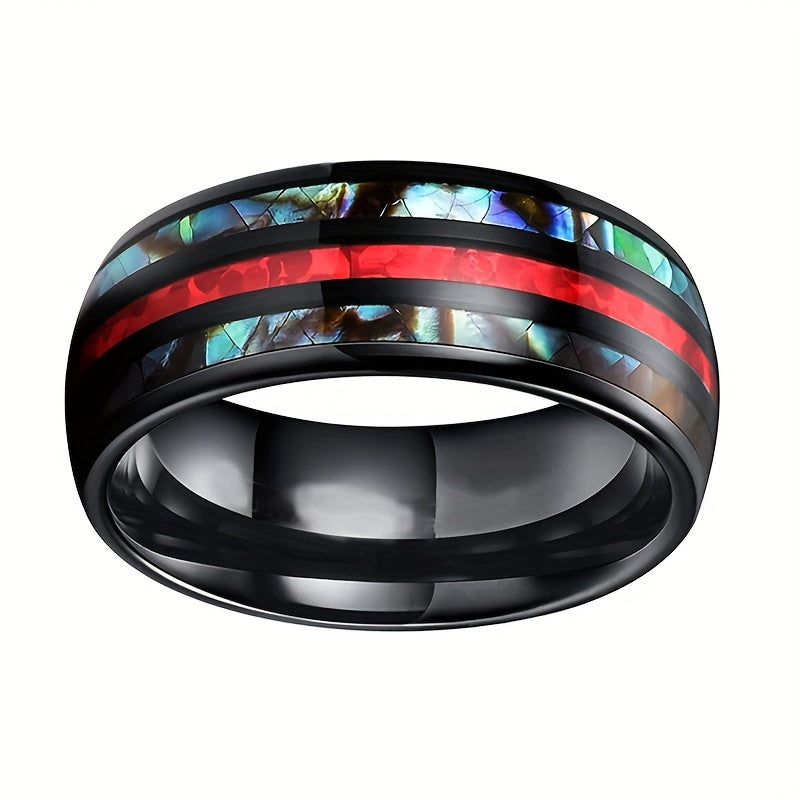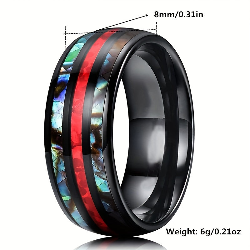 This stylish ring features an 8mm abalone shell with a red ribbon pattern in durable titanium steel, perfect for men.