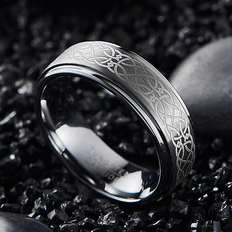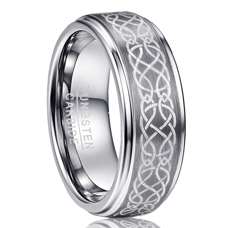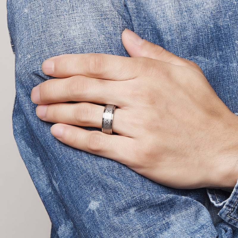 This men's tungsten ring features a 8mm wide laser engraved pattern design. Made from natural tungsten, it offers durability and style. Available in size 7 to 14.