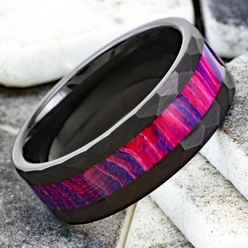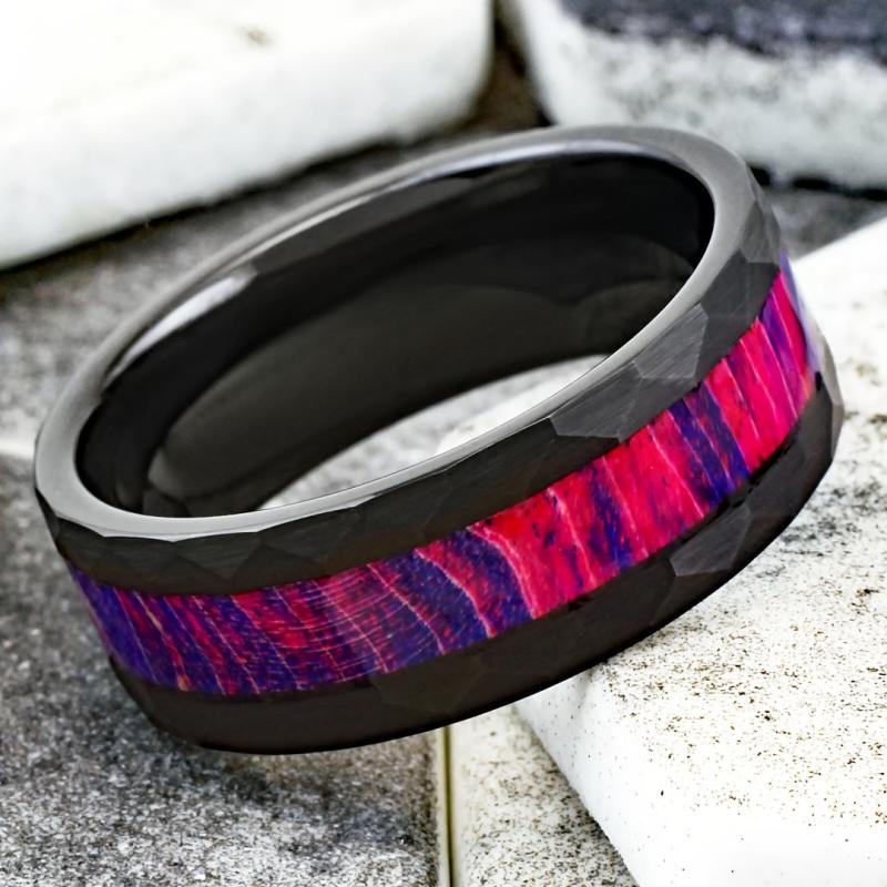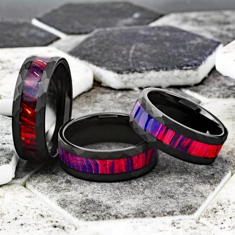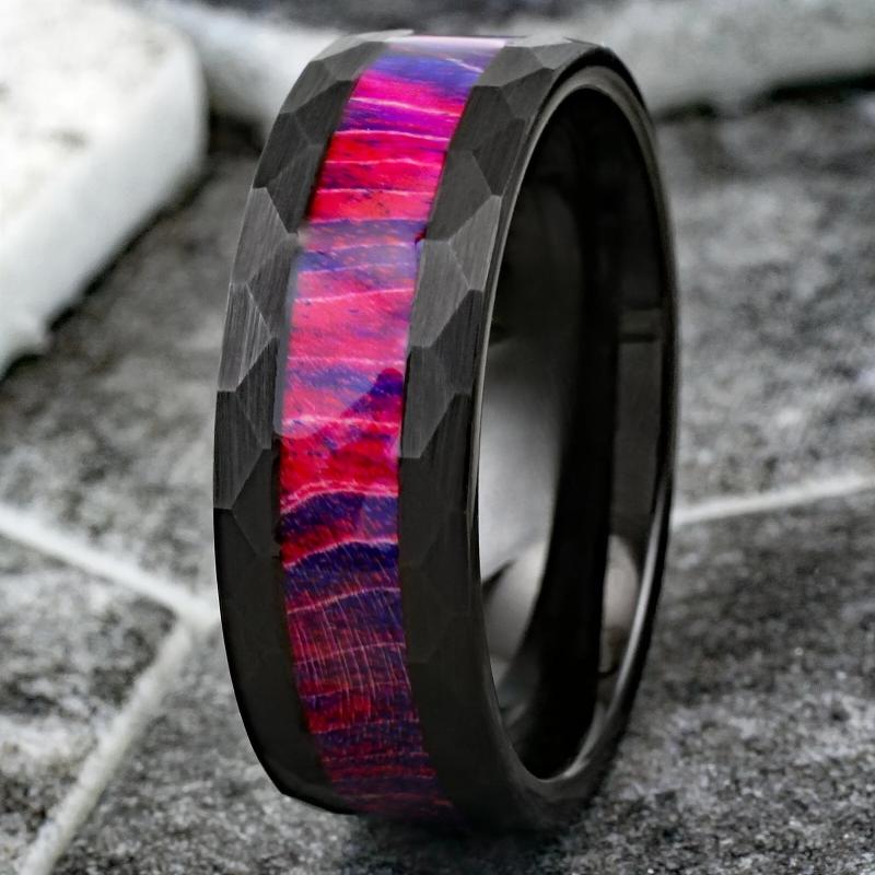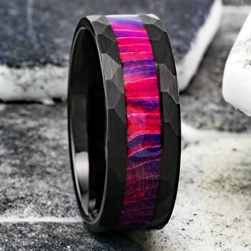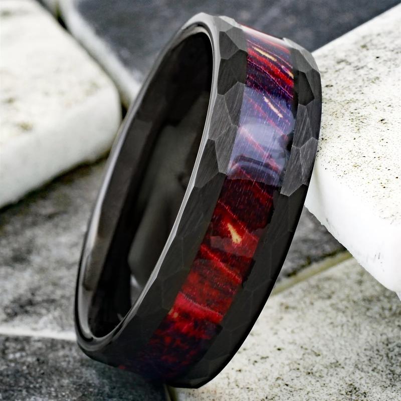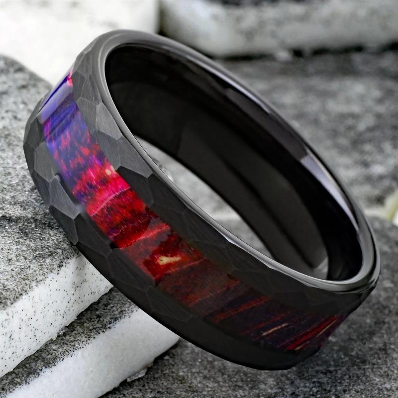 This 8mm men's wedding band features a unique tribal style design with faceted and red wood multicolor inlays. Made from 316L stainless steel, it is durable and stylish for daily wear.