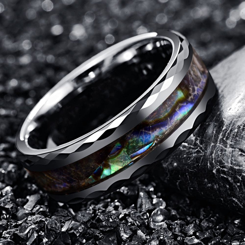 This men's tungsten ring features a silver gray design with faceted edge inlaid abalone pattern. Size options range from 7 to 14.