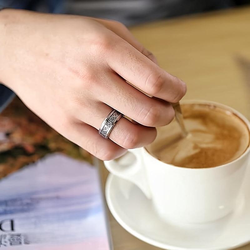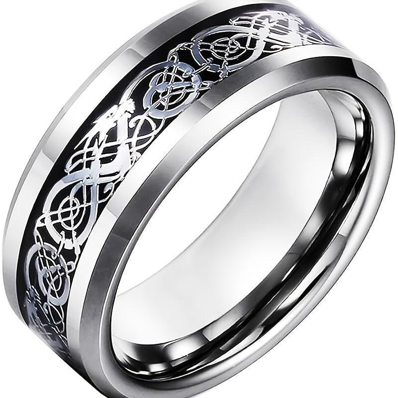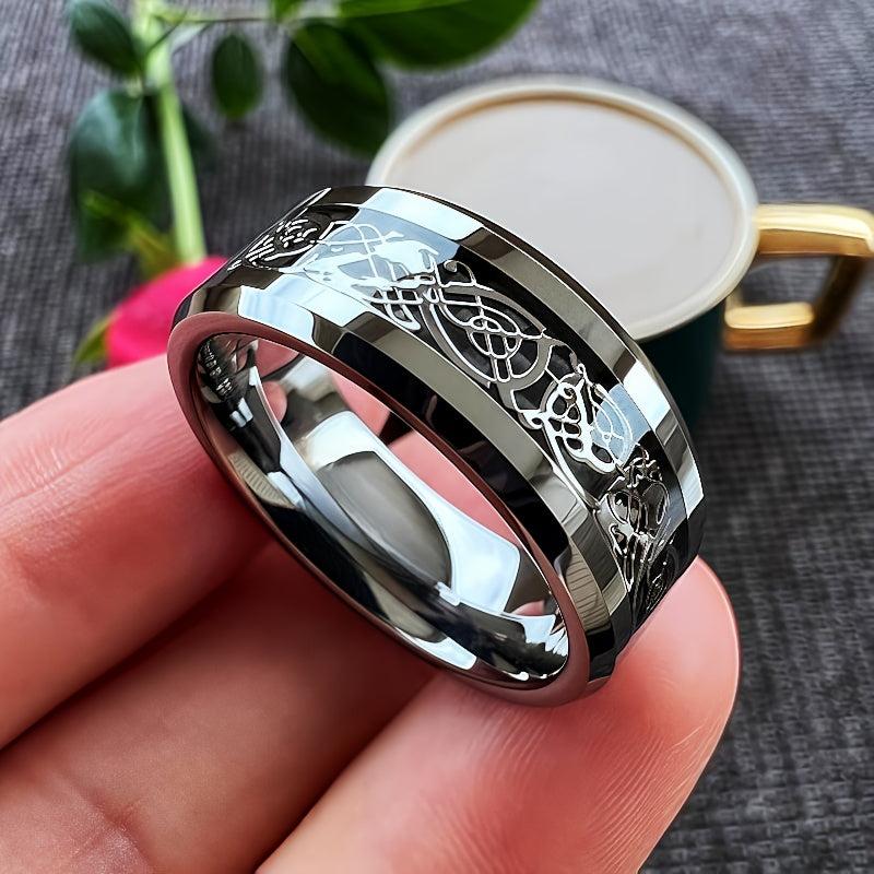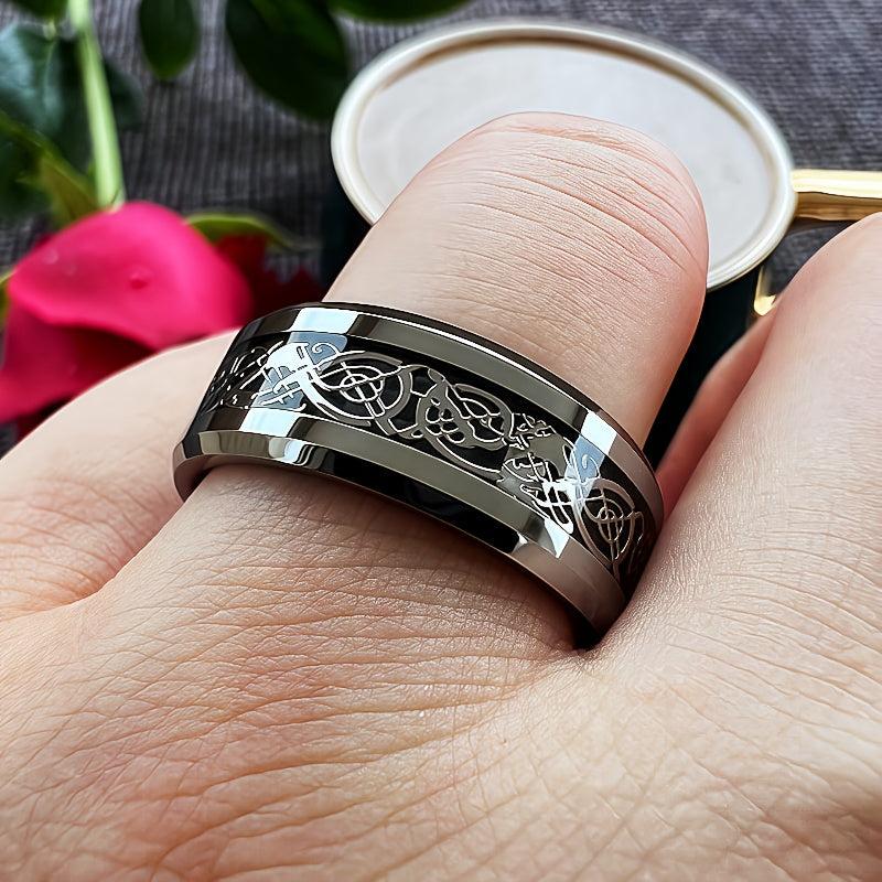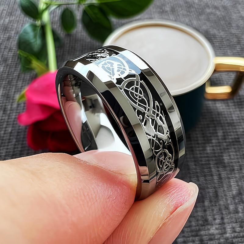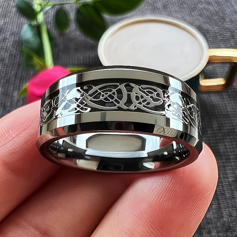 This 8mm silvery stainless steel ring features a Celtic design with carbon fiber inlay, perfect for weddings or everyday wear. Available for both men and women.