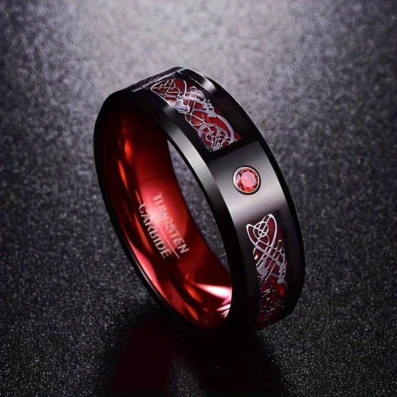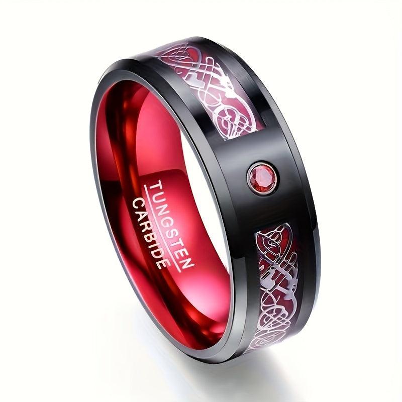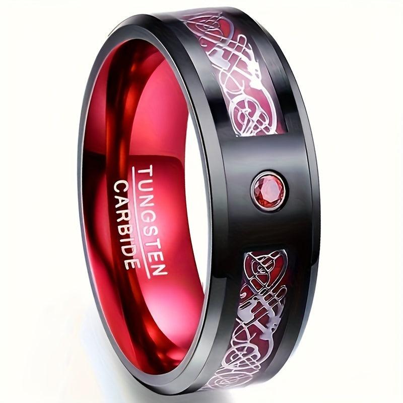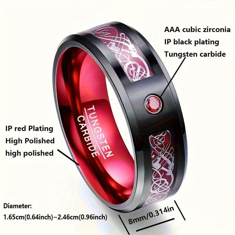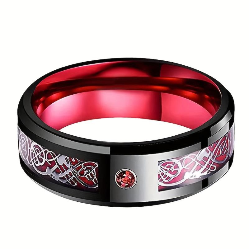 This 8mm tungsten ring features a vintage Celtic knot and dragon inlay design with a red cubic synthetic zirconia. Perfect for engagement or anniversary.