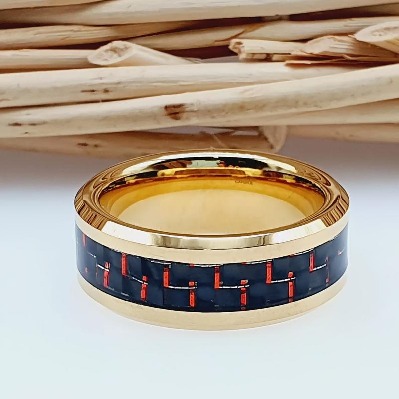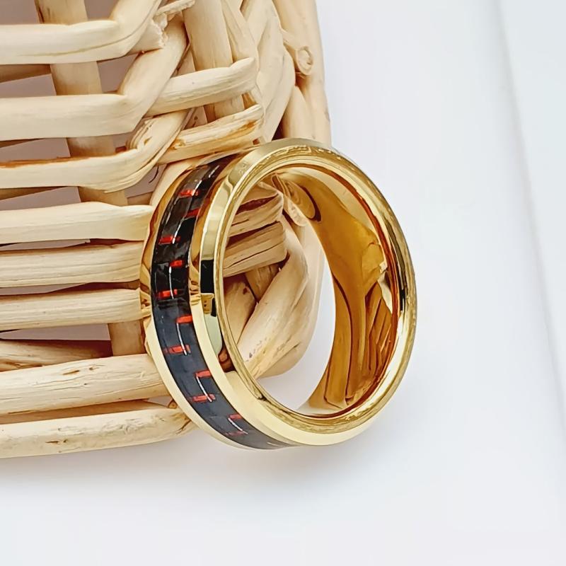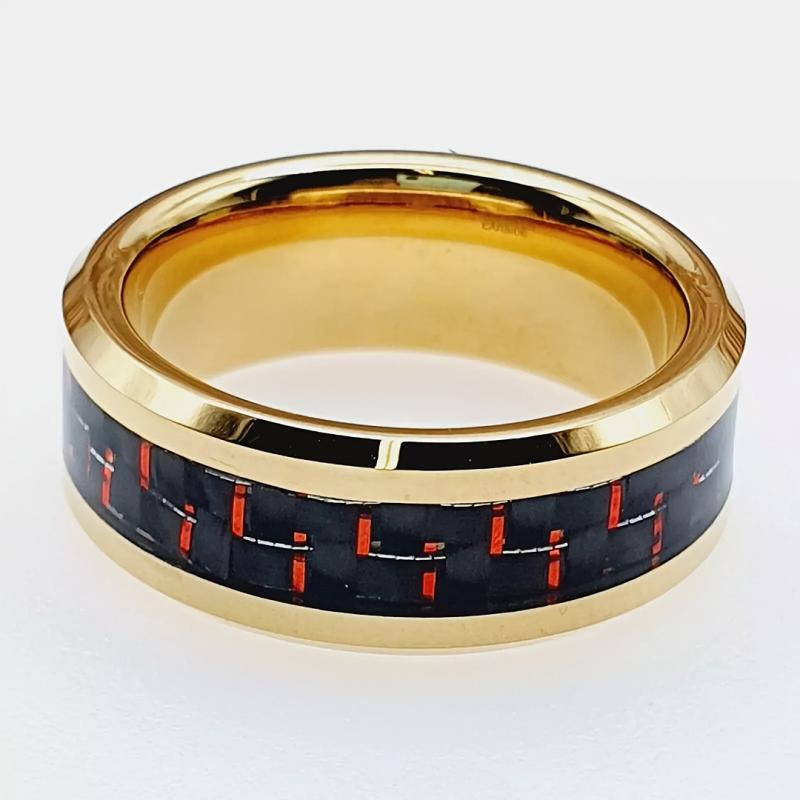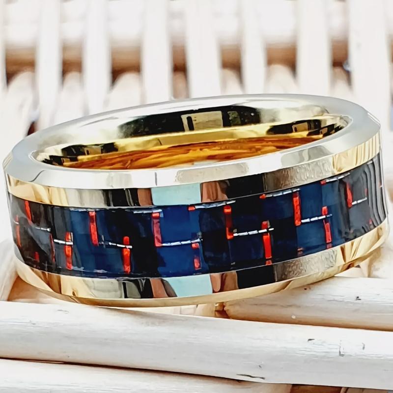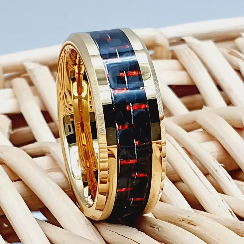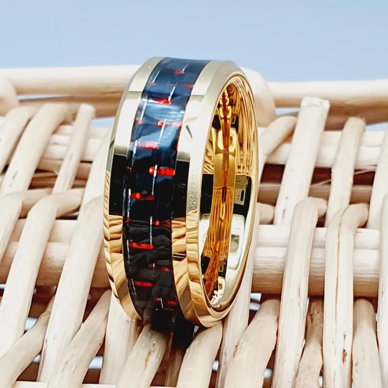 This 8mm tungsten wedding ring features a striking red carbon fiber inlay and beveled edges for a modern look. Its comfort fit design ensures all-day wearability.