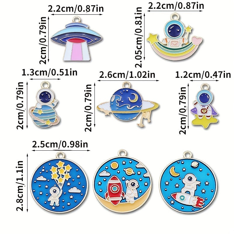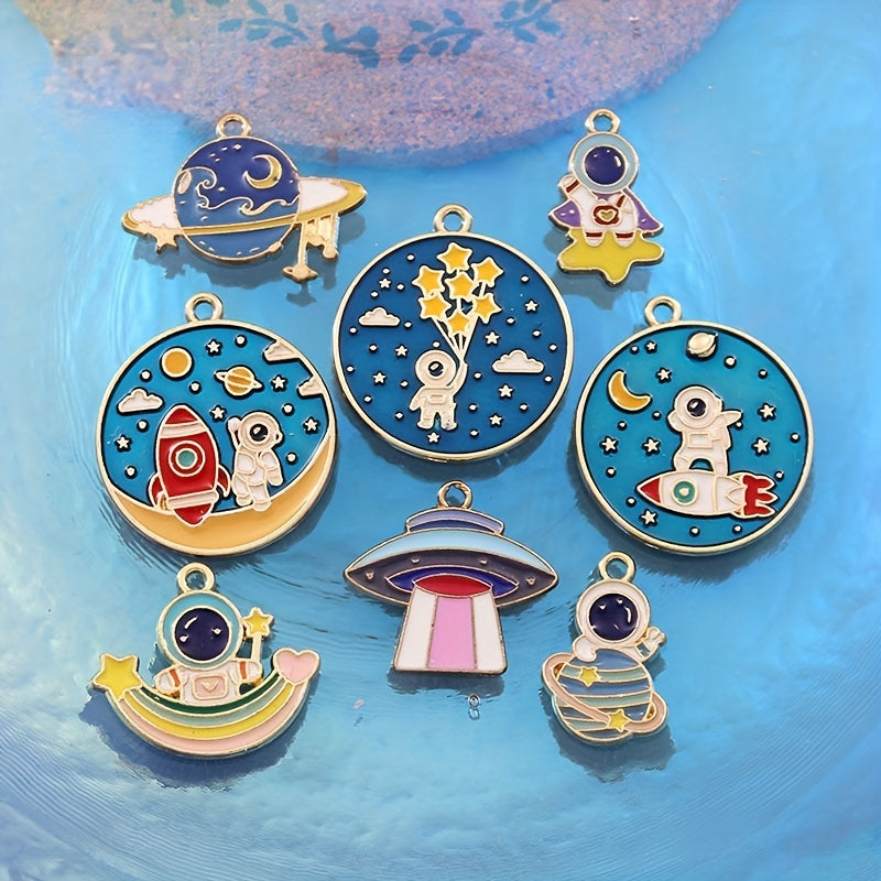 Explore the universe with these 8 mixed alloy planet and astronaut pendants to create personalized bracelets, necklaces, key chains, and more!