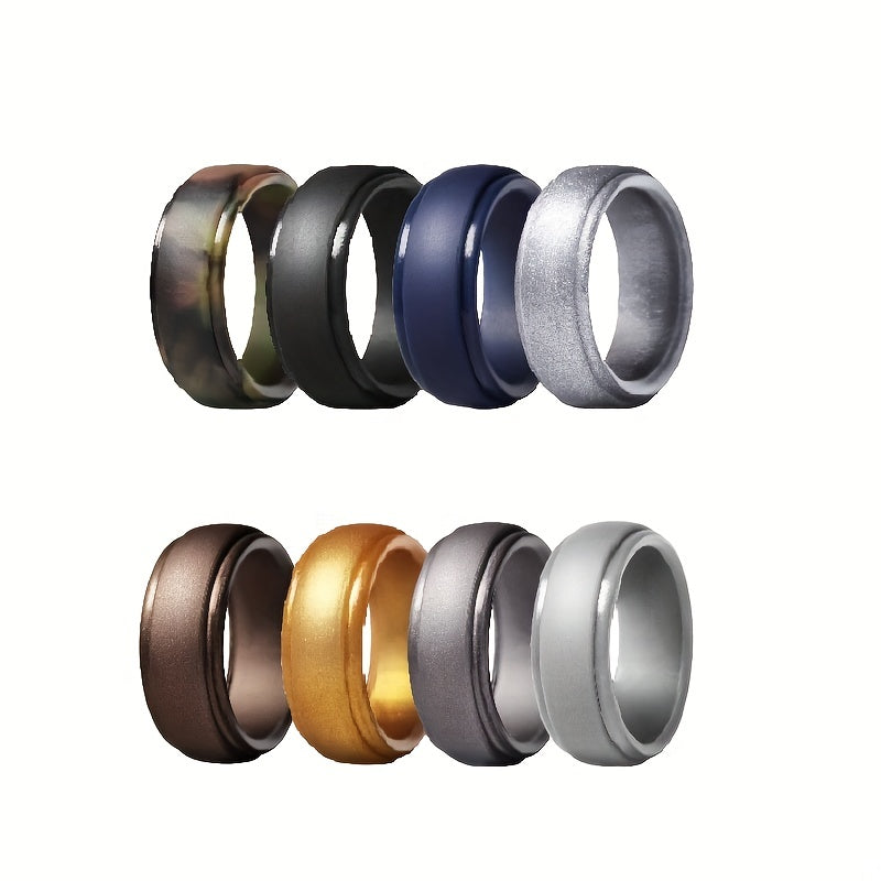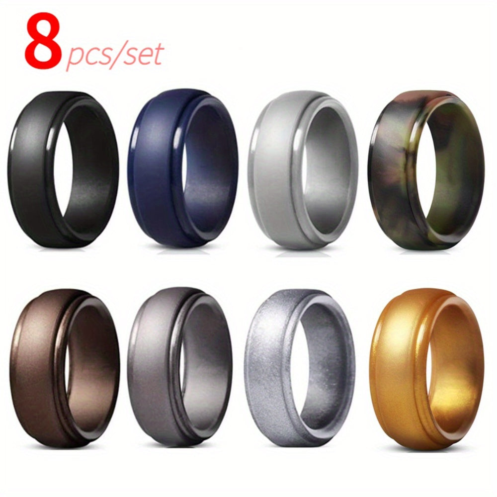 This set includes 8 silicone wedding rings for men. Perfect for active lifestyles, these rubber bands are durable, comfortable, and safe.