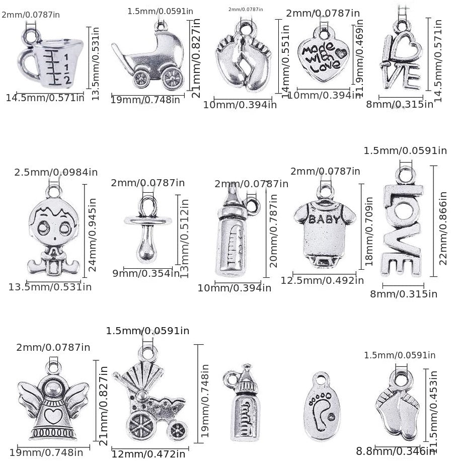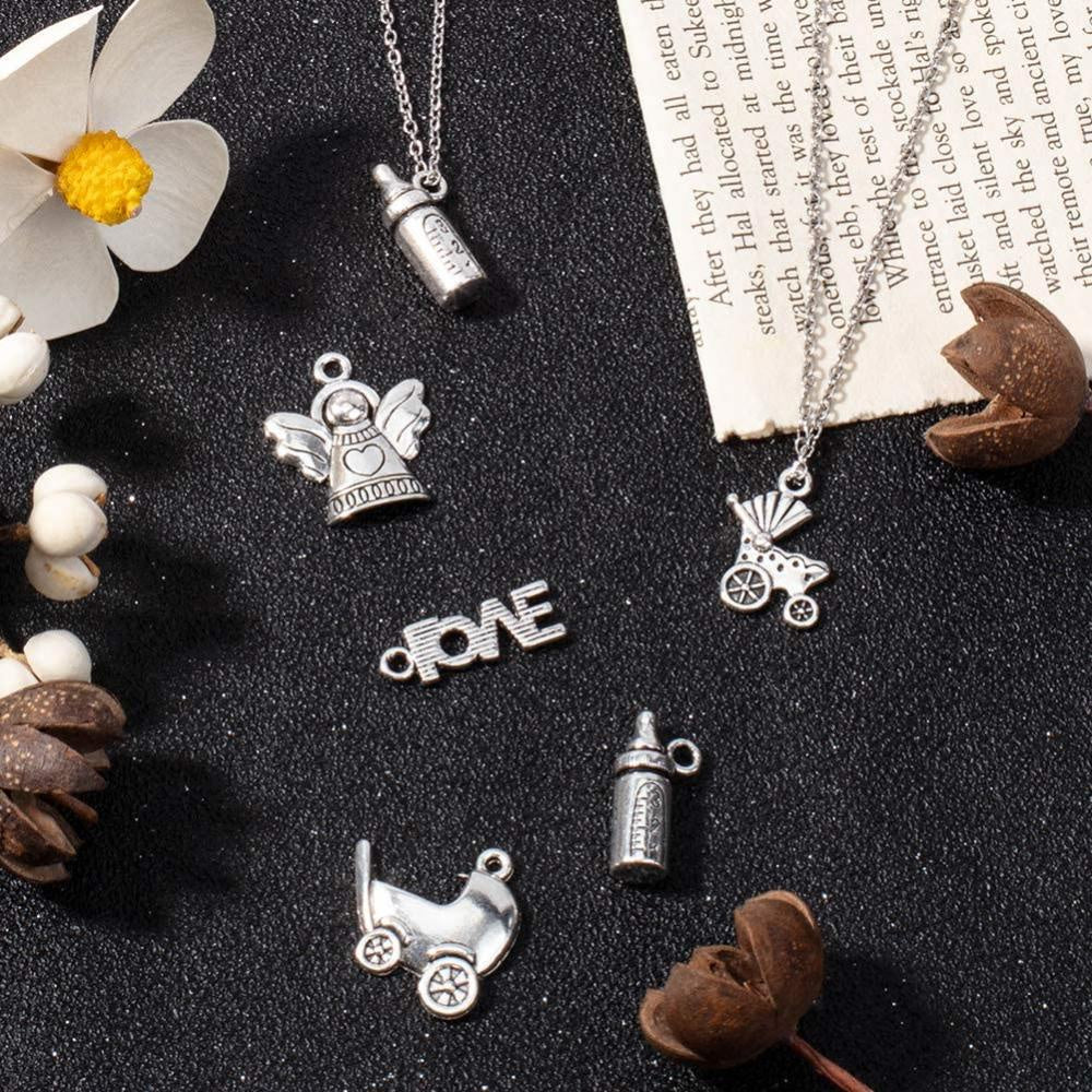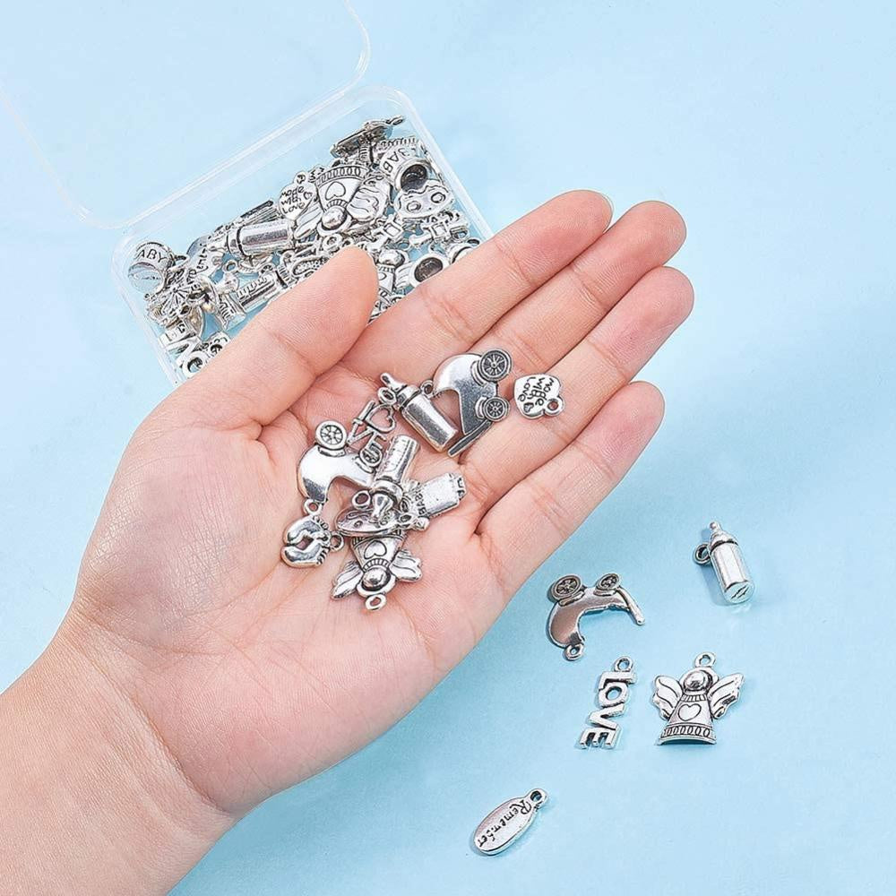 Enhance your creativity with this set of 90 antique silver alloy pendants and charms, perfect for earrings, bracelets, necklaces, and more. Ideal for baby birth and christening themed projects.