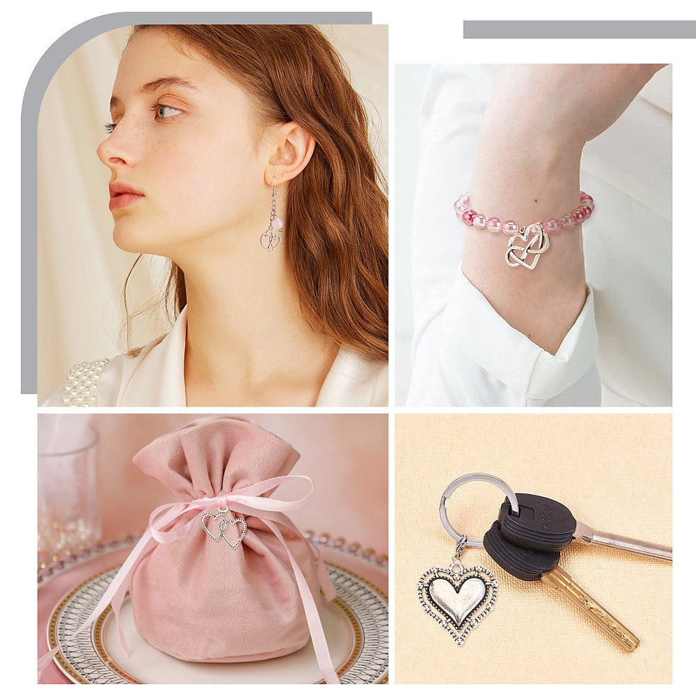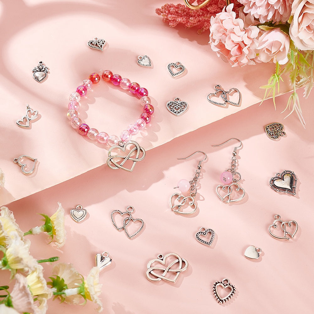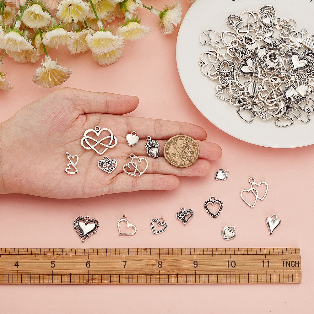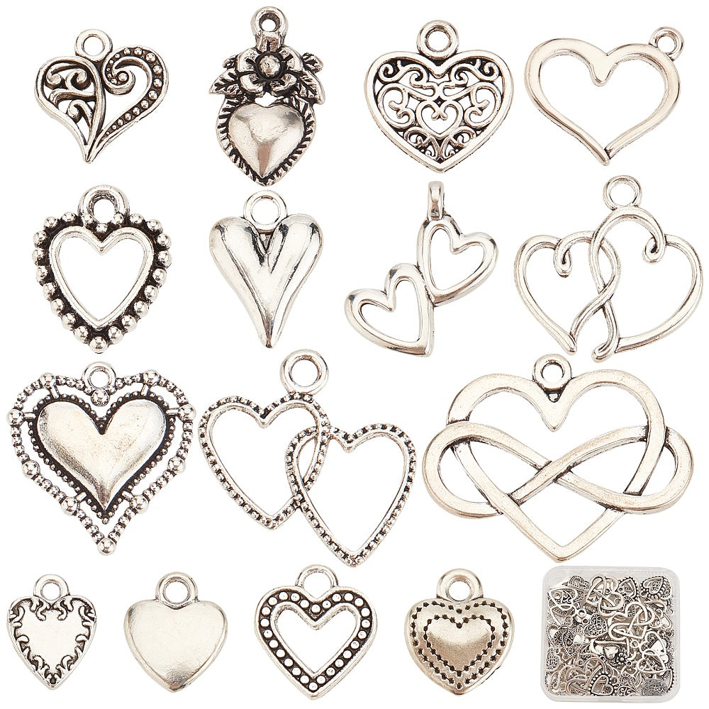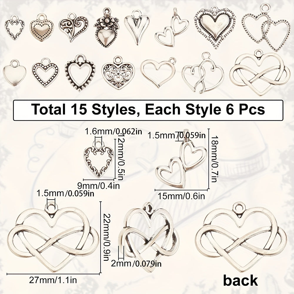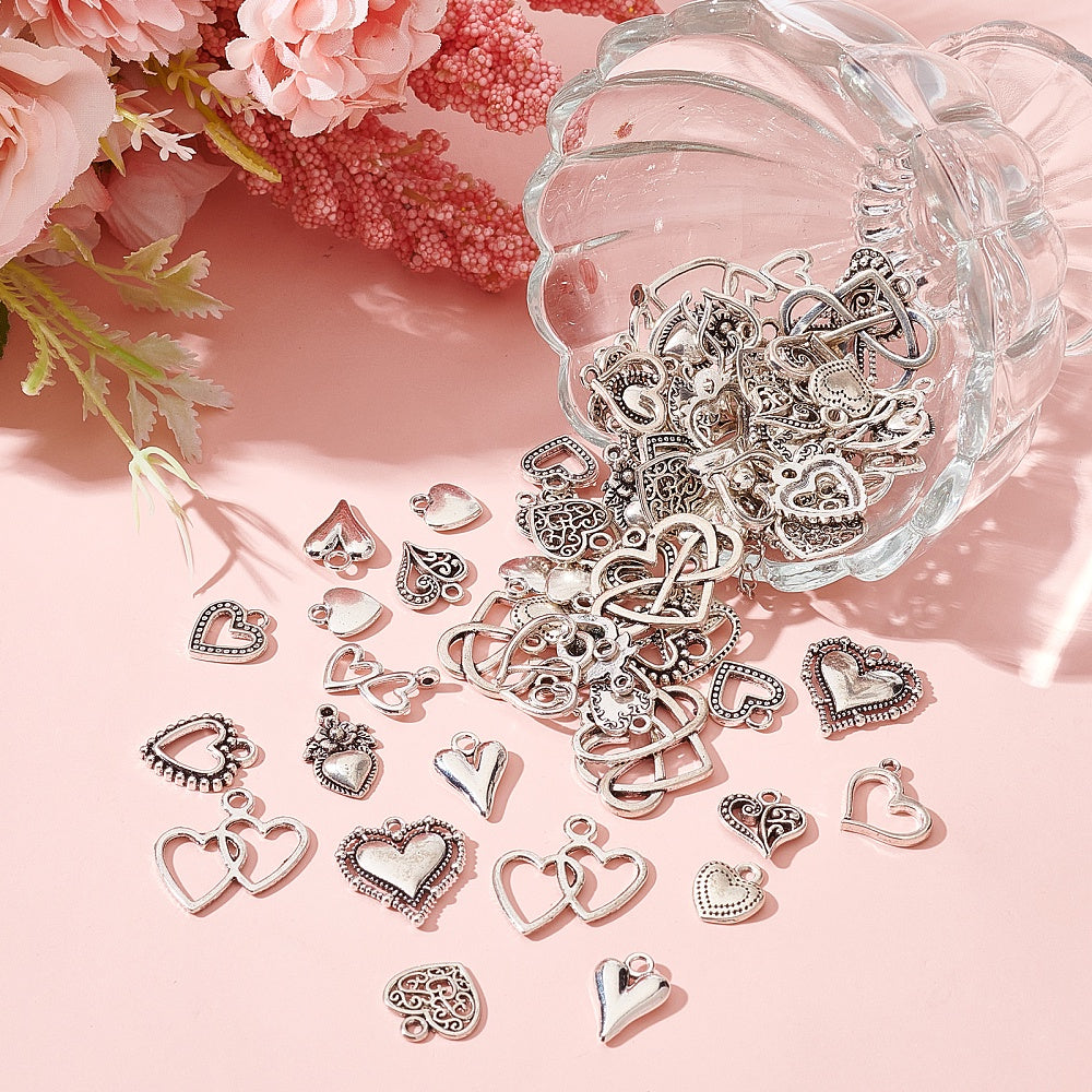 This box contains 90 pieces of assorted silvery heart alloy pendants, perfect for jewelry making and wedding charms. Each pendant has a romantic and elegant design.
