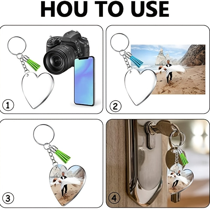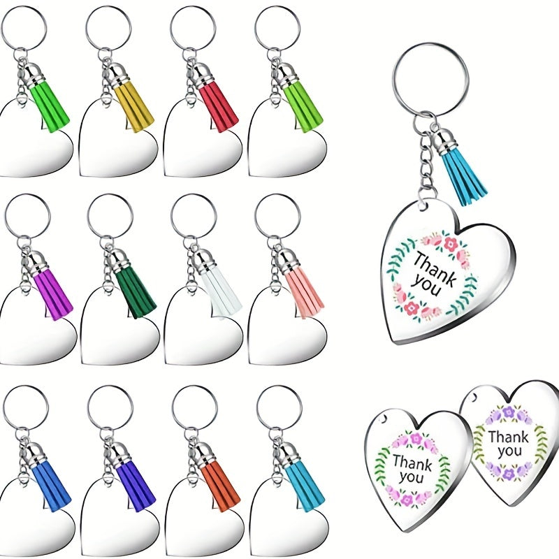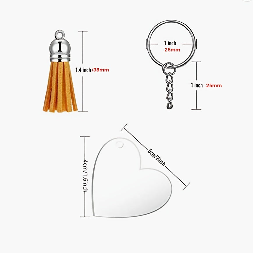 Acrylic keychain blanks with colorful tassel pendants for making personalized jewelry. These transparent clear charms are perfect for crafting projects.