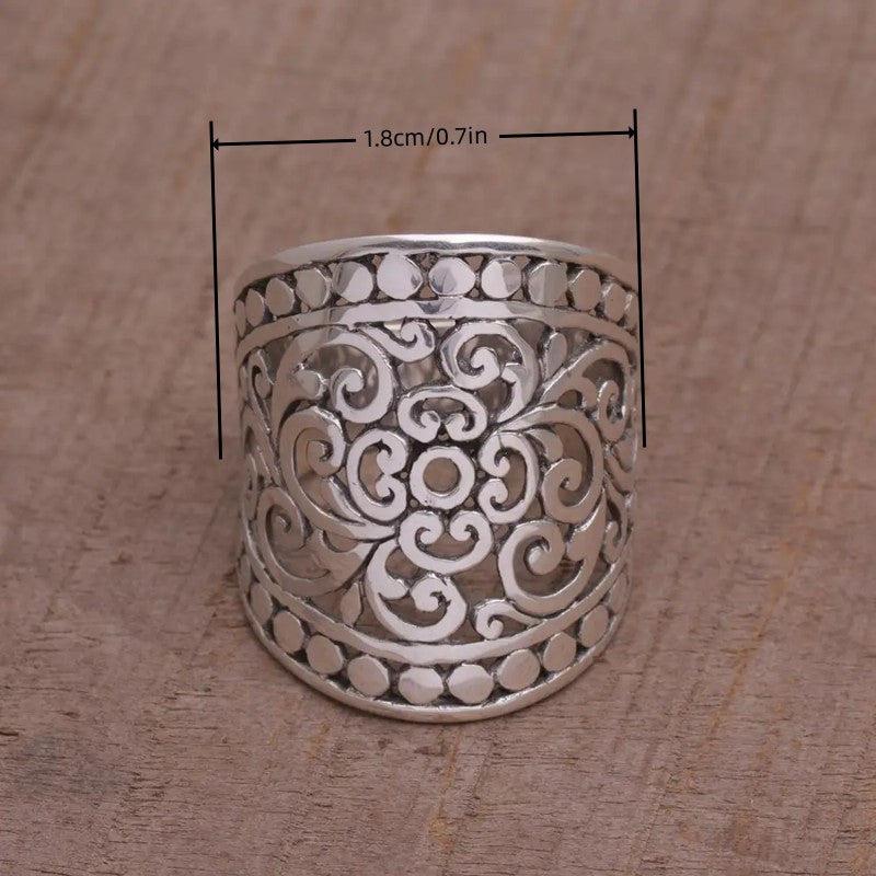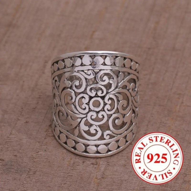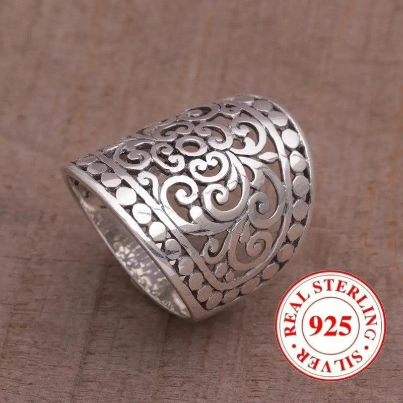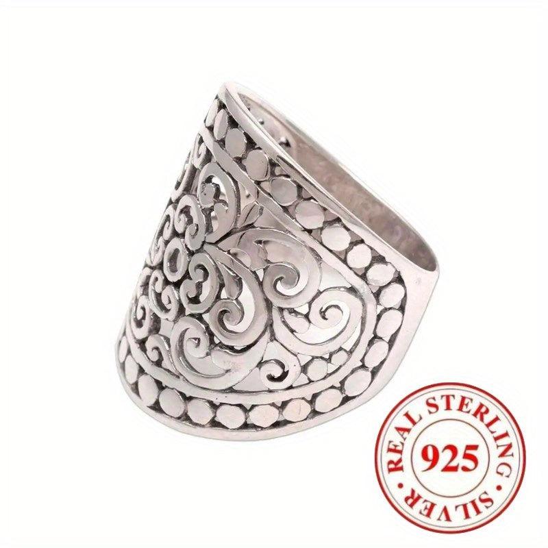 This 925 pure silvery ring features a retro bohemian design with a wide band and intricate carving. It's the perfect accessory for daily wear or special occasions.